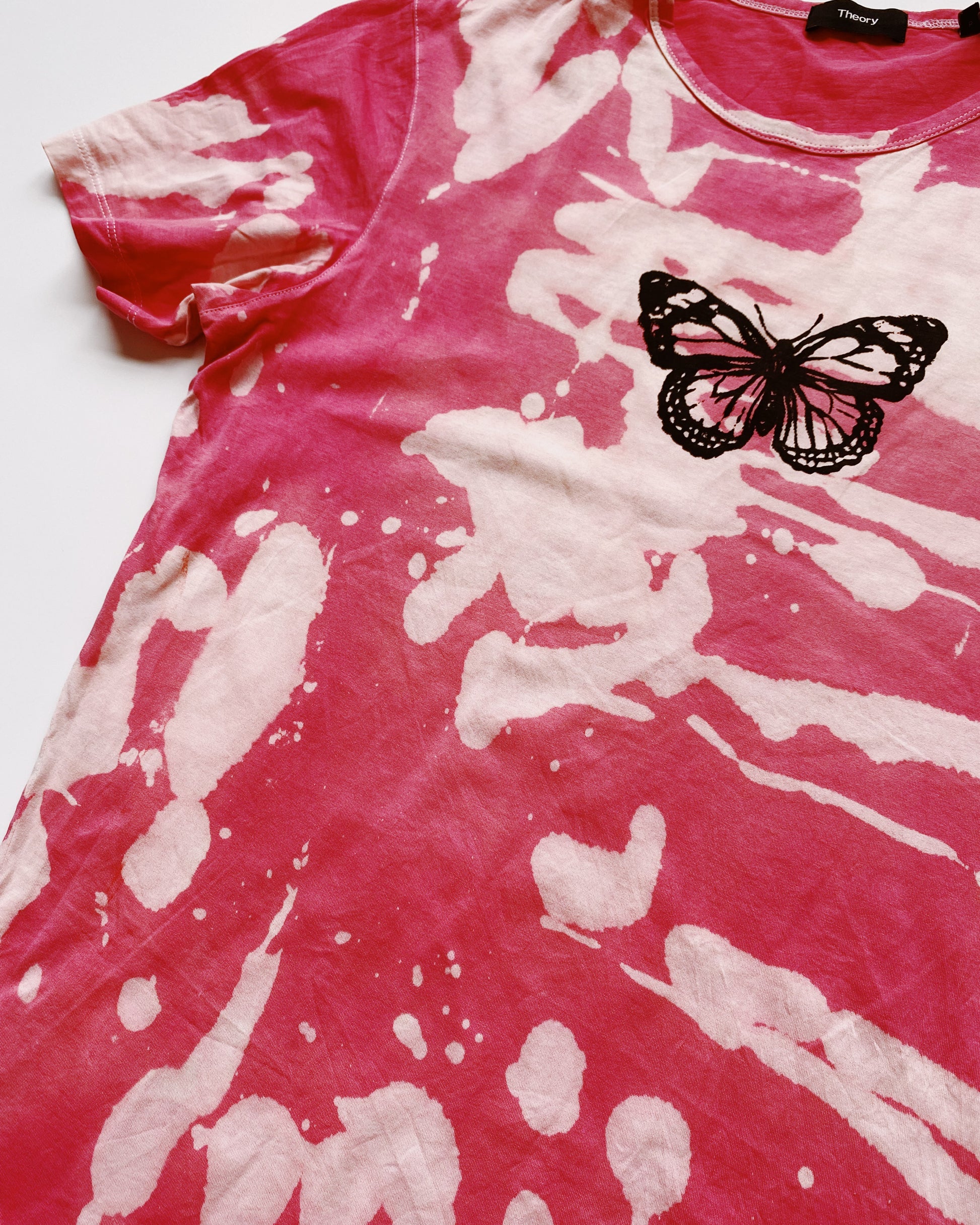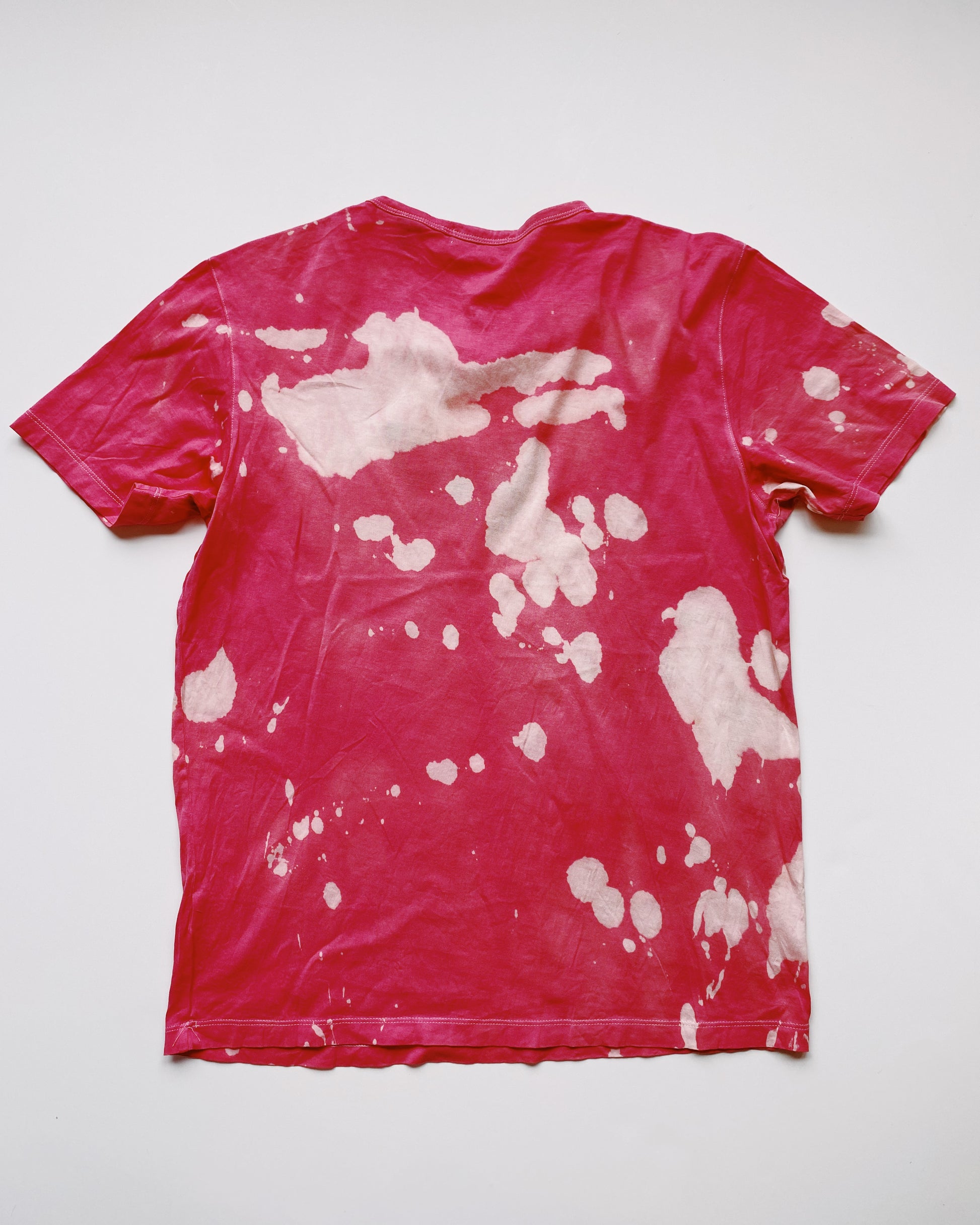 secondhand crewneck tee dyed pink with a bleached design. size S