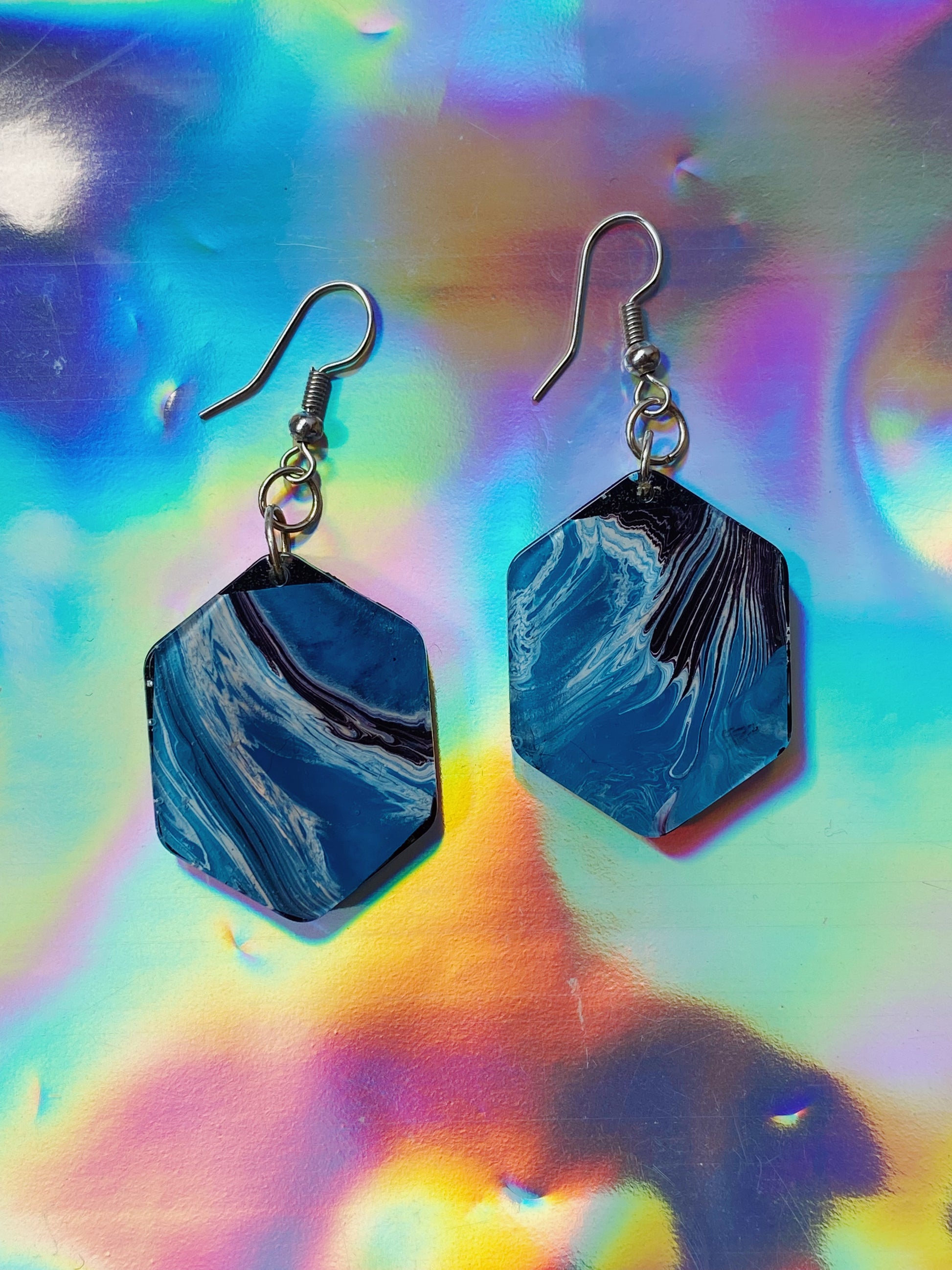 one of a kind earrings made from resin and leftover paint chips from my palette. iron details, lightweight.