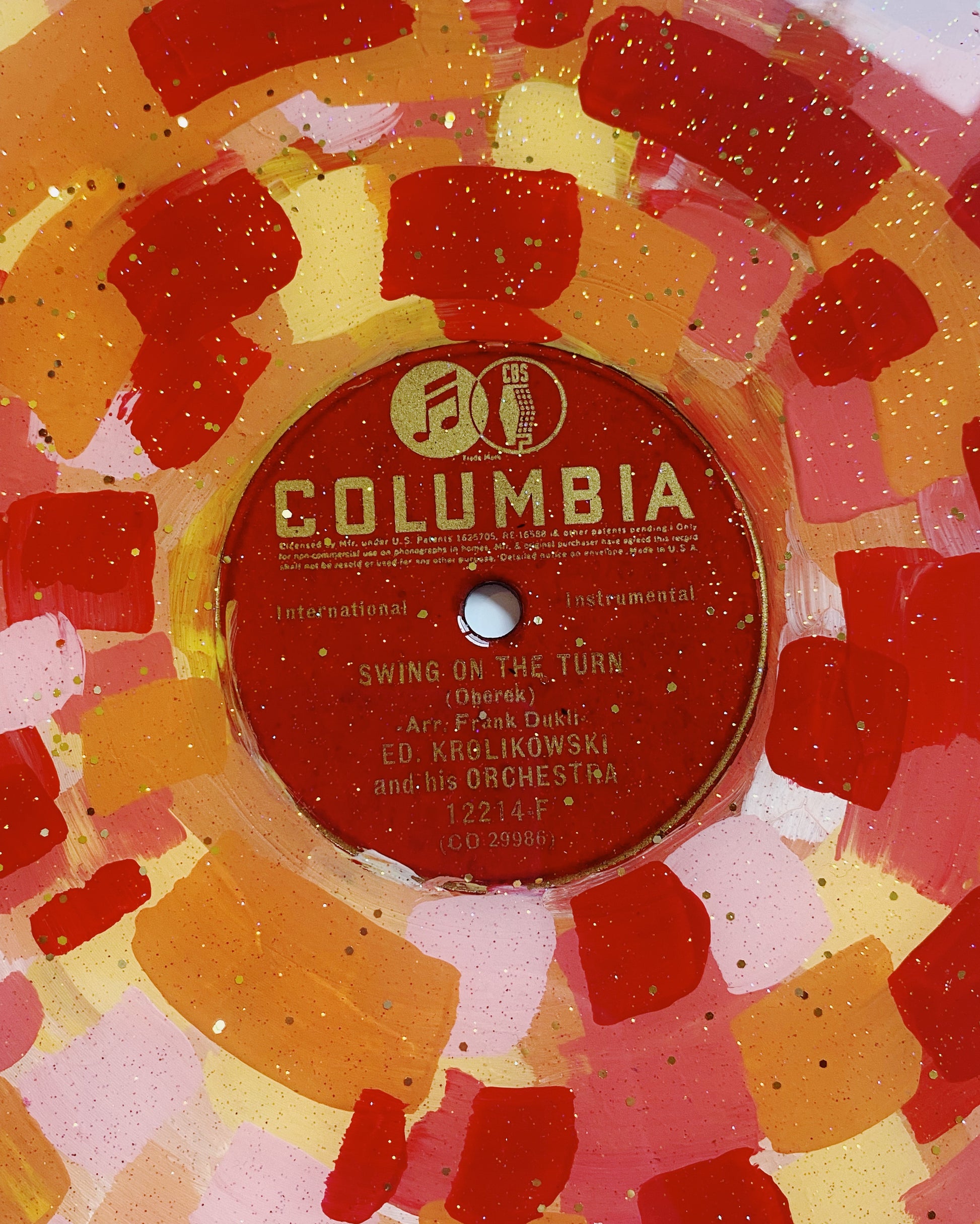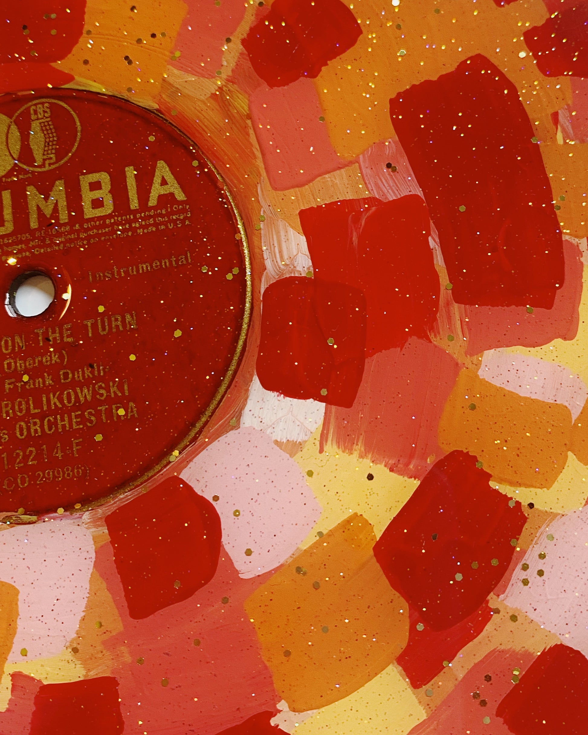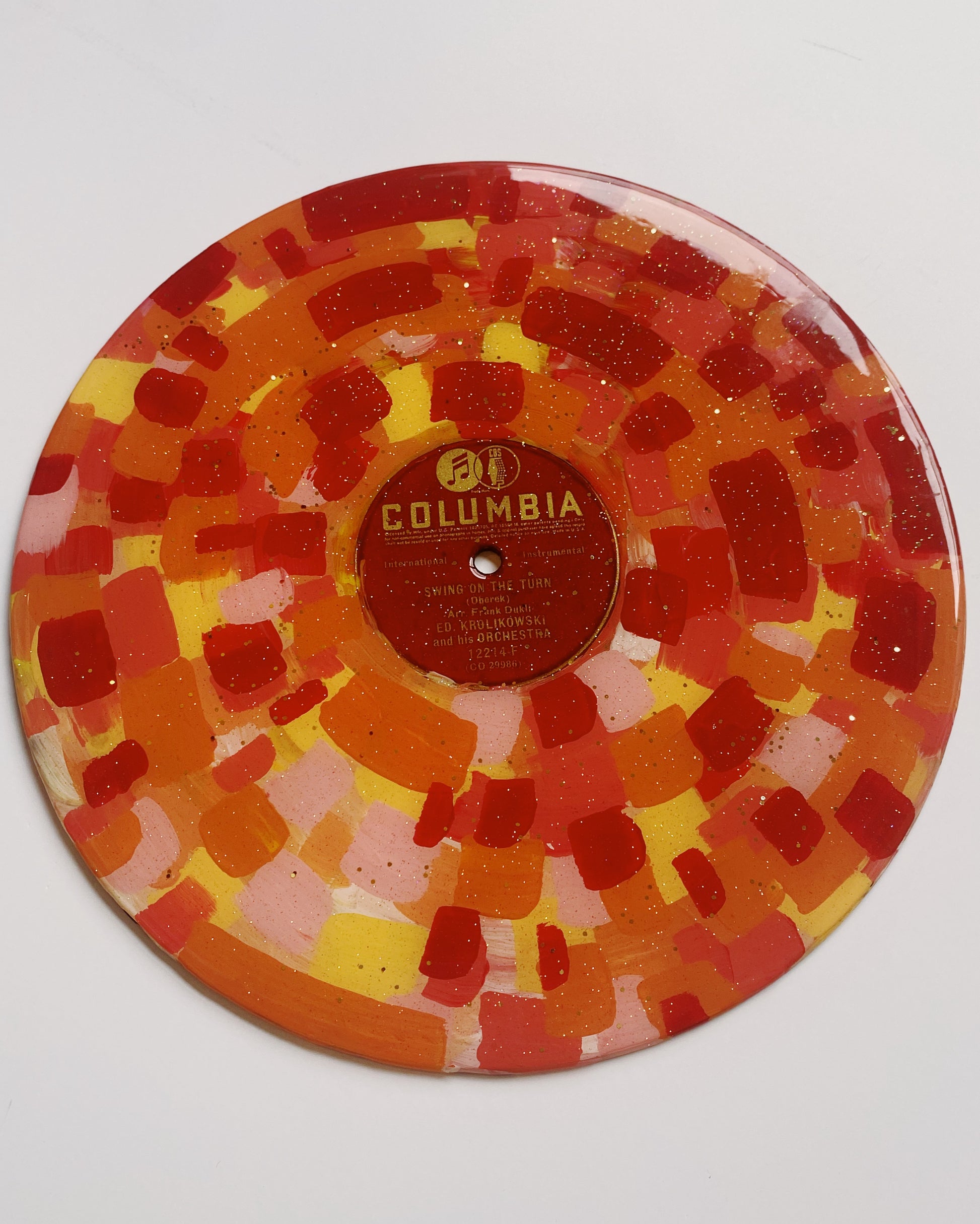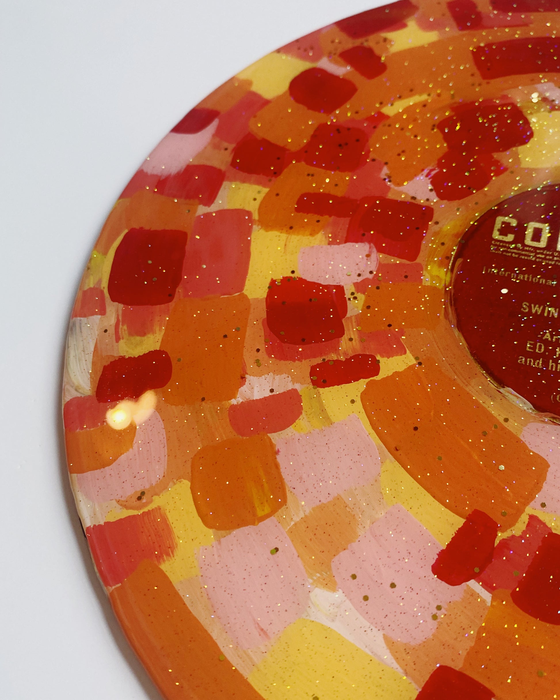 this unique piece is an acrylic painted upcycled vinyl record (a 78!) is sealed in a shimmery resin. the mirror-like shine of the resin surface will keep this piece protected while also giving it a brilliant, glossy finish!