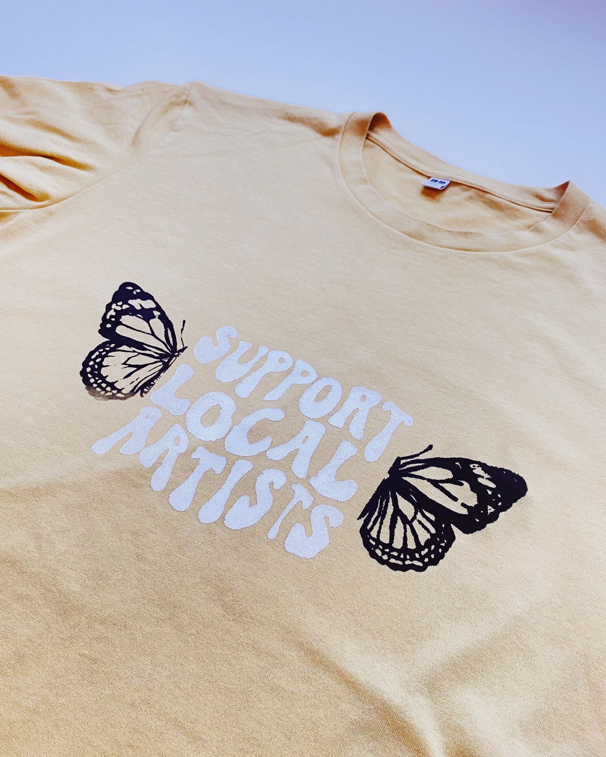 featuring an original screenprinted “support local artists” and butterfly wing design.