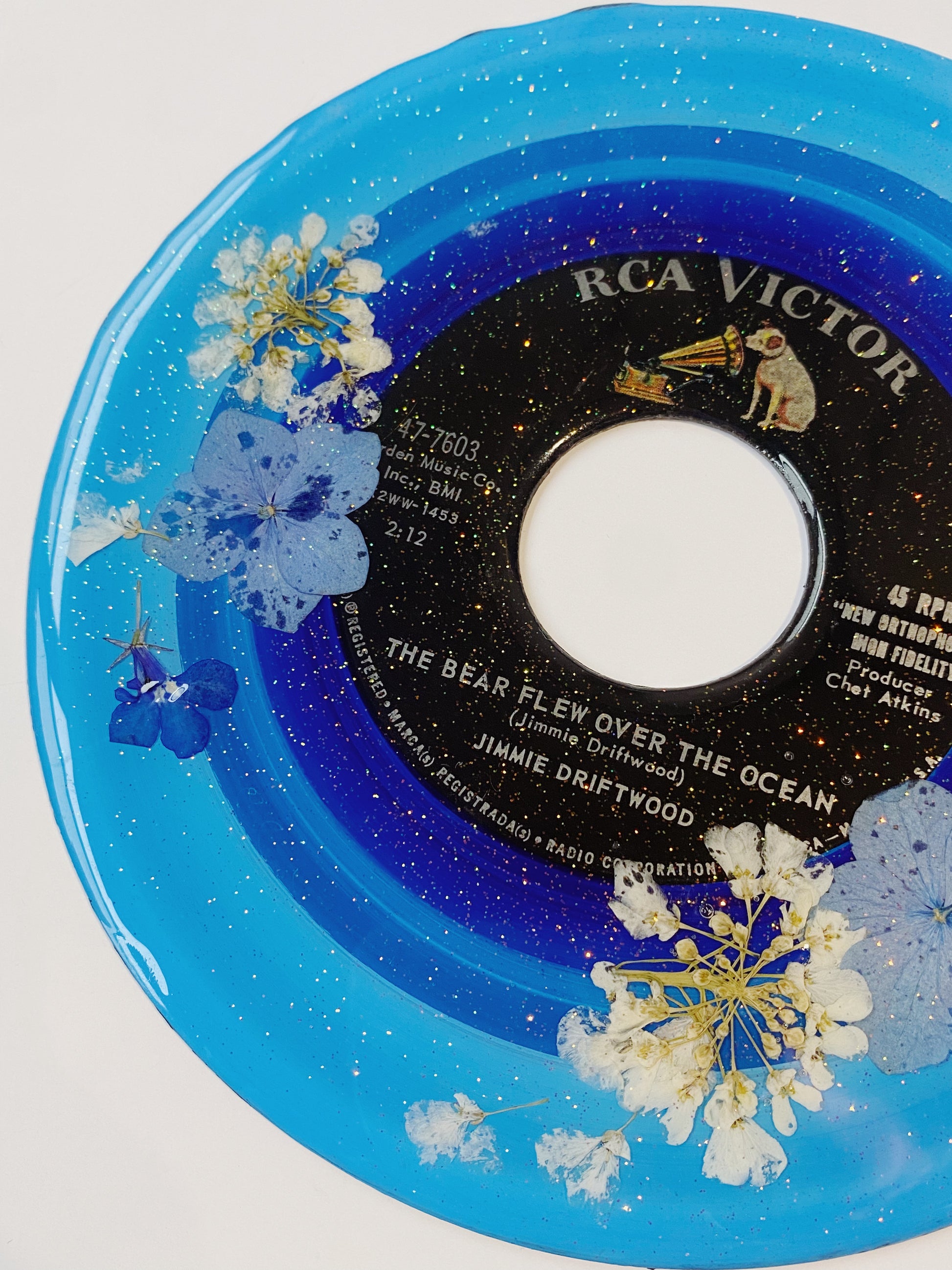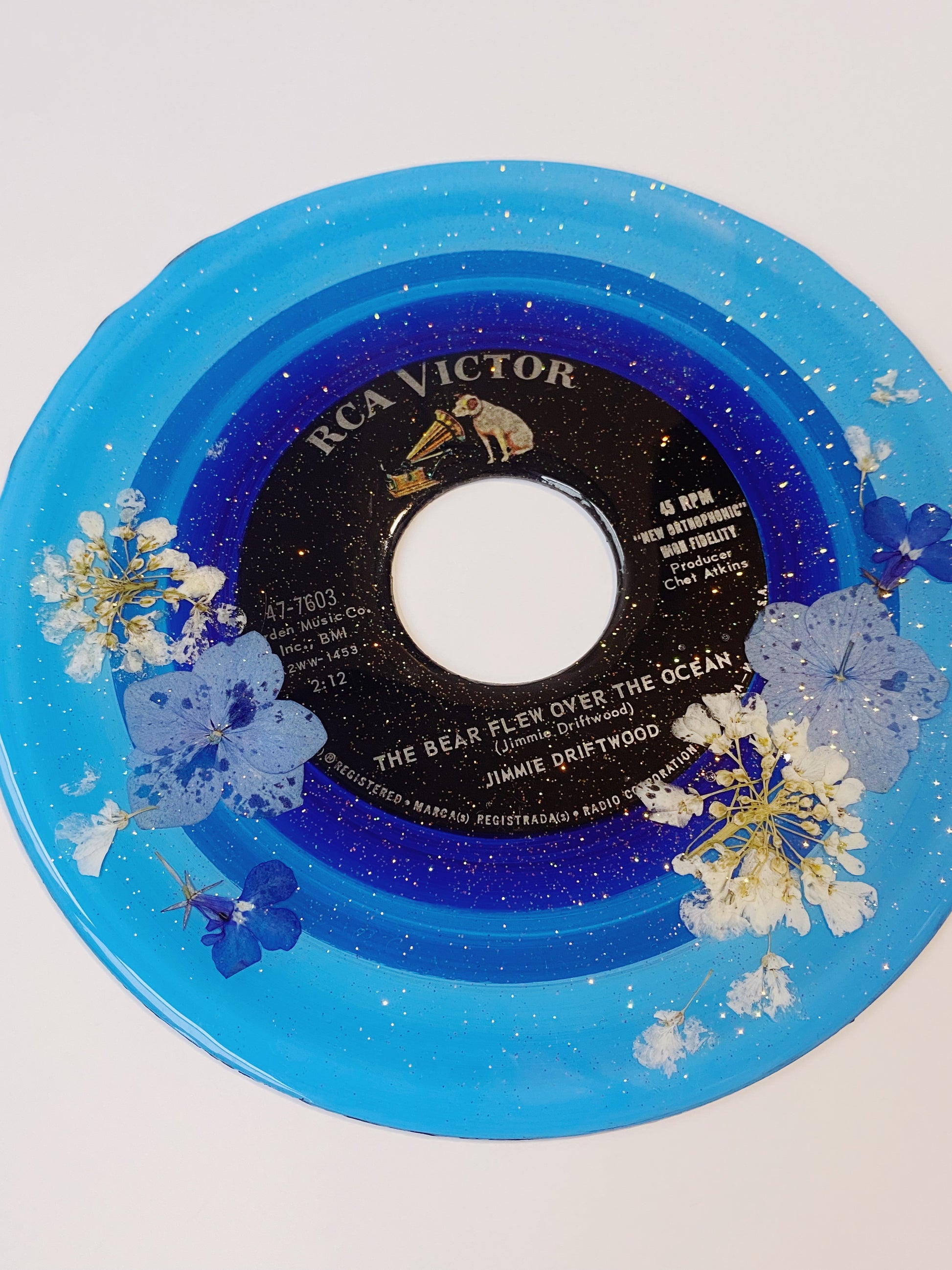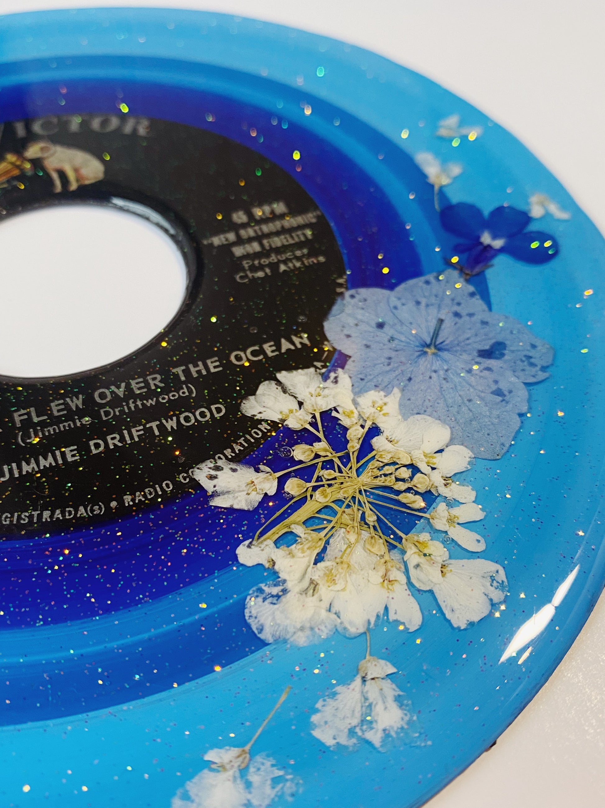 this unique piece is a painted upcycled vinyl record (a 45!) decorated with real pressed flowers and sealed in a shimmery resin. the mirror-like shine of the resin surface will keep this piece protected while also giving it a brilliant, glossy finish!