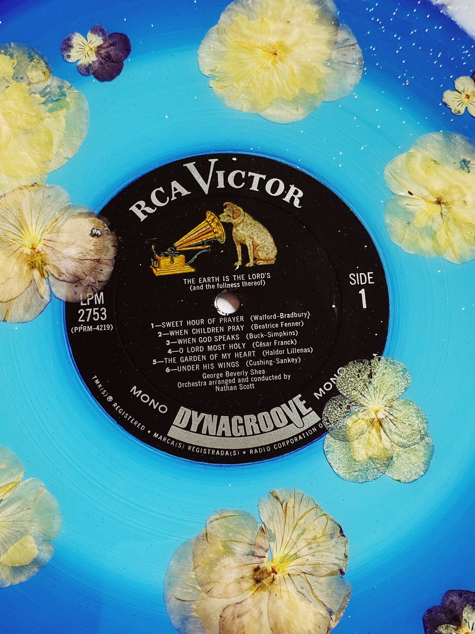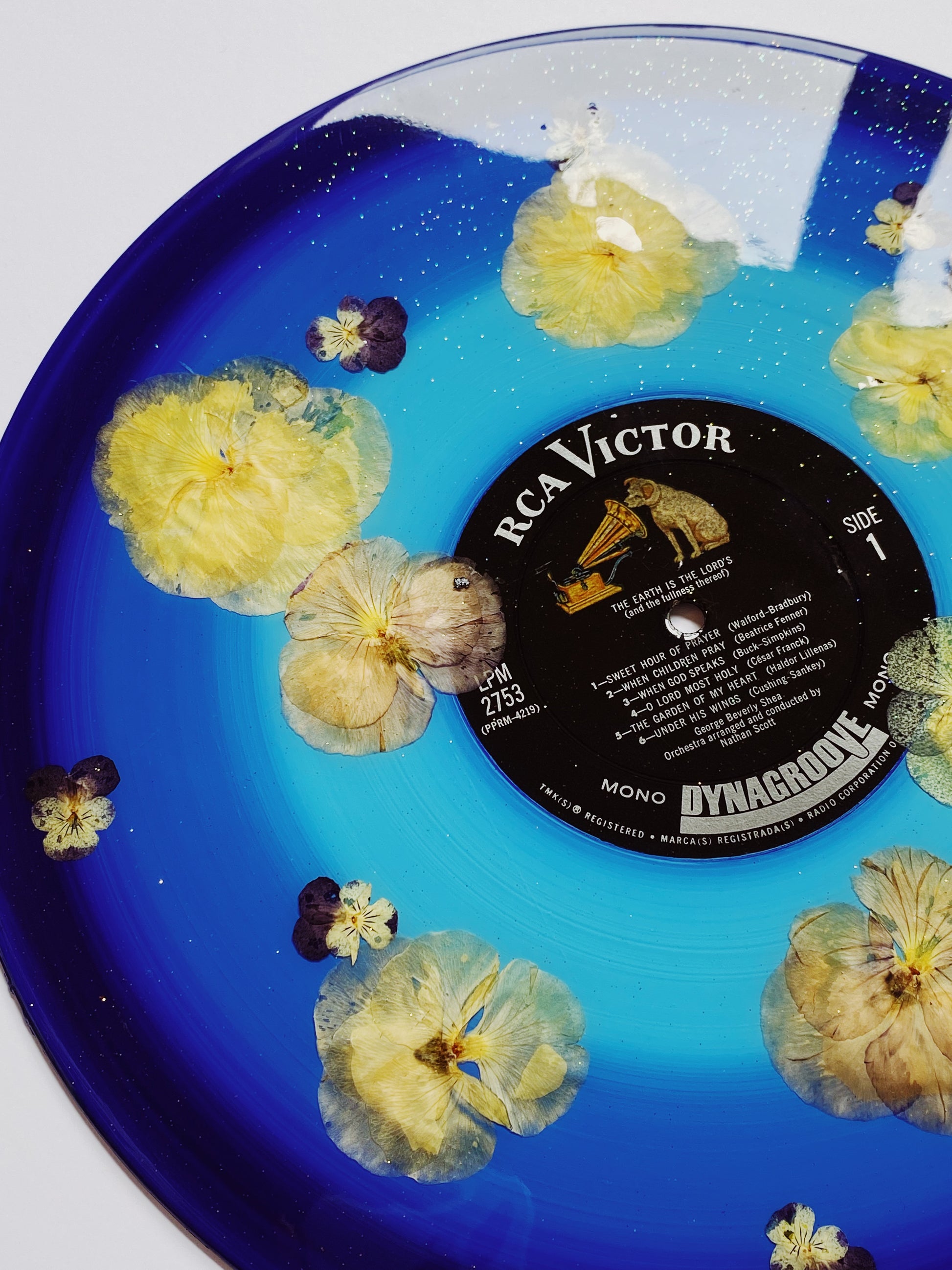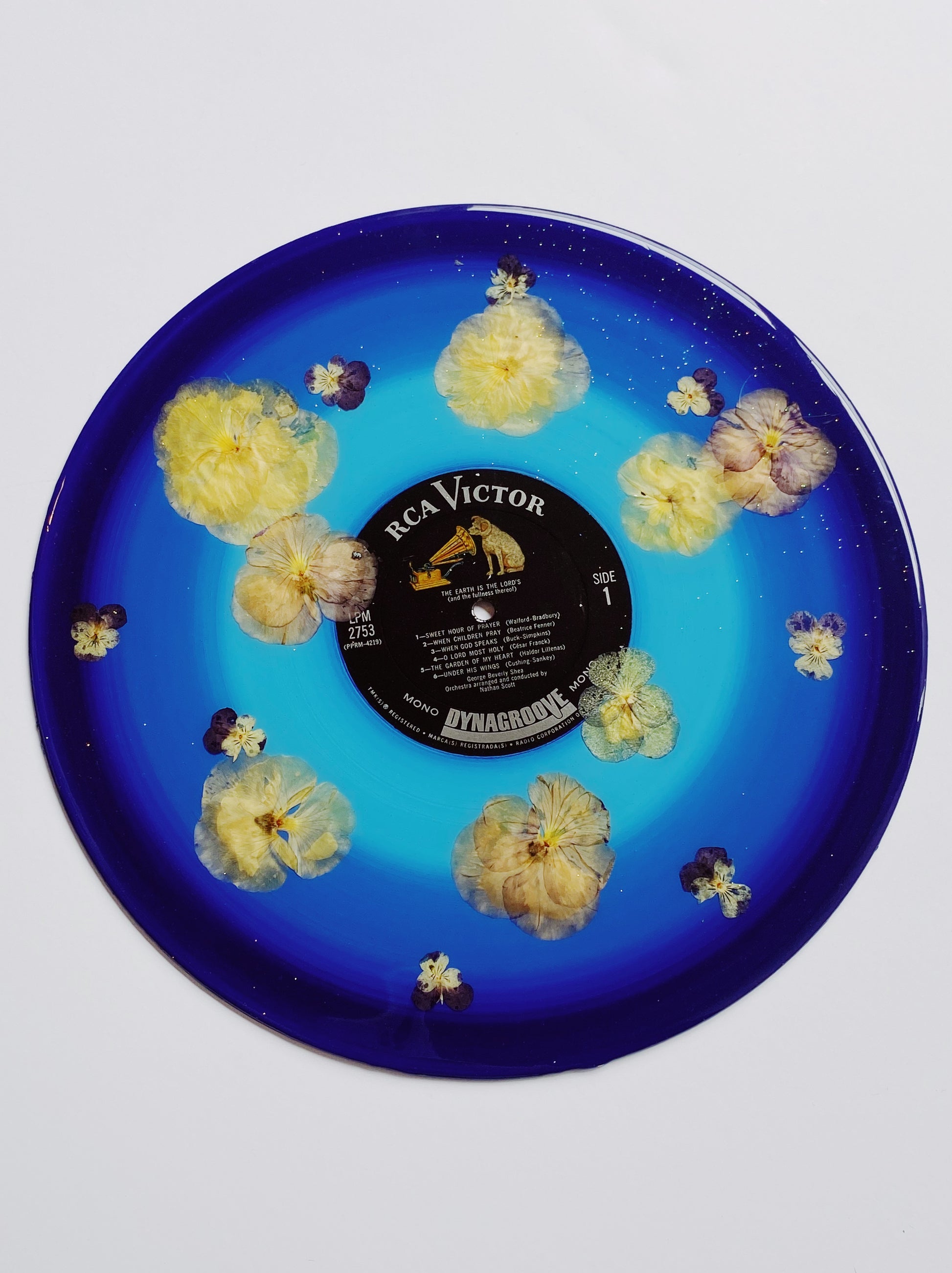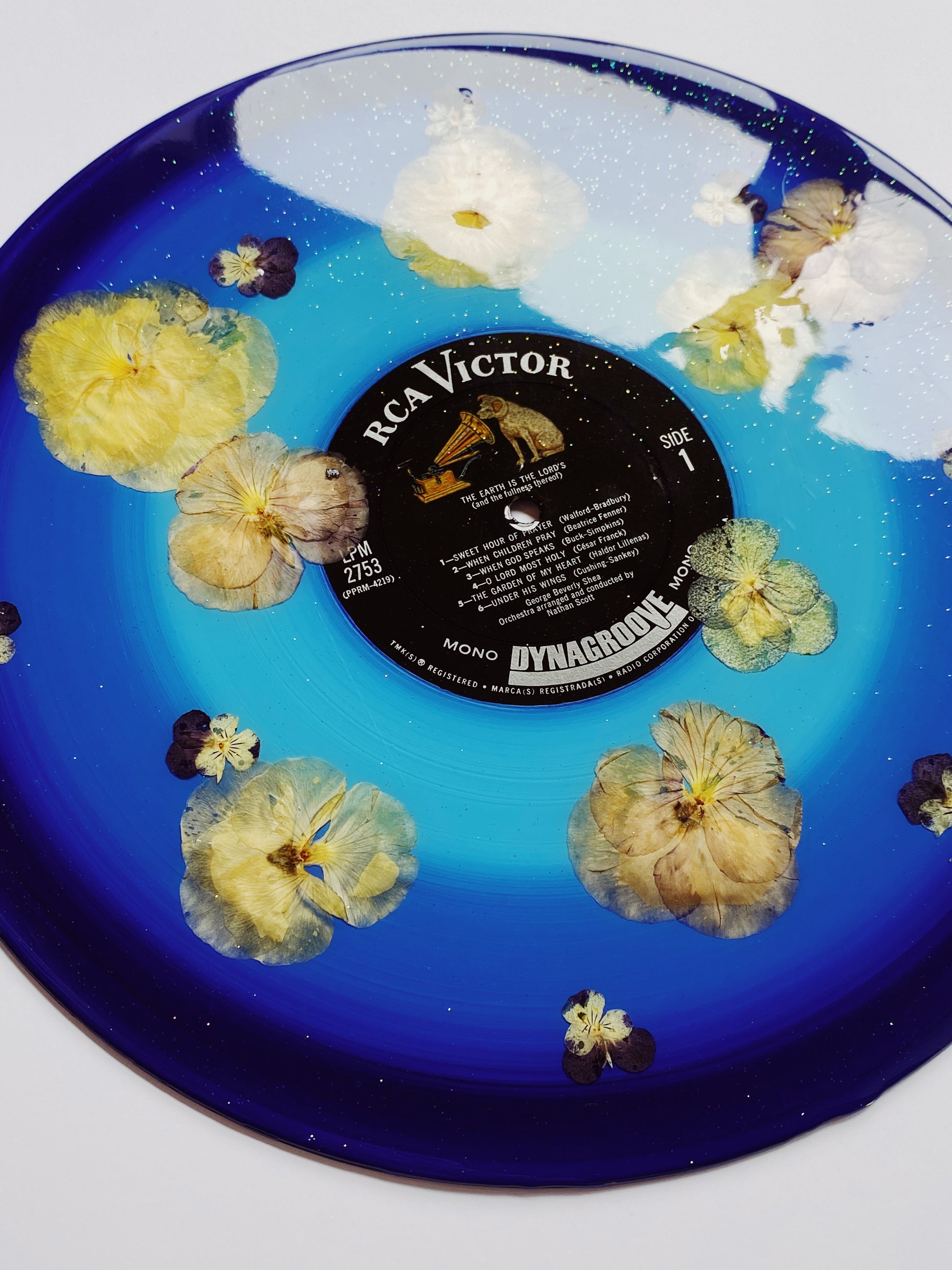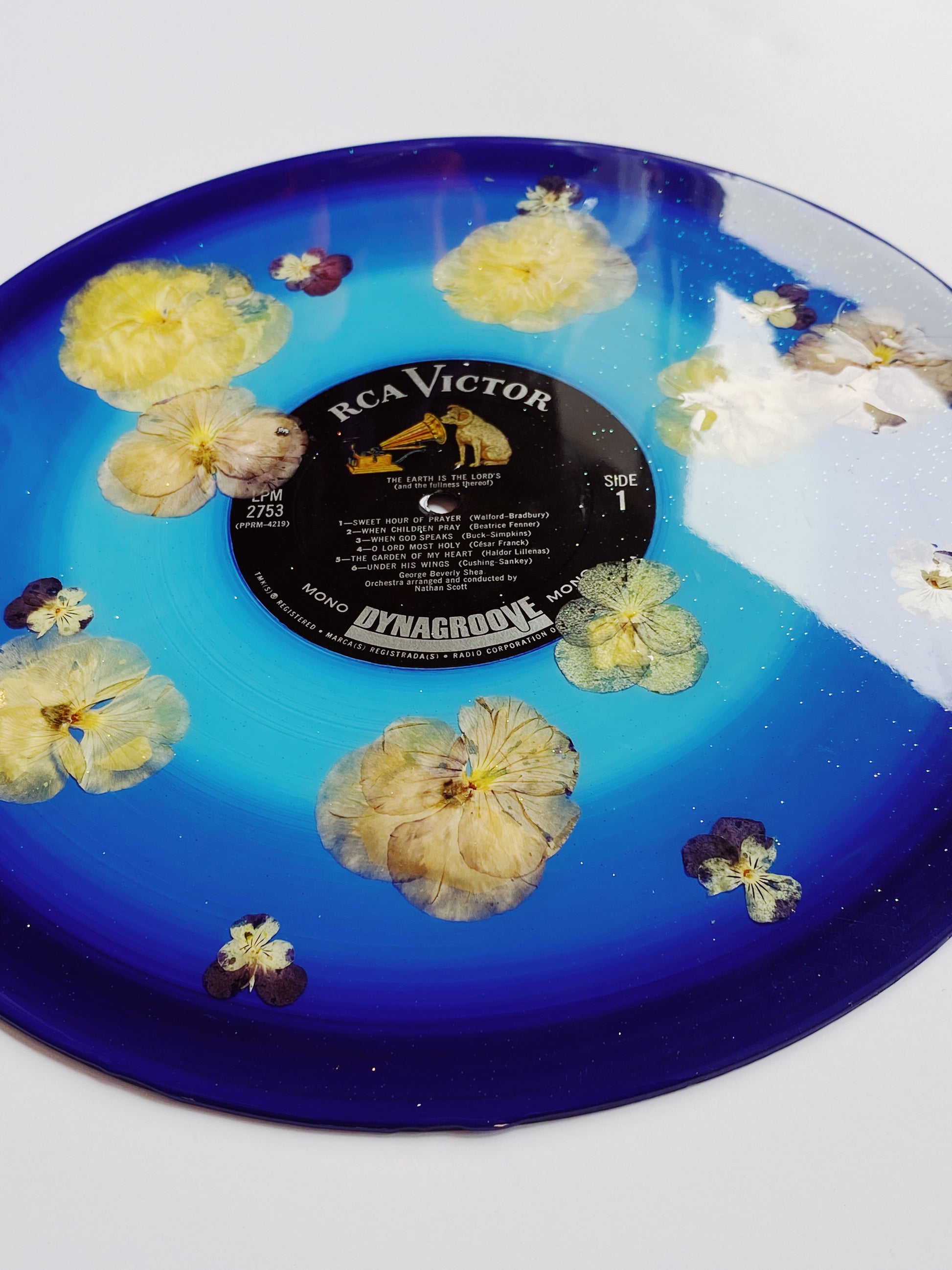 this unique piece is an acrylic painted upcycled vinyl record (a 33!) with real pressed flowers sealed in a shimmery resin. the mirror-like shine of the resin surface will keep this piece protected while also giving it a brilliant, glossy finish!