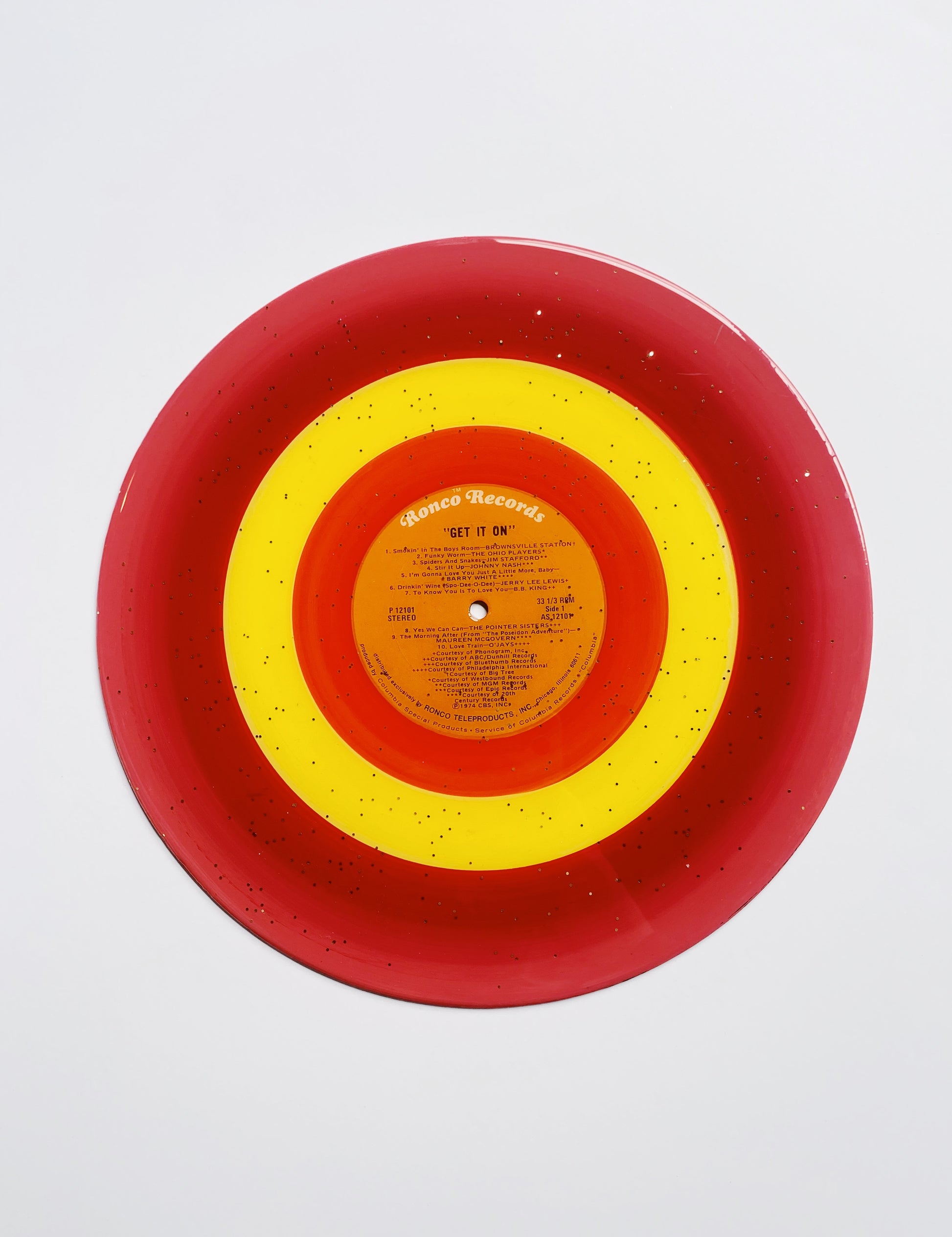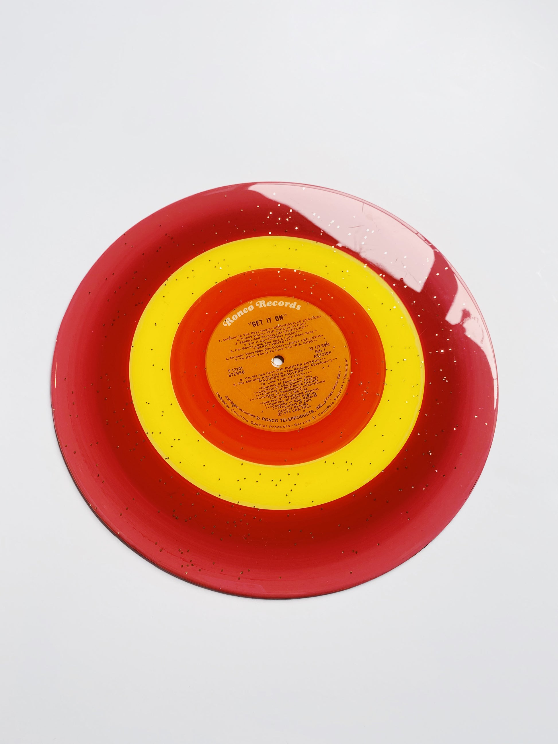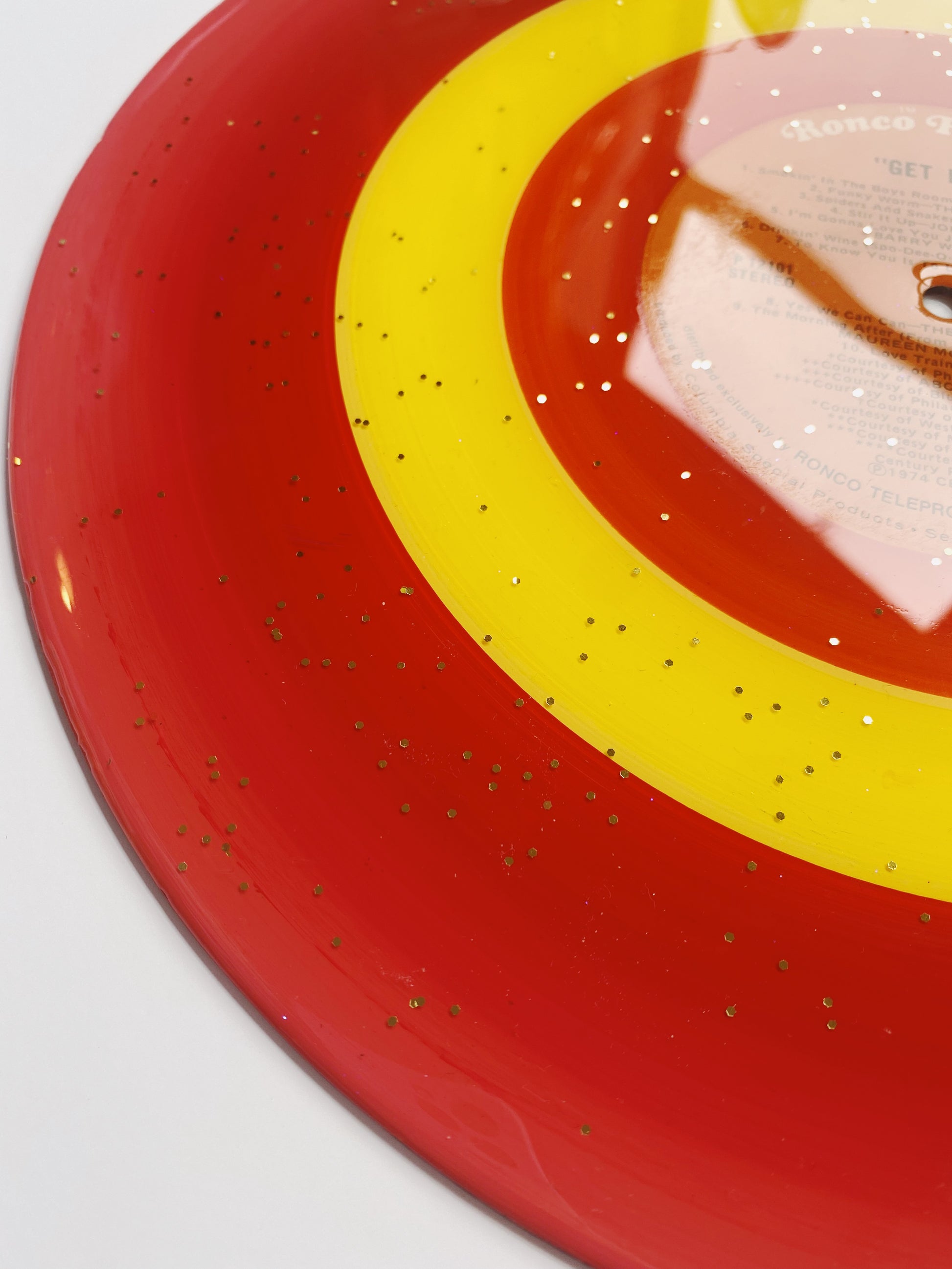 this unique piece is an acrylic painted upcycled vinyl record (a 33!) sealed in a shimmery resin. the mirror-like shine of the resin surface will keep this piece protected while also giving it a brilliant, glossy finish!