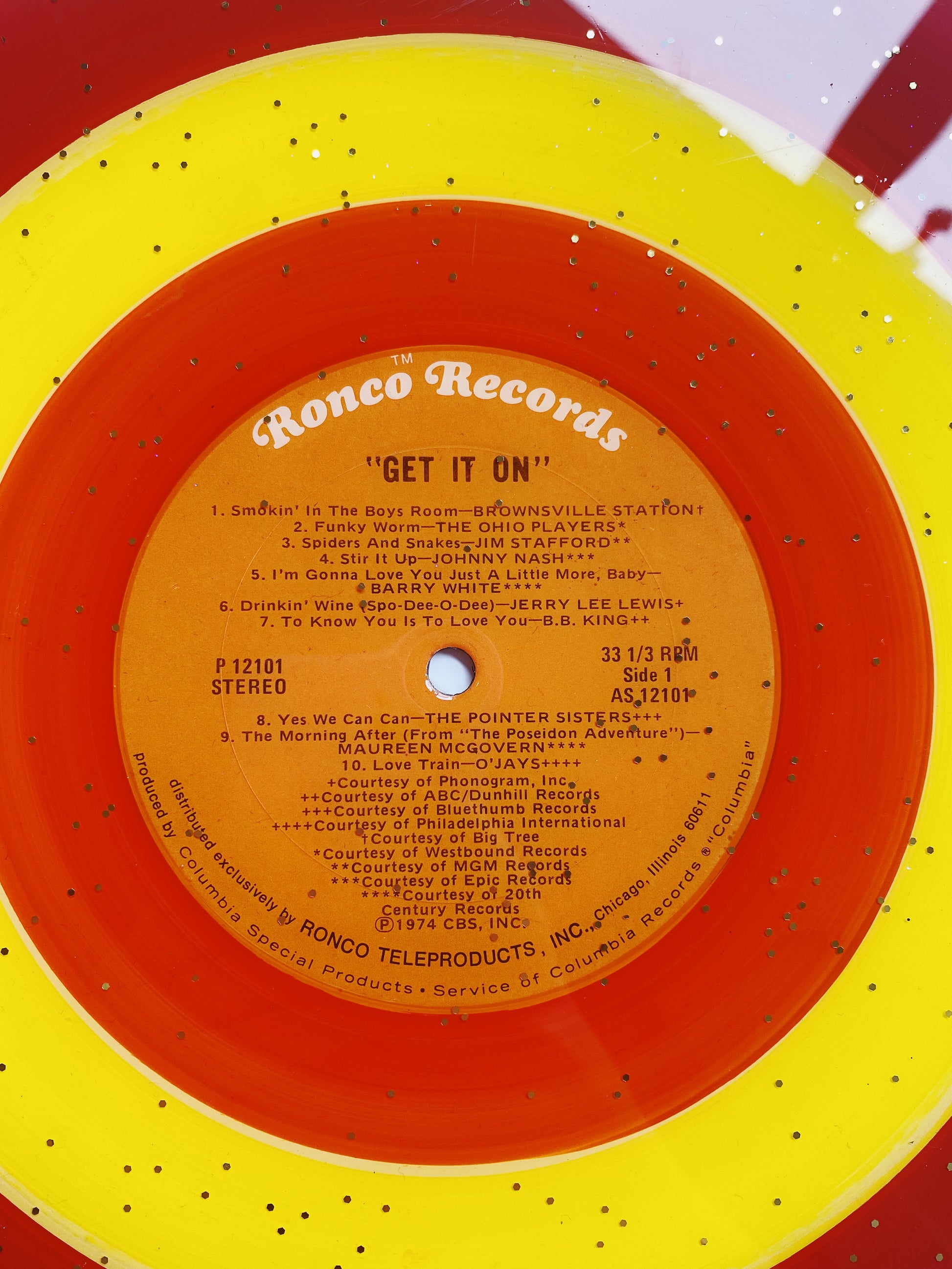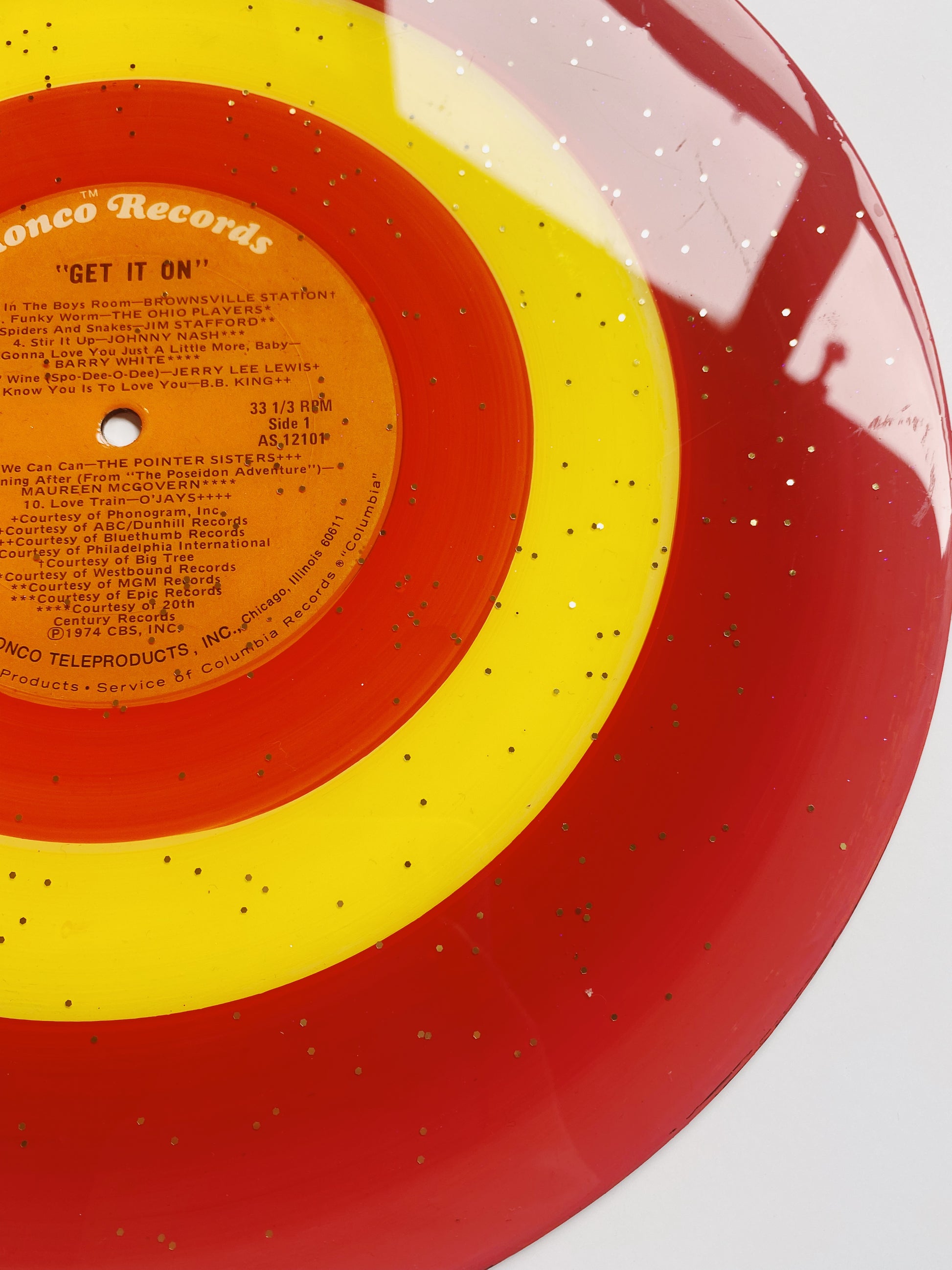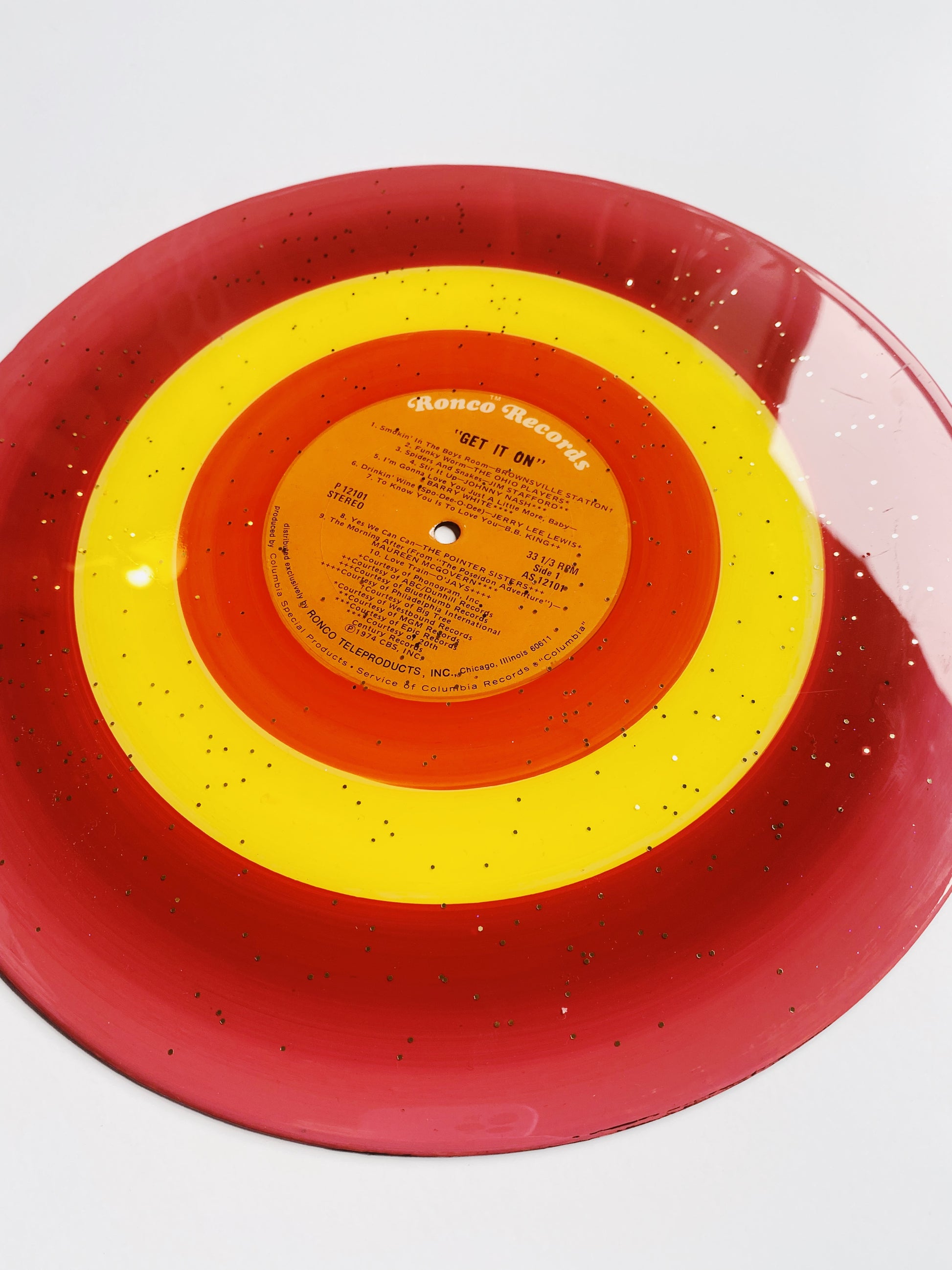 this unique piece is an acrylic painted upcycled vinyl record (a 33!) sealed in a shimmery resin. the mirror-like shine of the resin surface will keep this piece protected while also giving it a brilliant, glossy finish!