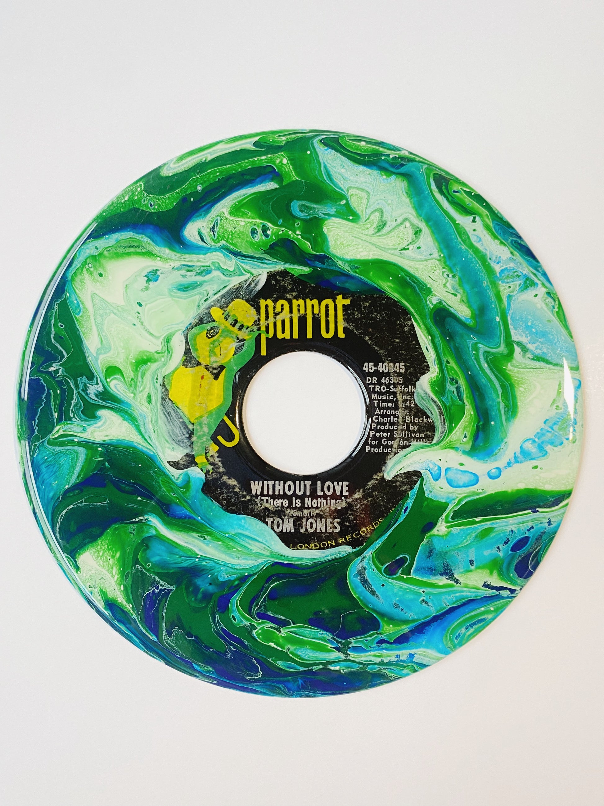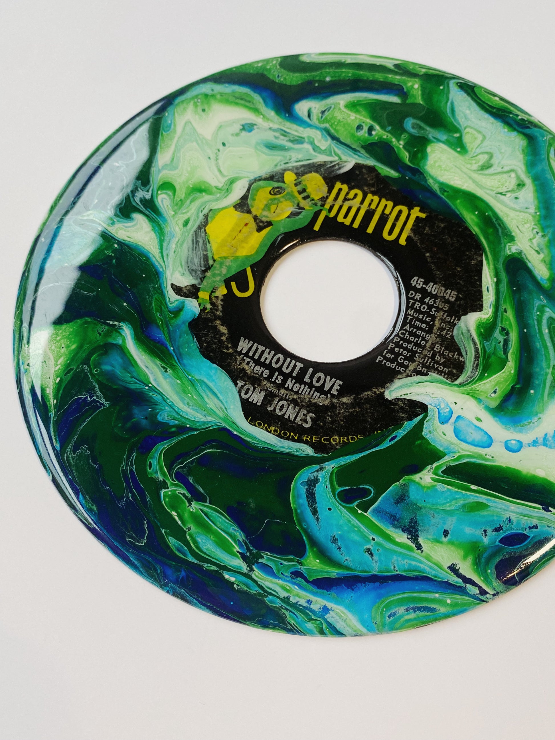 this unique piece is an acrylic pour painted upcycled vinyl record (a 45!) sealed in a shimmery resin. the mirror-like shine of the resin surface will keep this piece protected while also giving it a brilliant, glossy finish!