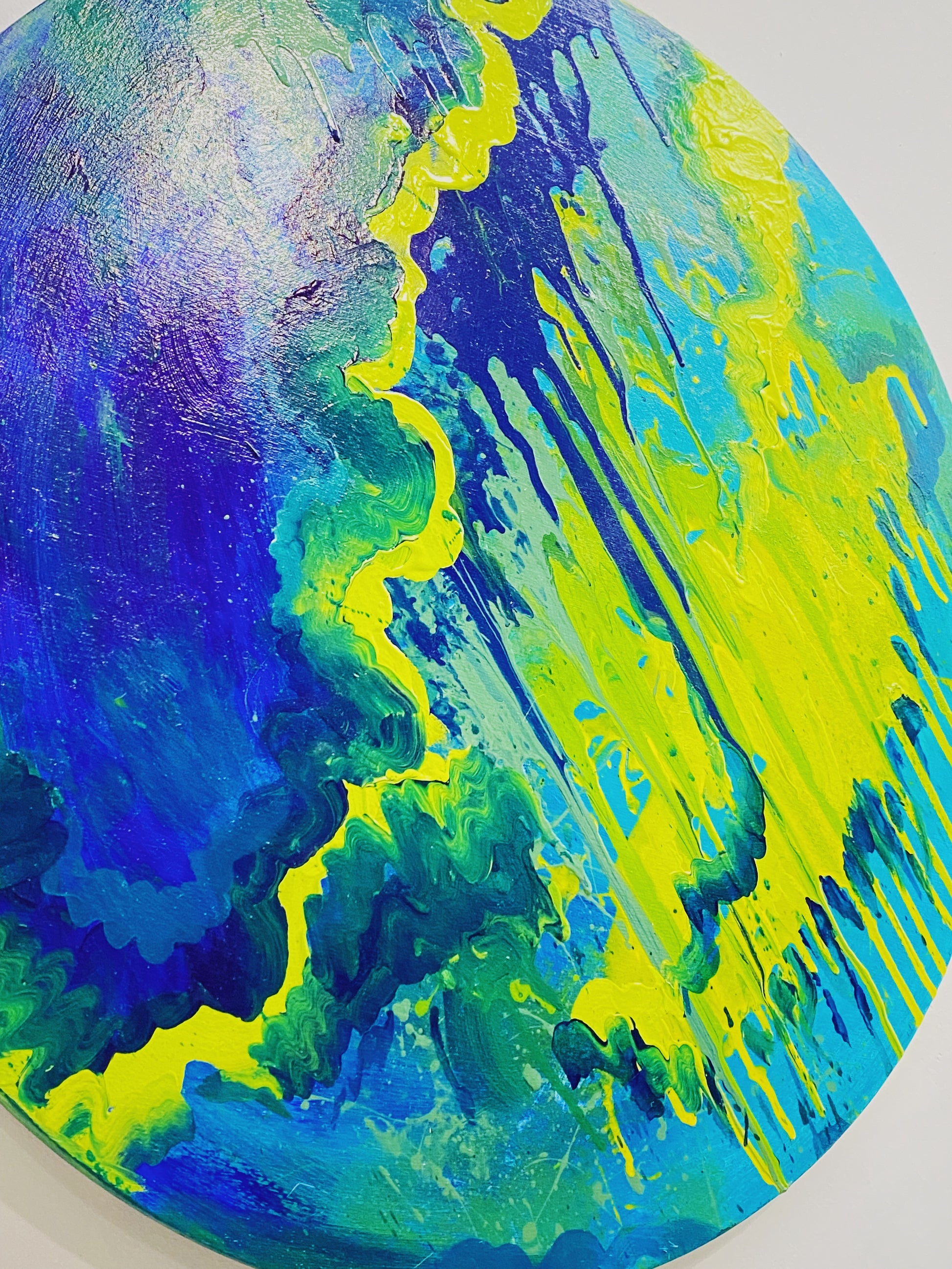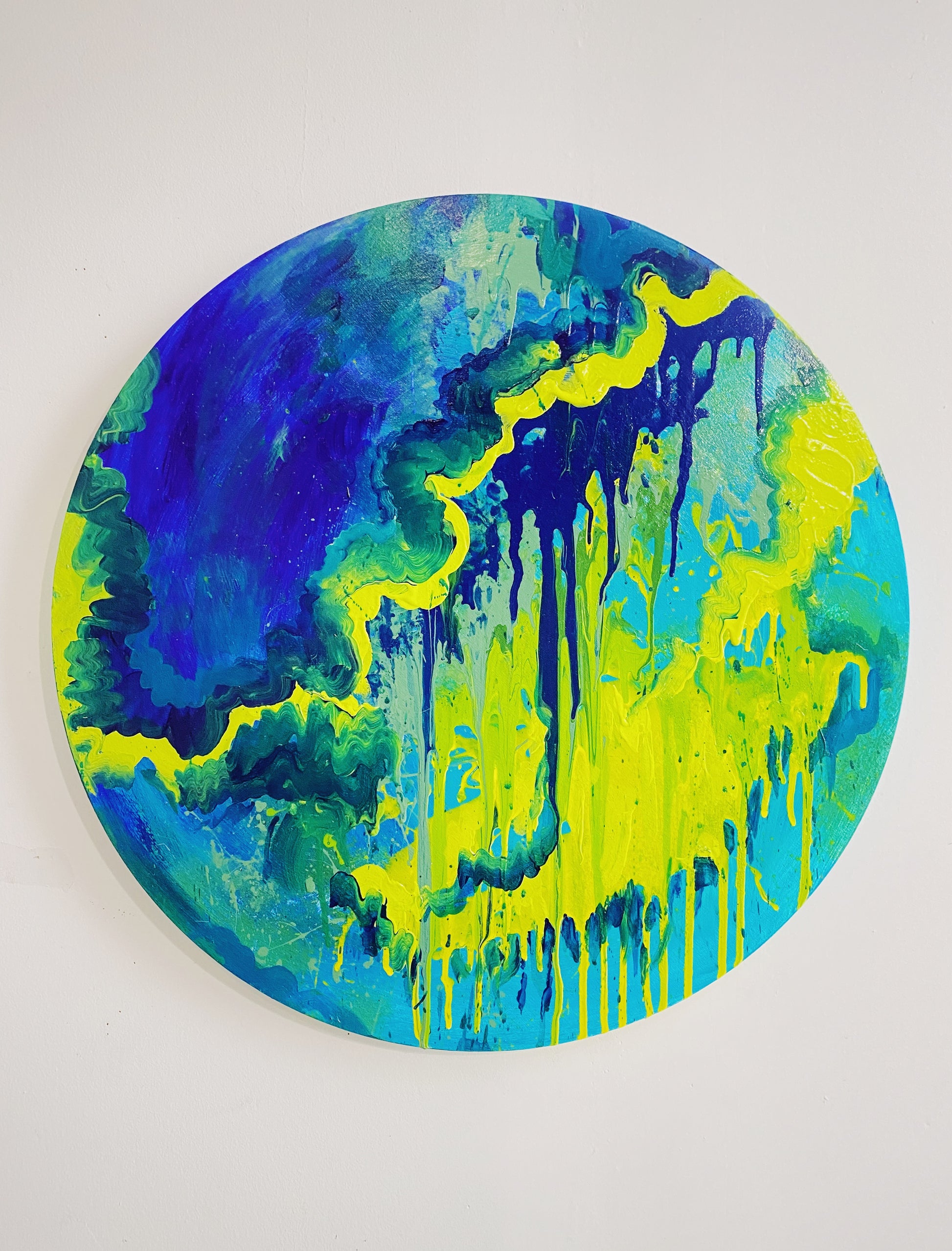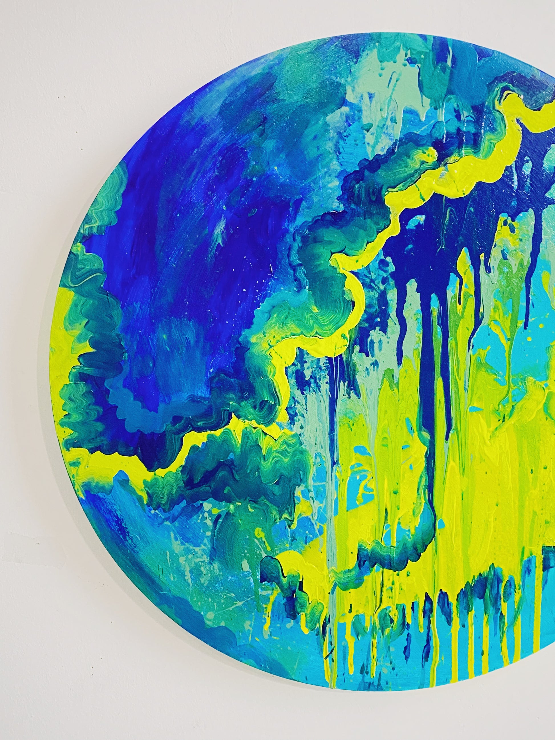 original abstract painting, acrylic on wood panel. 24" in diameter.