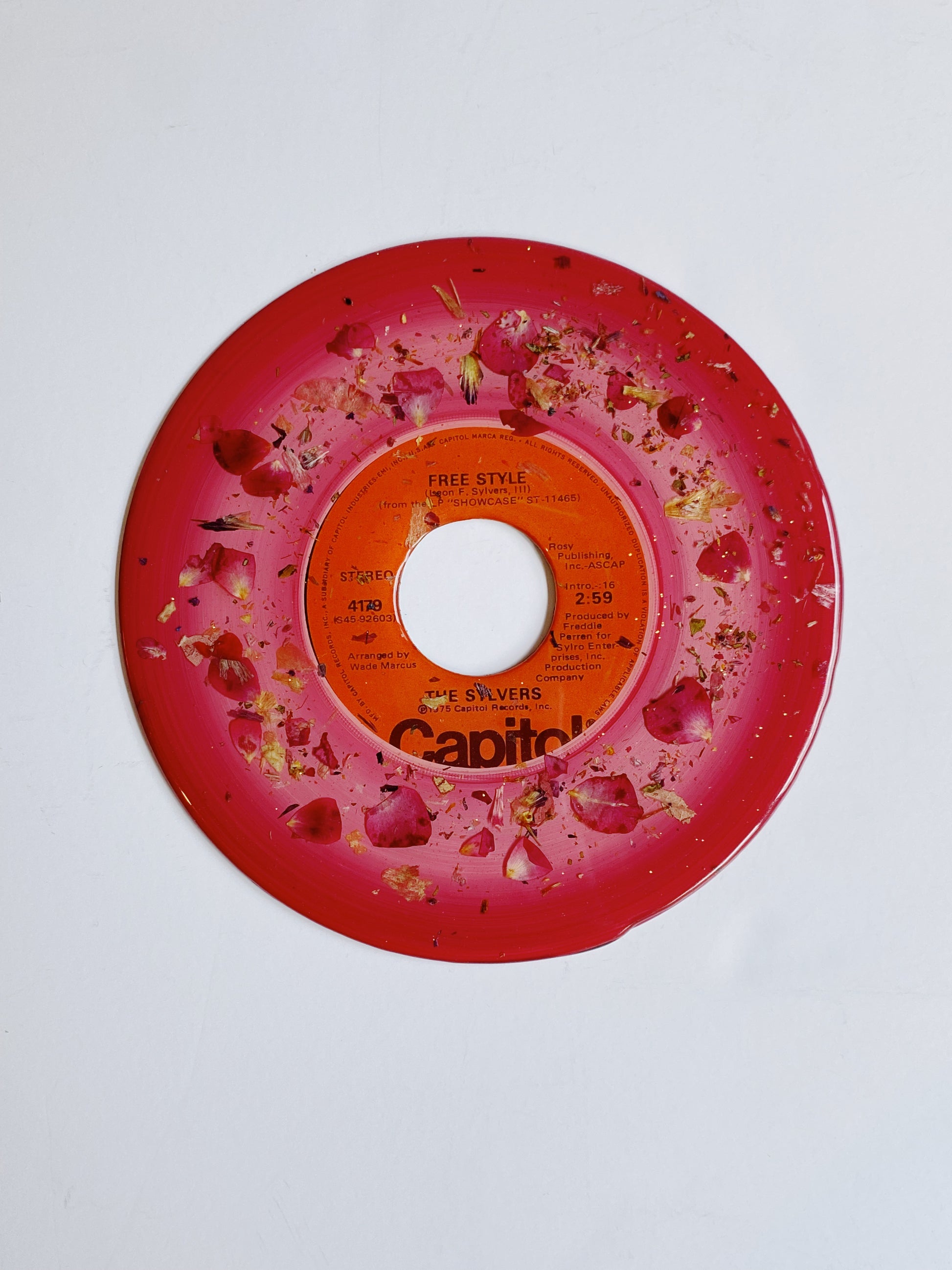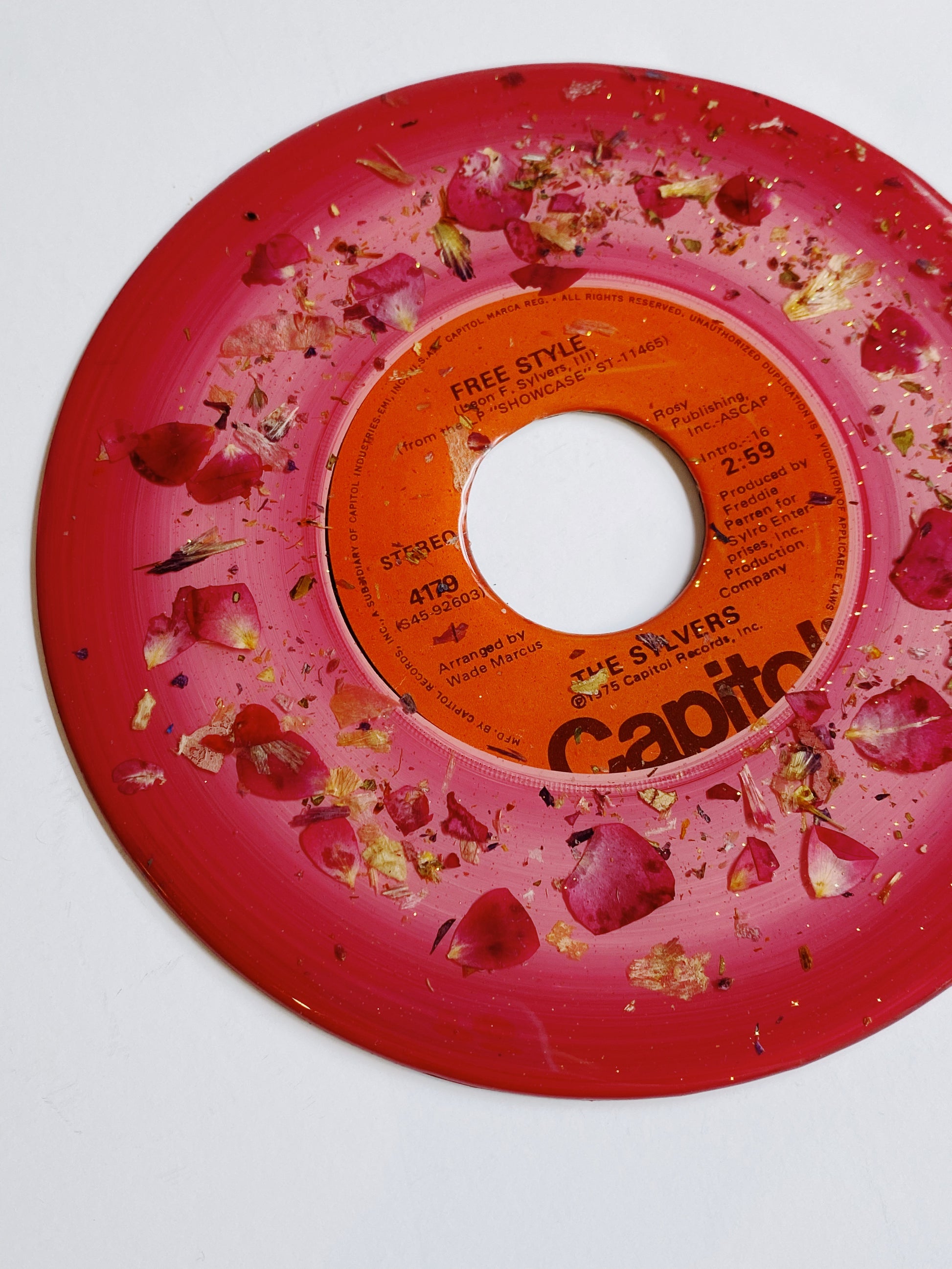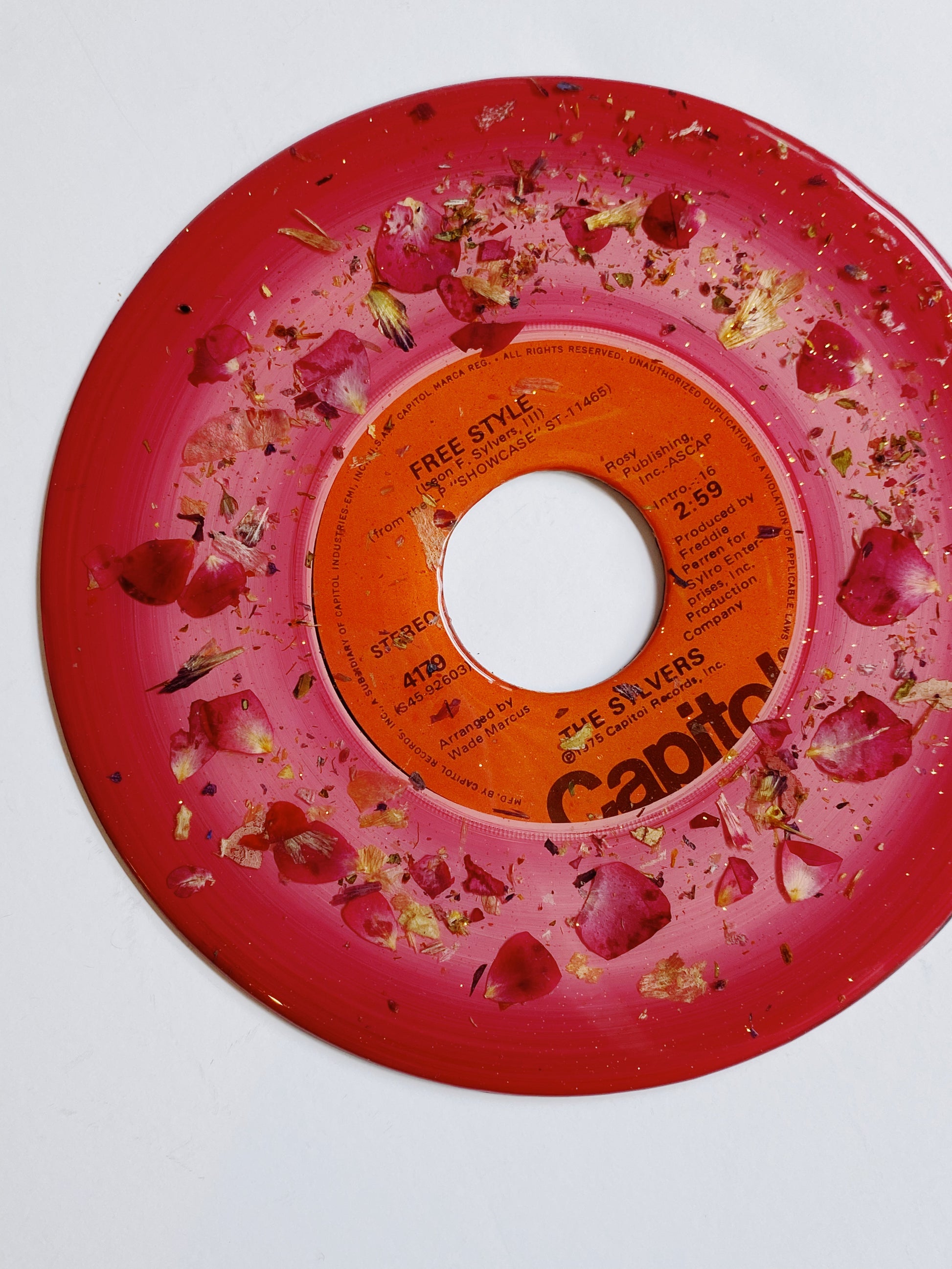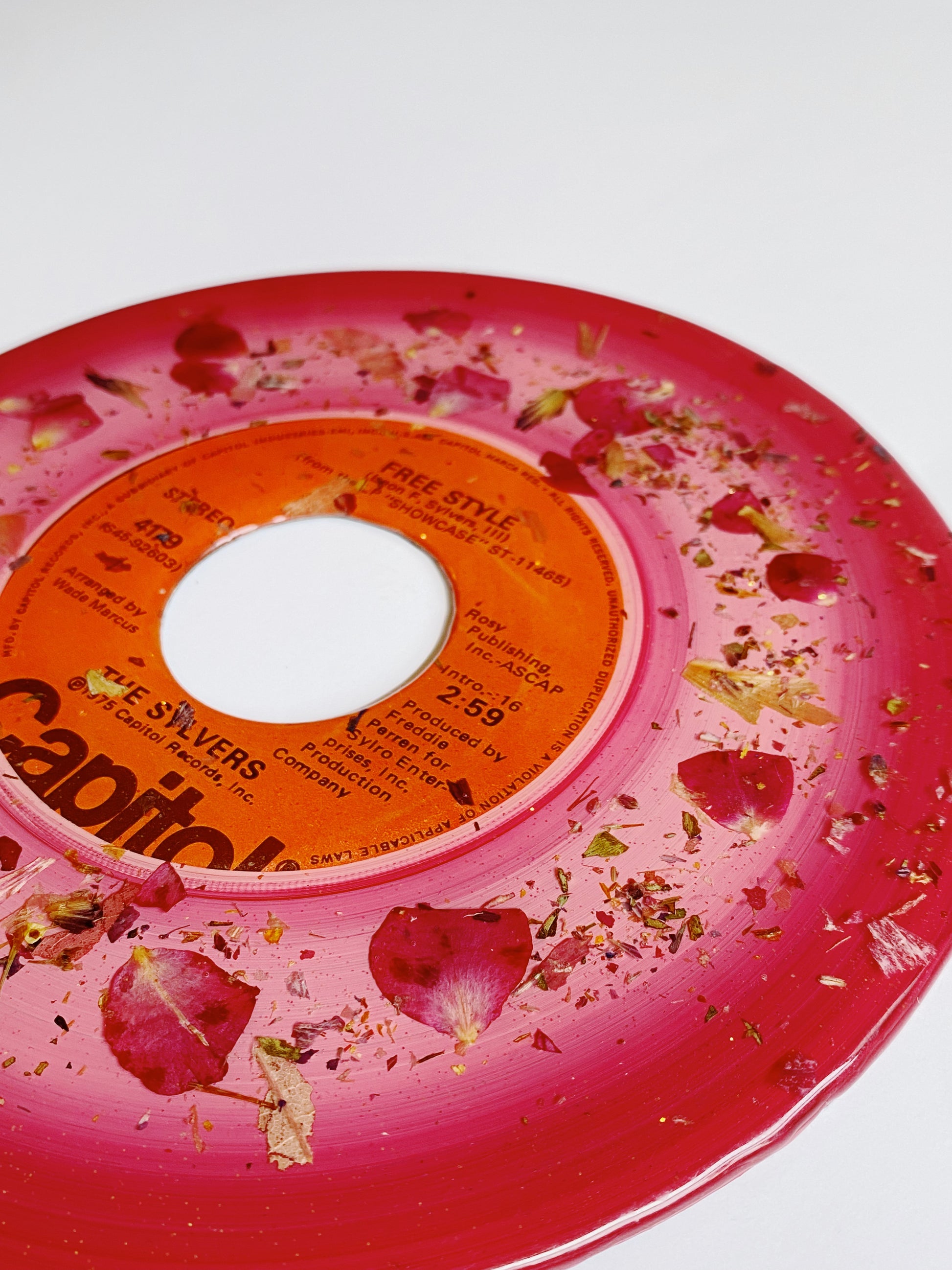 this unique piece is a painted upcycled vinyl record (a 45!) decorated with real pressed flower confetti and rose petals, sealed in a shimmery resin. the mirror-like shine of the resin surface will keep this piece protected while also giving it a brilliant, glossy finish!
