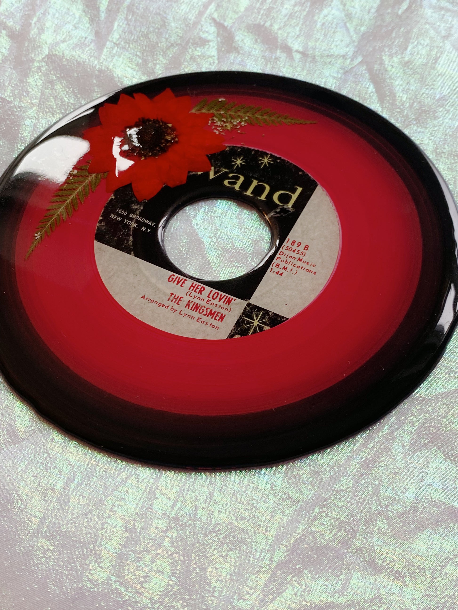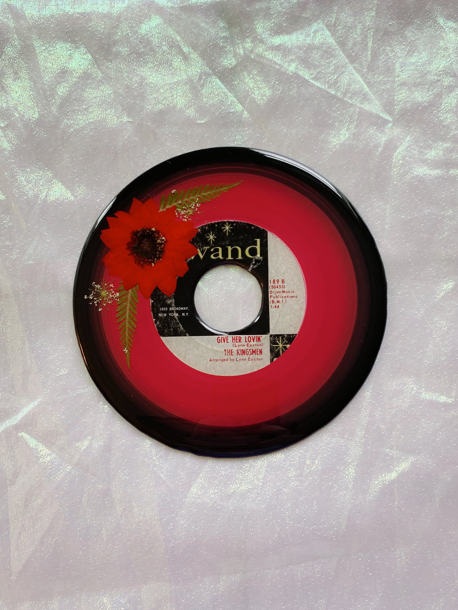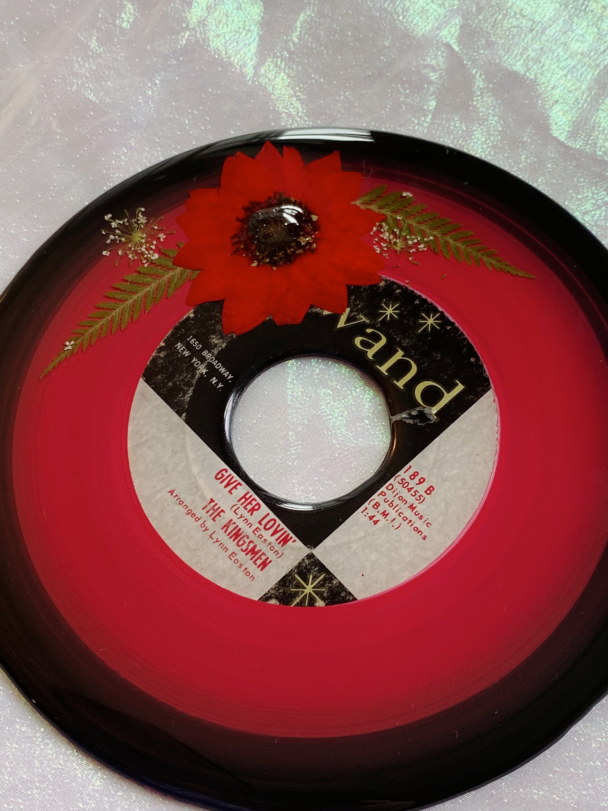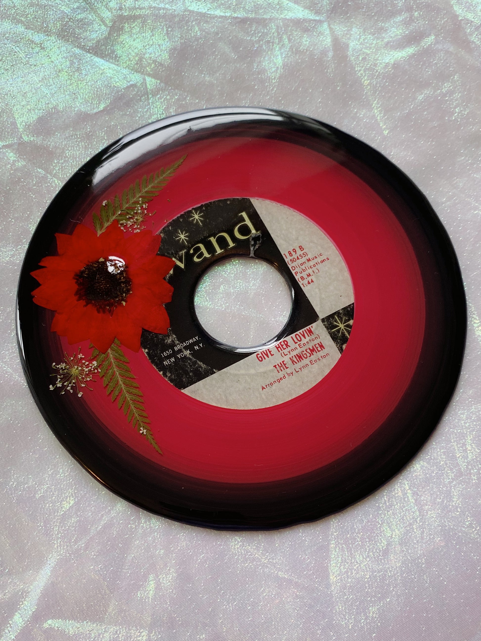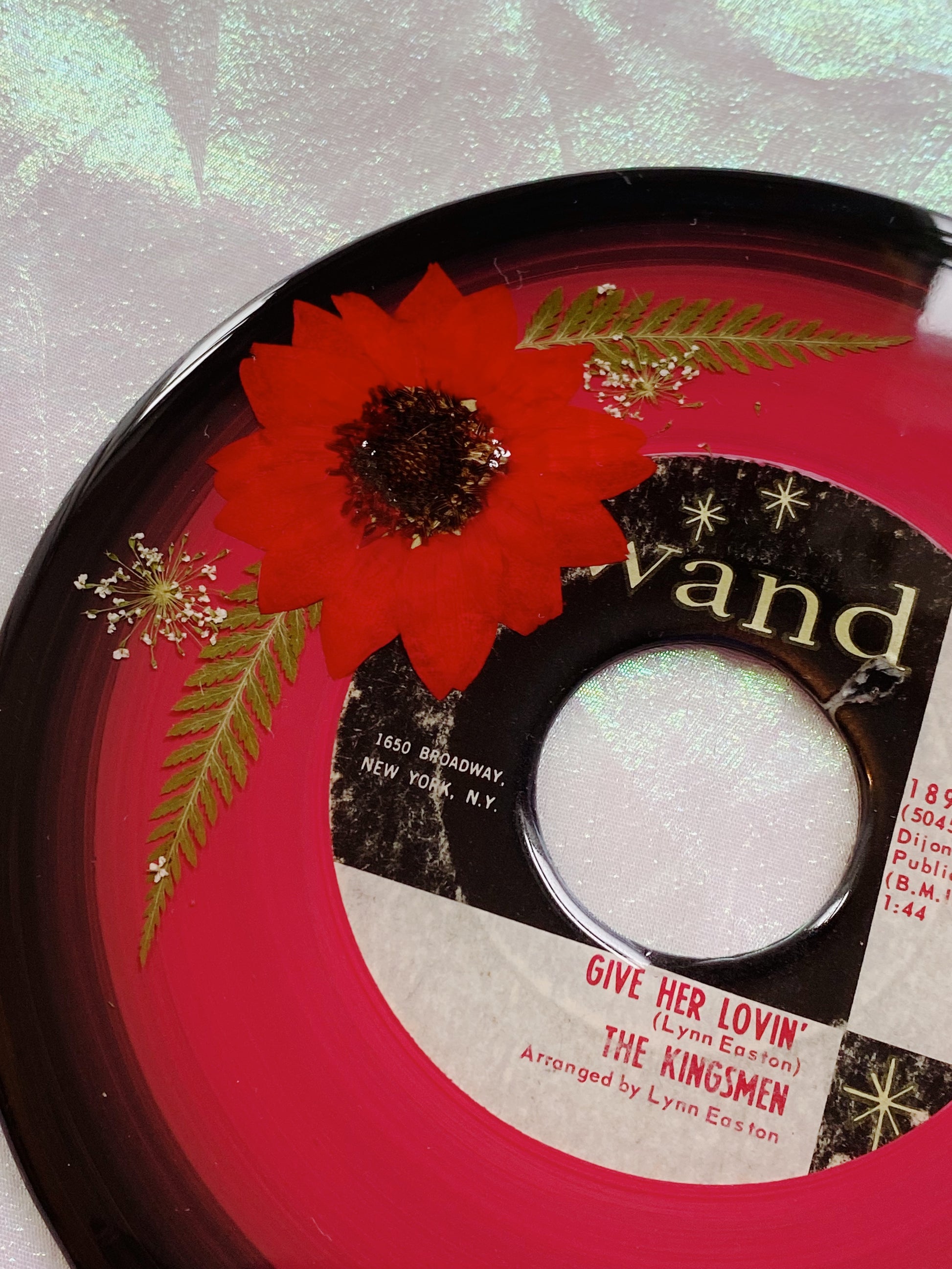 this unique piece is a painted upcycled vinyl record (a 45!) then decorated with real pressed flowers, and sealed in a shimmery resin. the mirror-like shine of the resin surface will keep this piece protected while also giving it a brilliant, glossy finish!