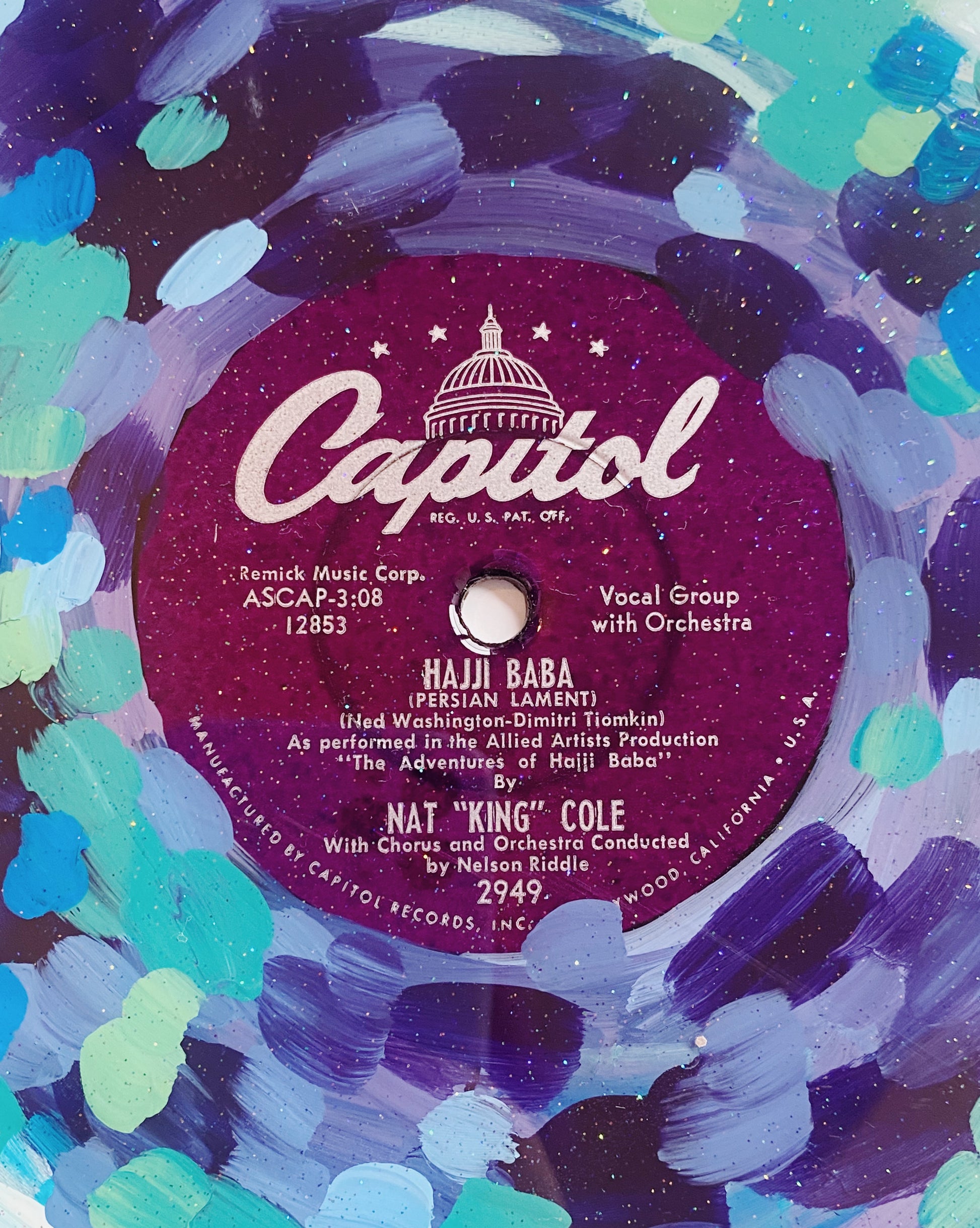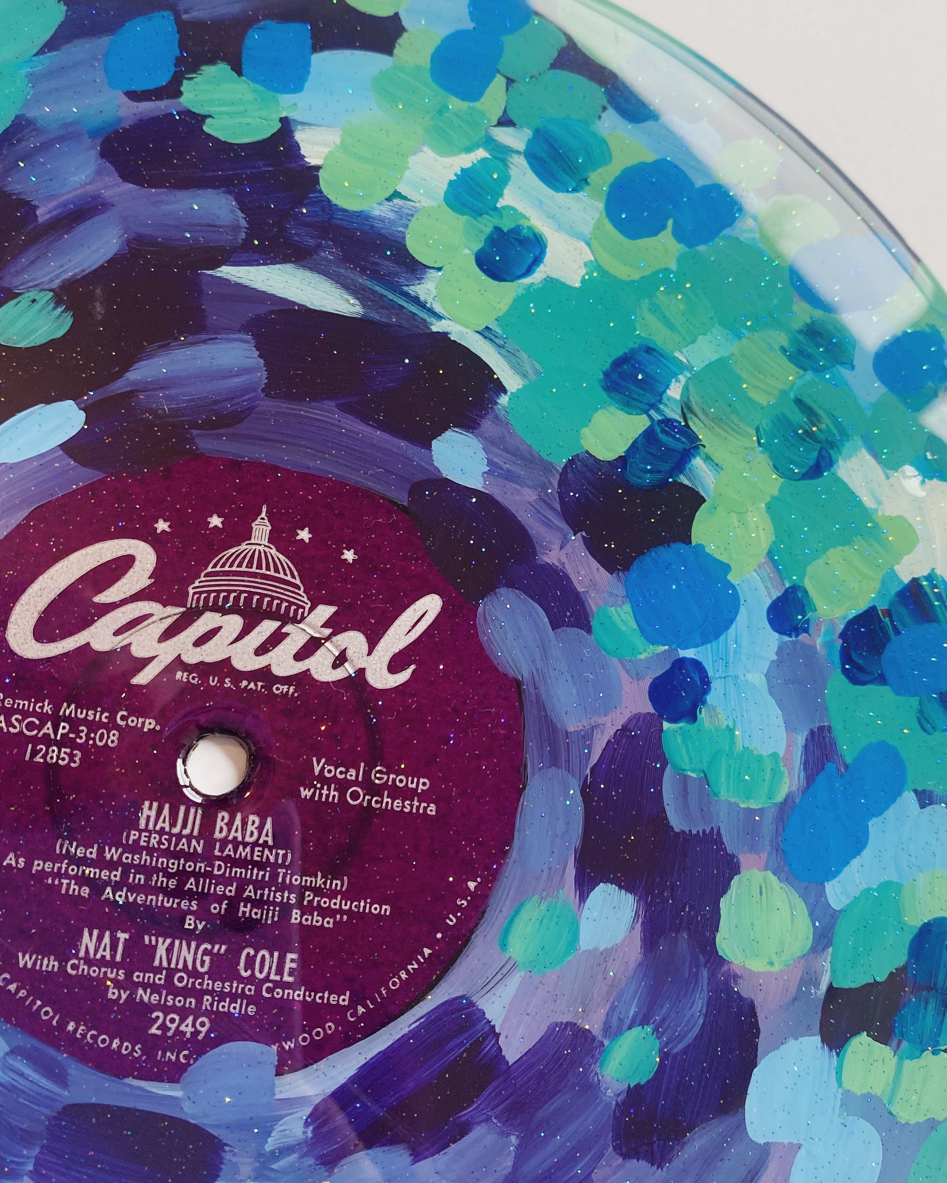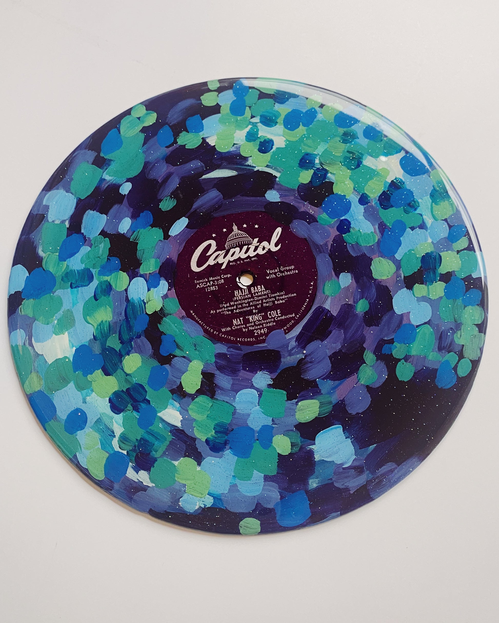 this unique piece is an acrylic painted upcycled vinyl record (a 78!) is sealed in a shimmery resin. the mirror-like shine of the resin surface will keep this piece protected while also giving it a brilliant, glossy finish!
