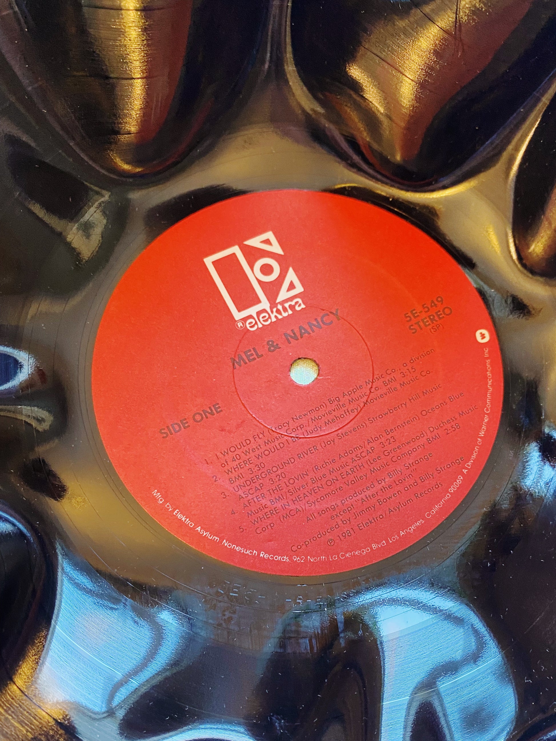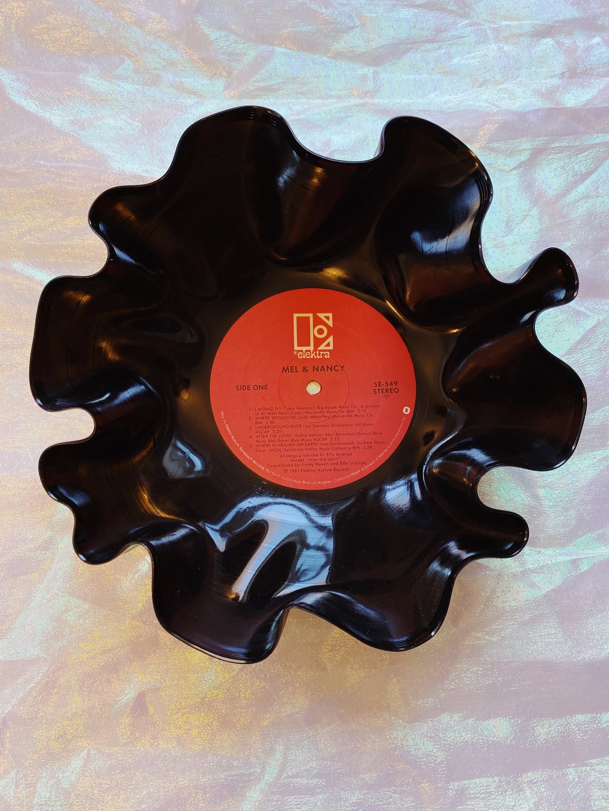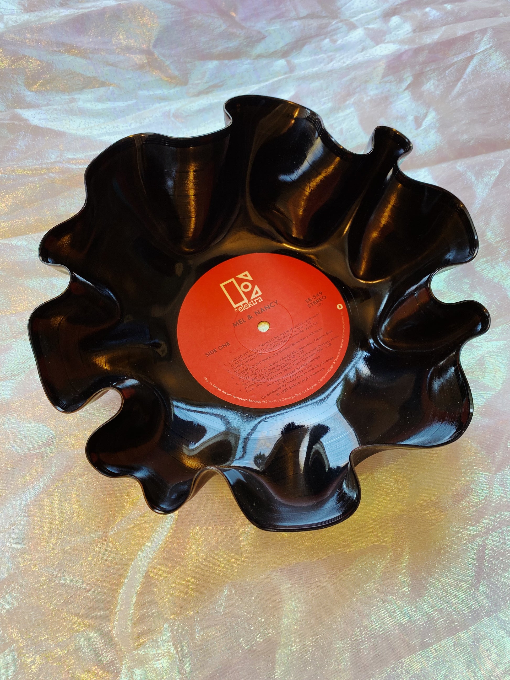 this bowl is one of a kind and made from a damaged vinyl record. the bowl is not guaranteed food safe due to the nature of the vintage materials. please do not use for food, this is for decorative use only!