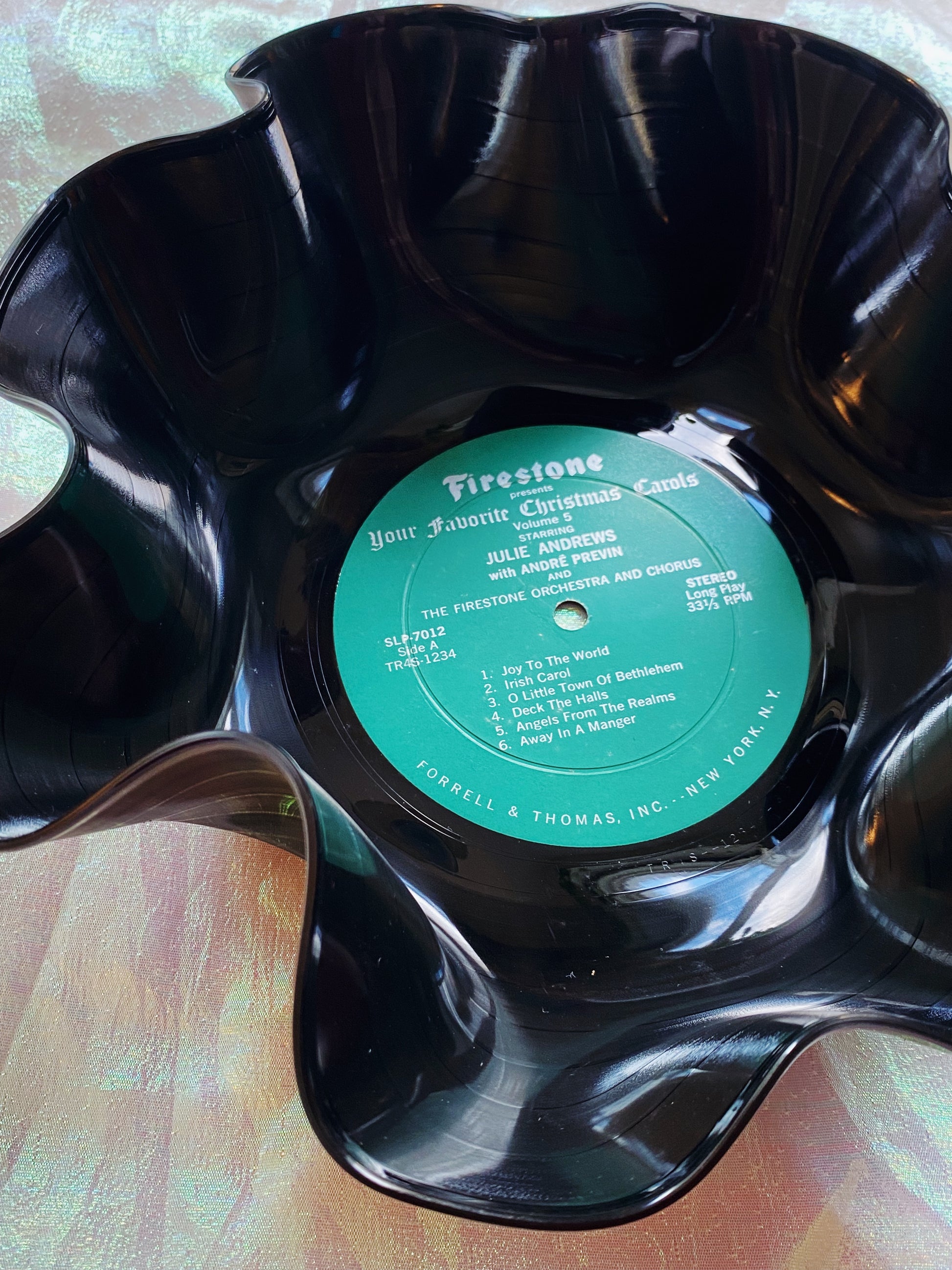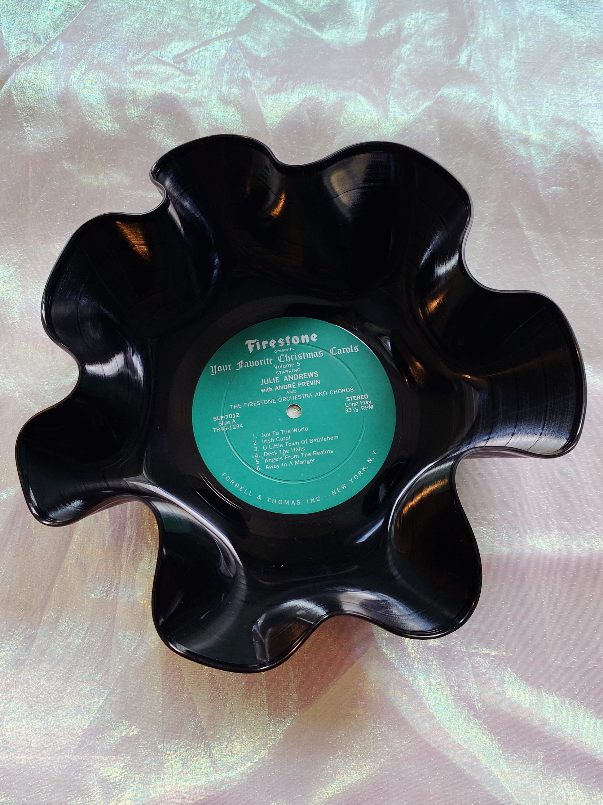 this bowl is one of a kind and made from a damaged vinyl record. the bowl is not guaranteed food safe due to the nature of the vintage materials. please do not use for food, this is for decorative use only!