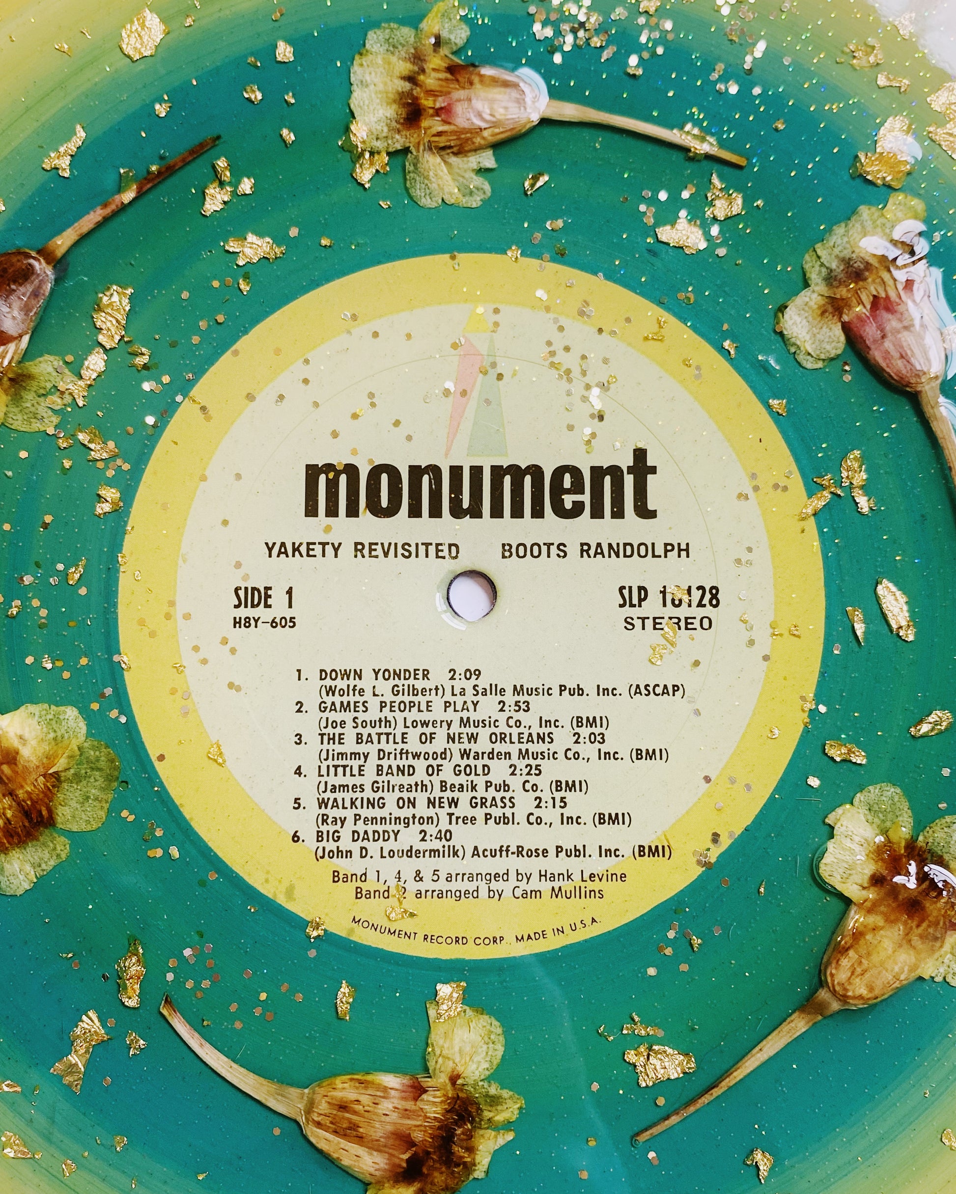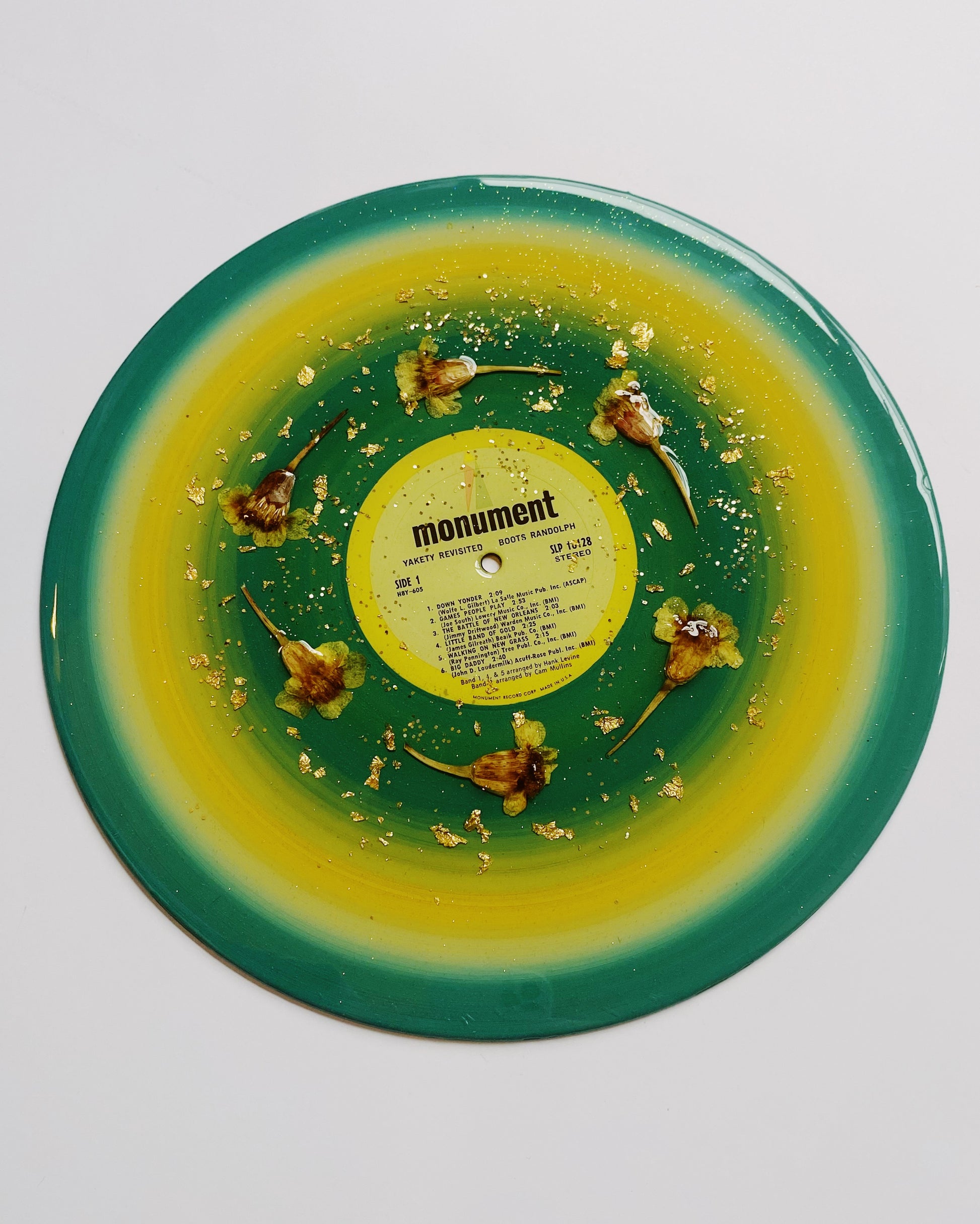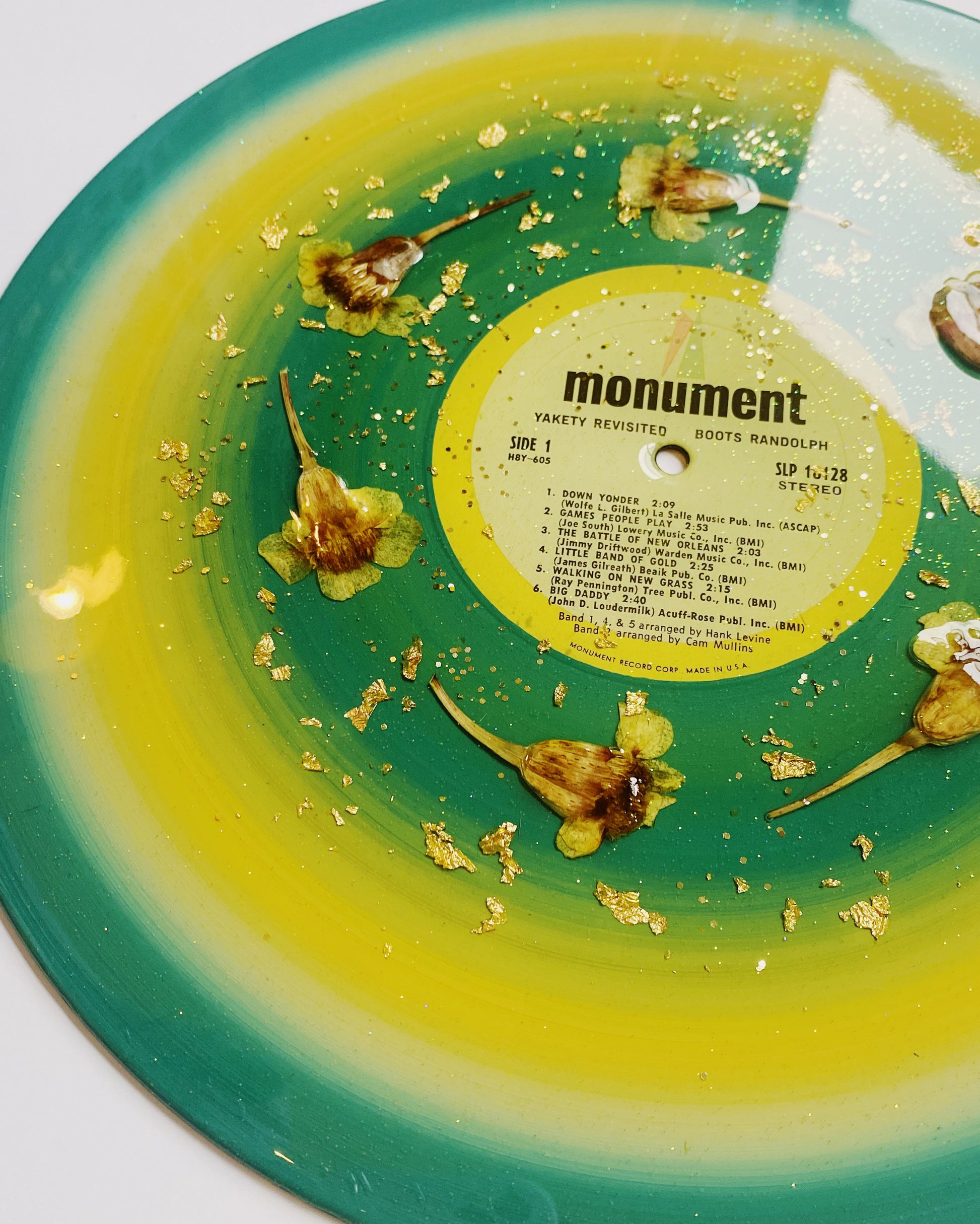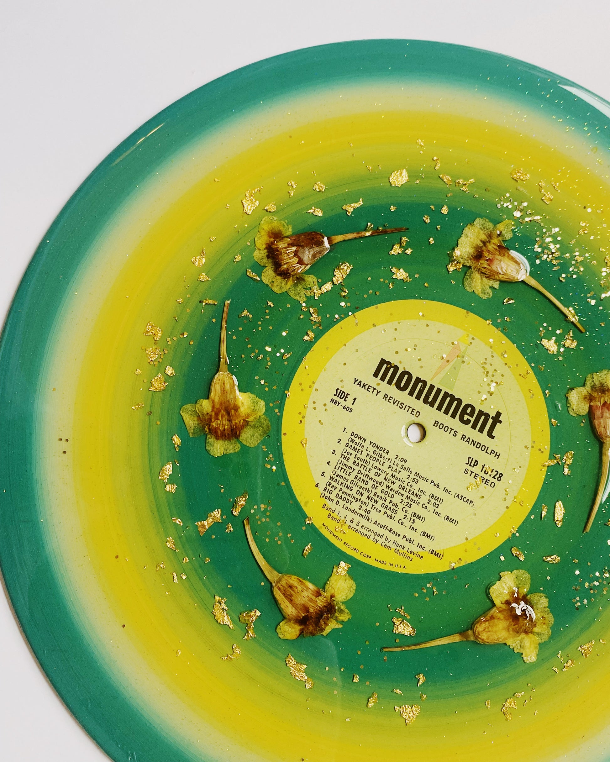 this unique piece is an acrylic painted upcycled vinyl record (a 33!) with real pressed leaves and flowers sealed in a shimmery resin. the mirror-like shine of the resin surface will keep this piece protected while also giving it a brilliant, glossy finish!