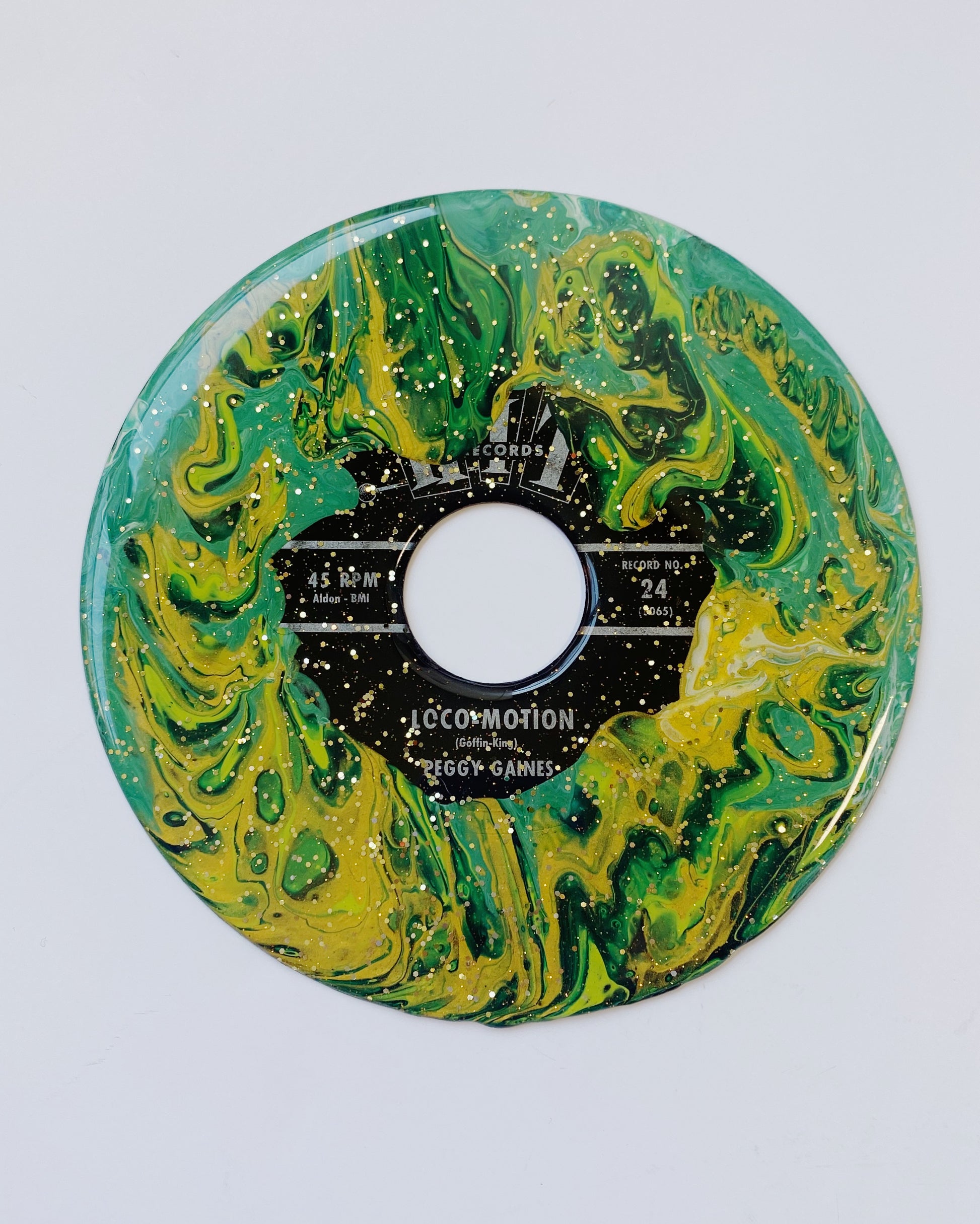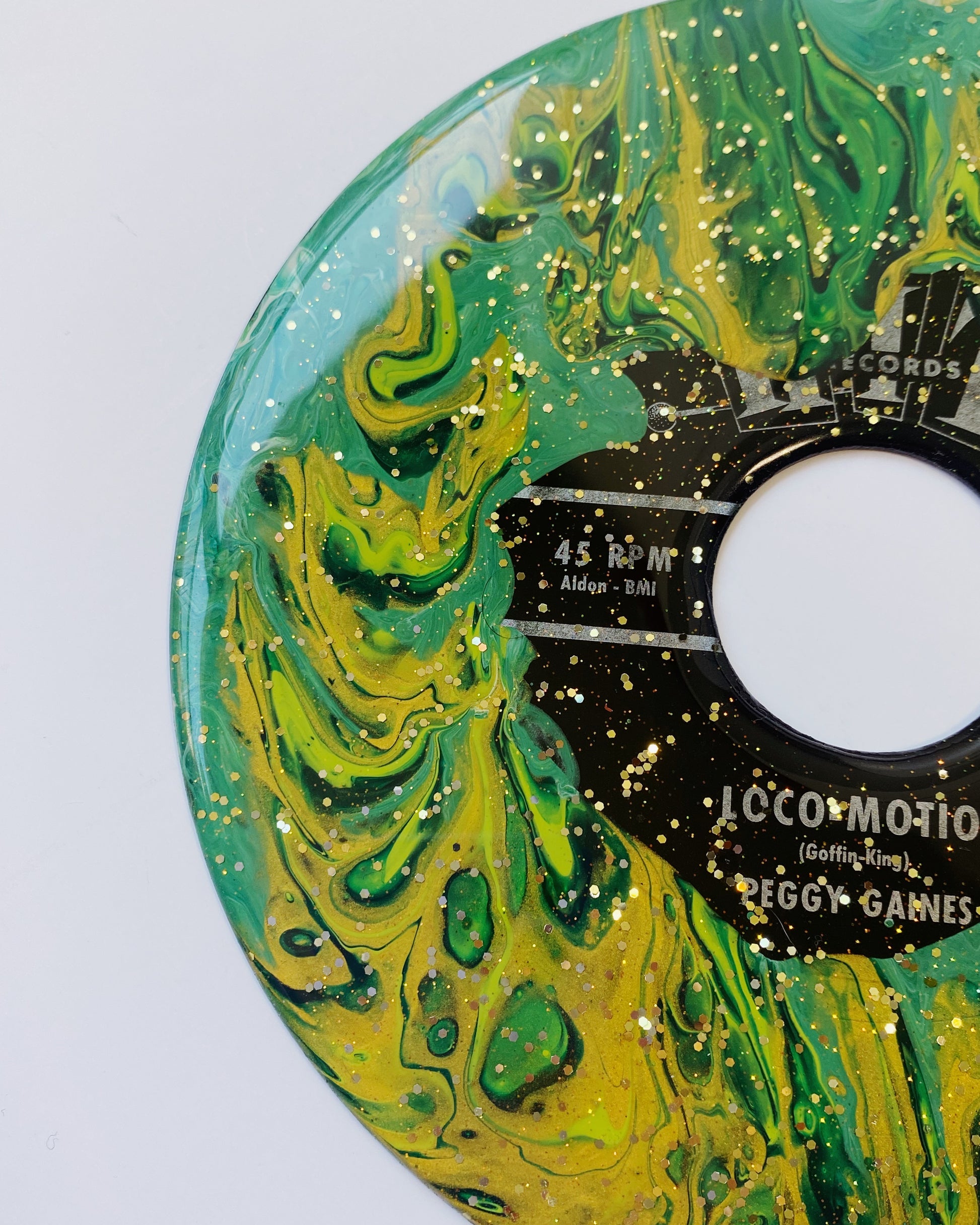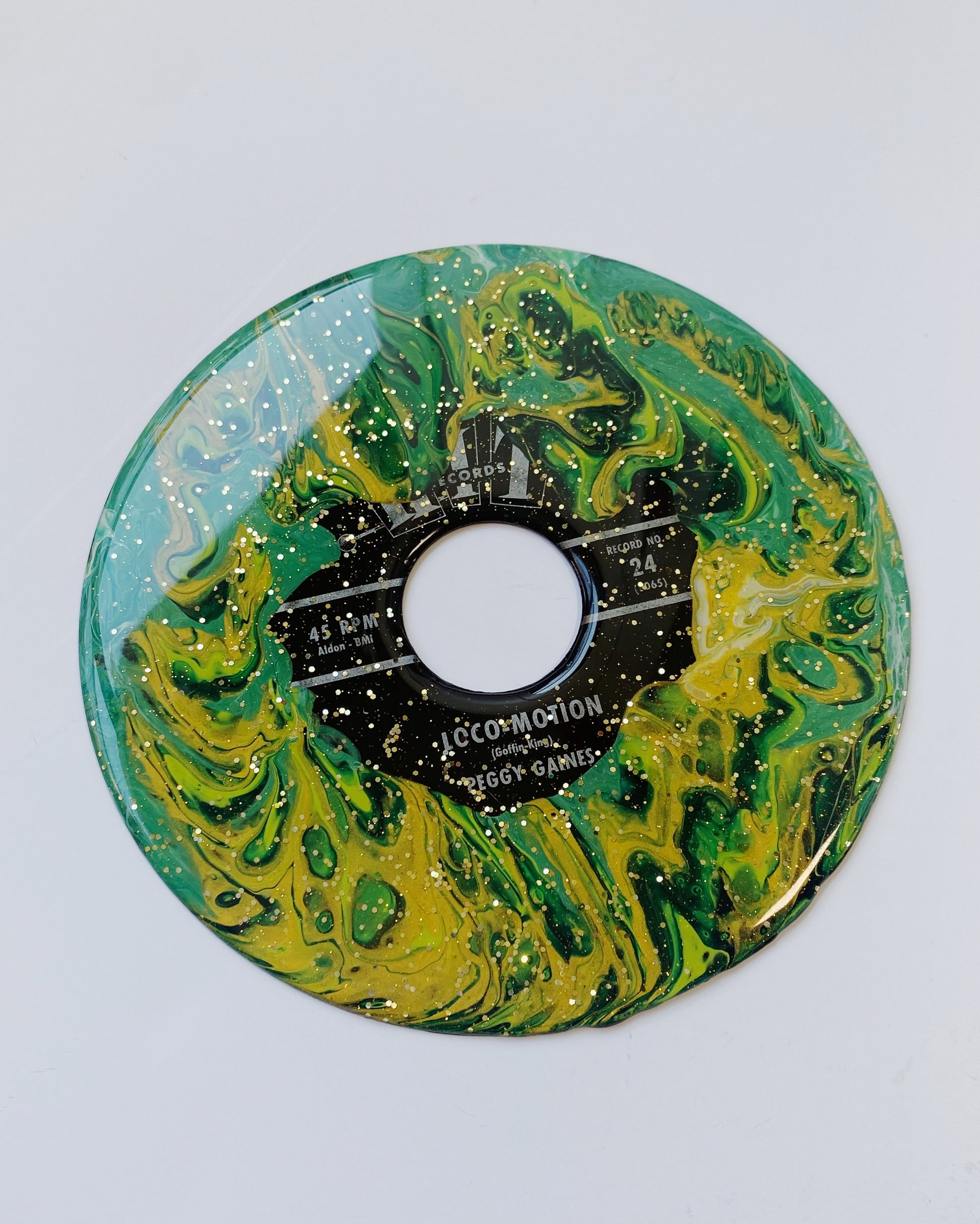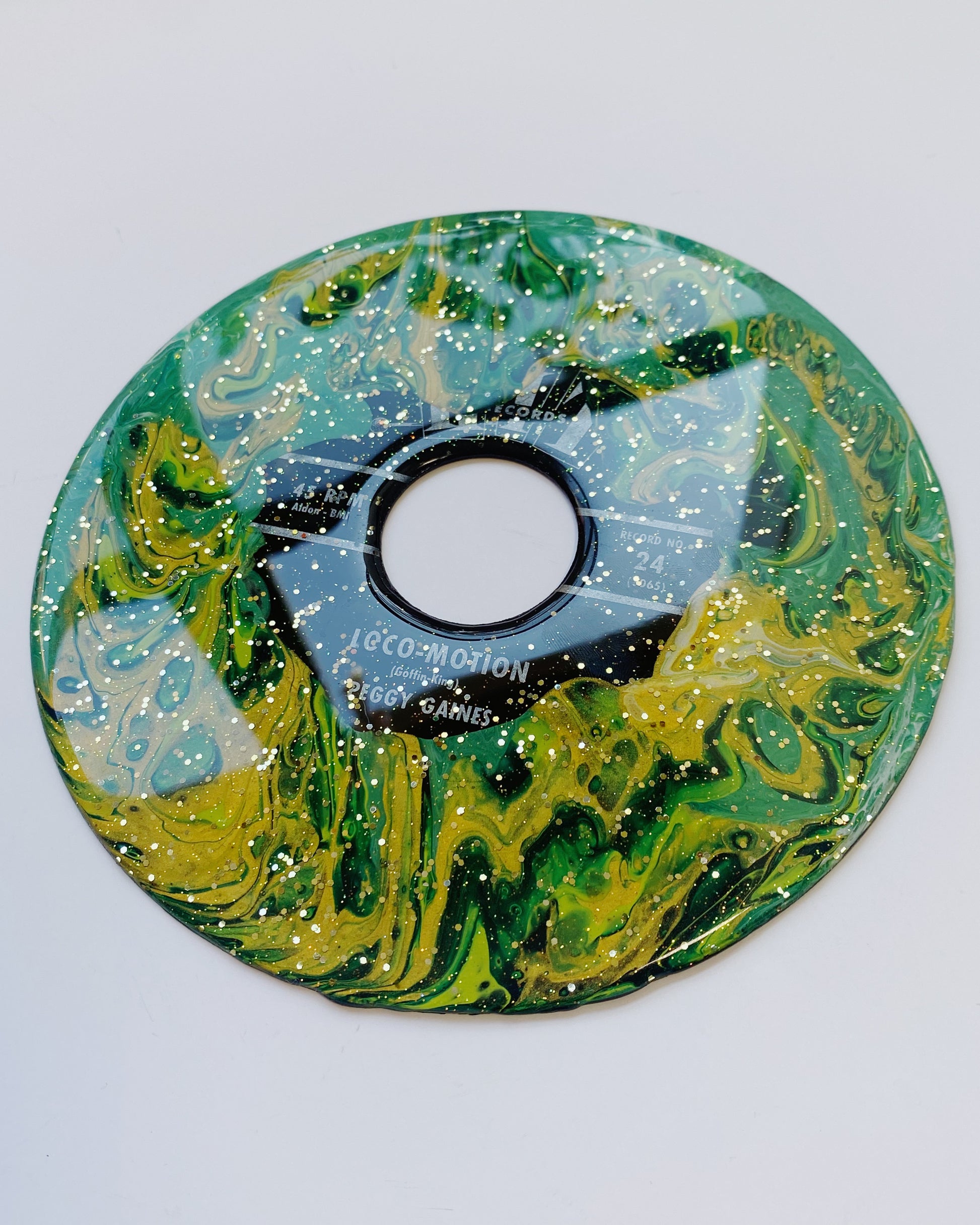this unique piece is an acrylic pour painted upcycled vinyl record (a 45!) sealed in a shimmery resin. the mirror-like shine of the resin surface will keep this piece protected while also giving it a brilliant, glossy finish!