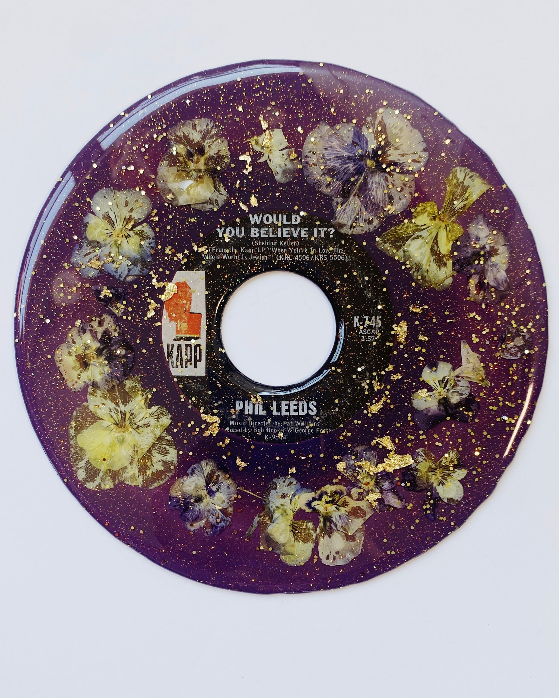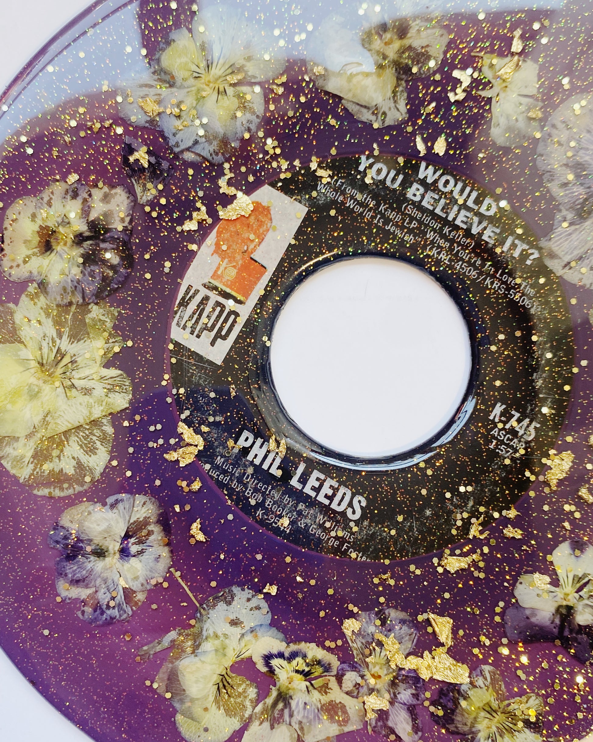 hand painted upcycled vinyl record (45s) decorated with real pressed flowers and sealed in a shimmery resin. the mirror-like shine of the resin surface will keep this piece protected while also giving it a brilliant, glossy finish!