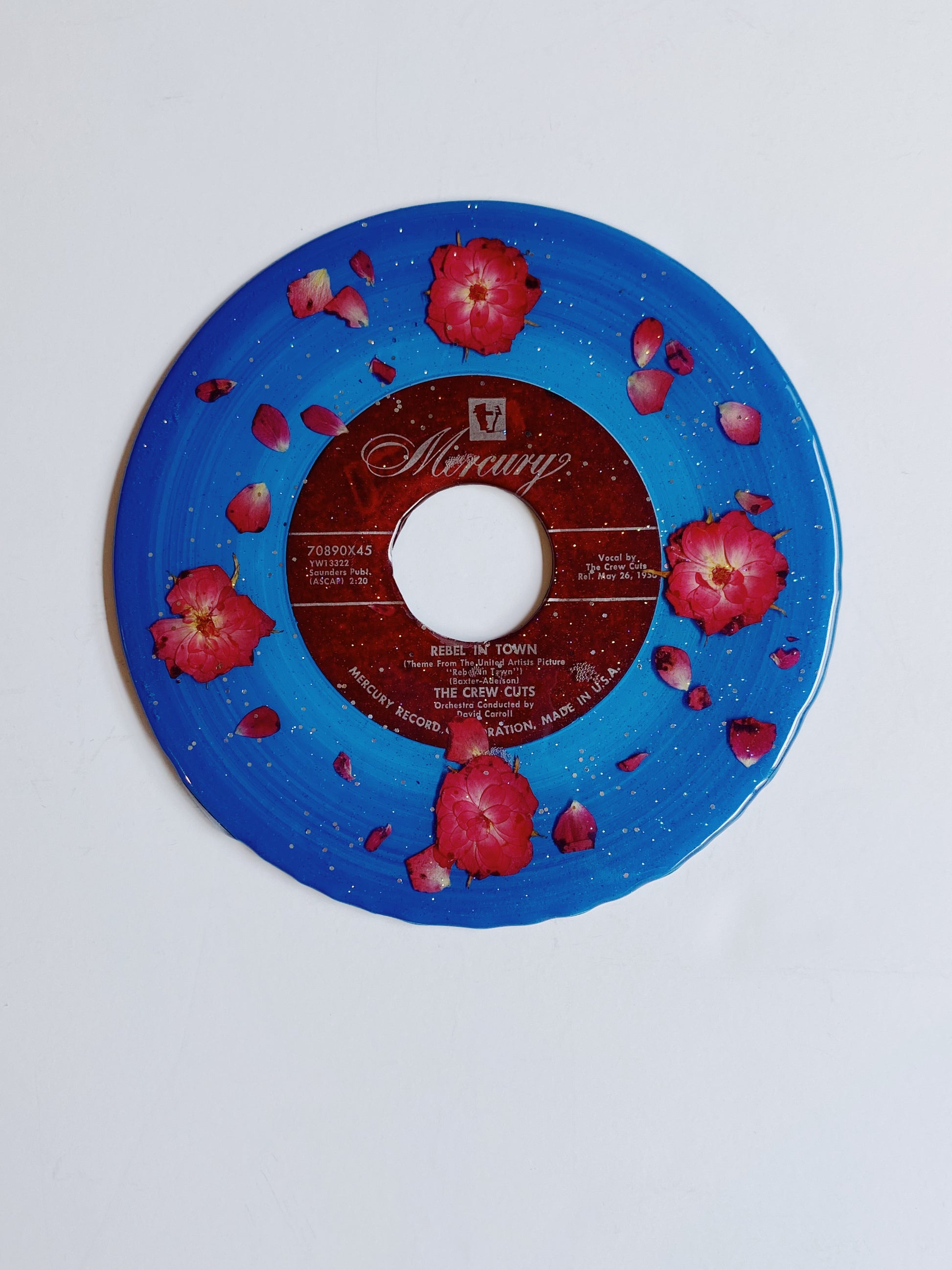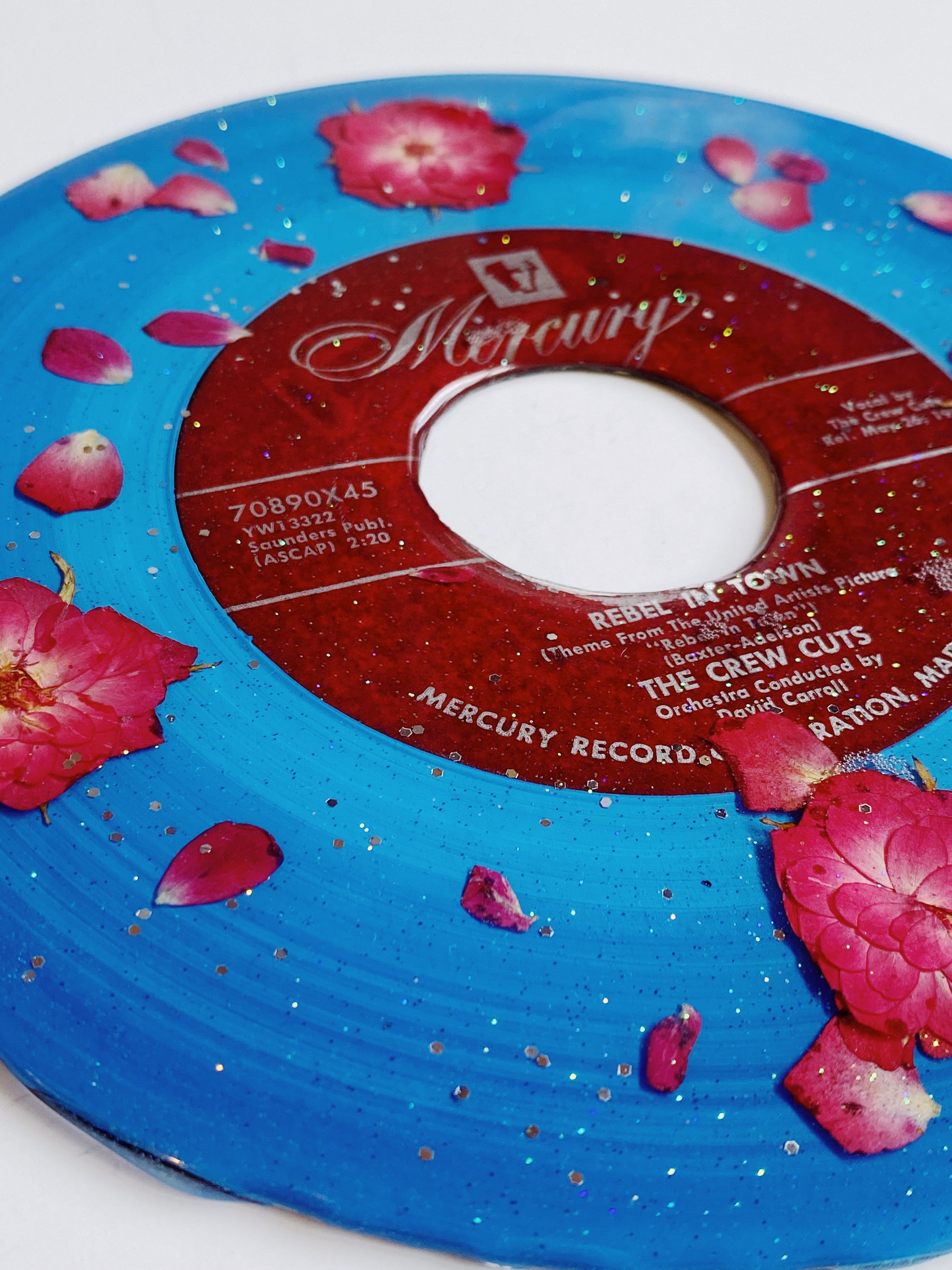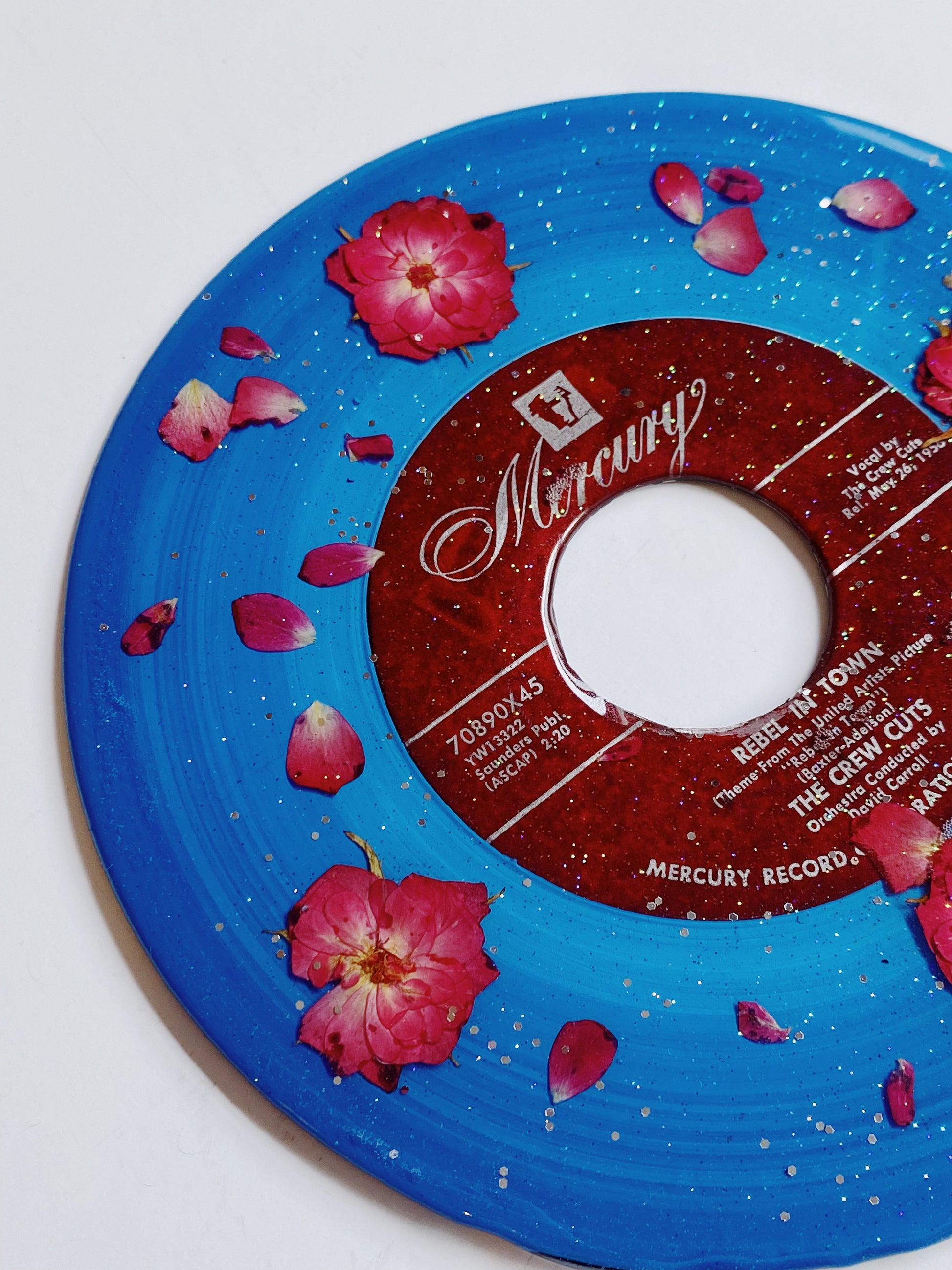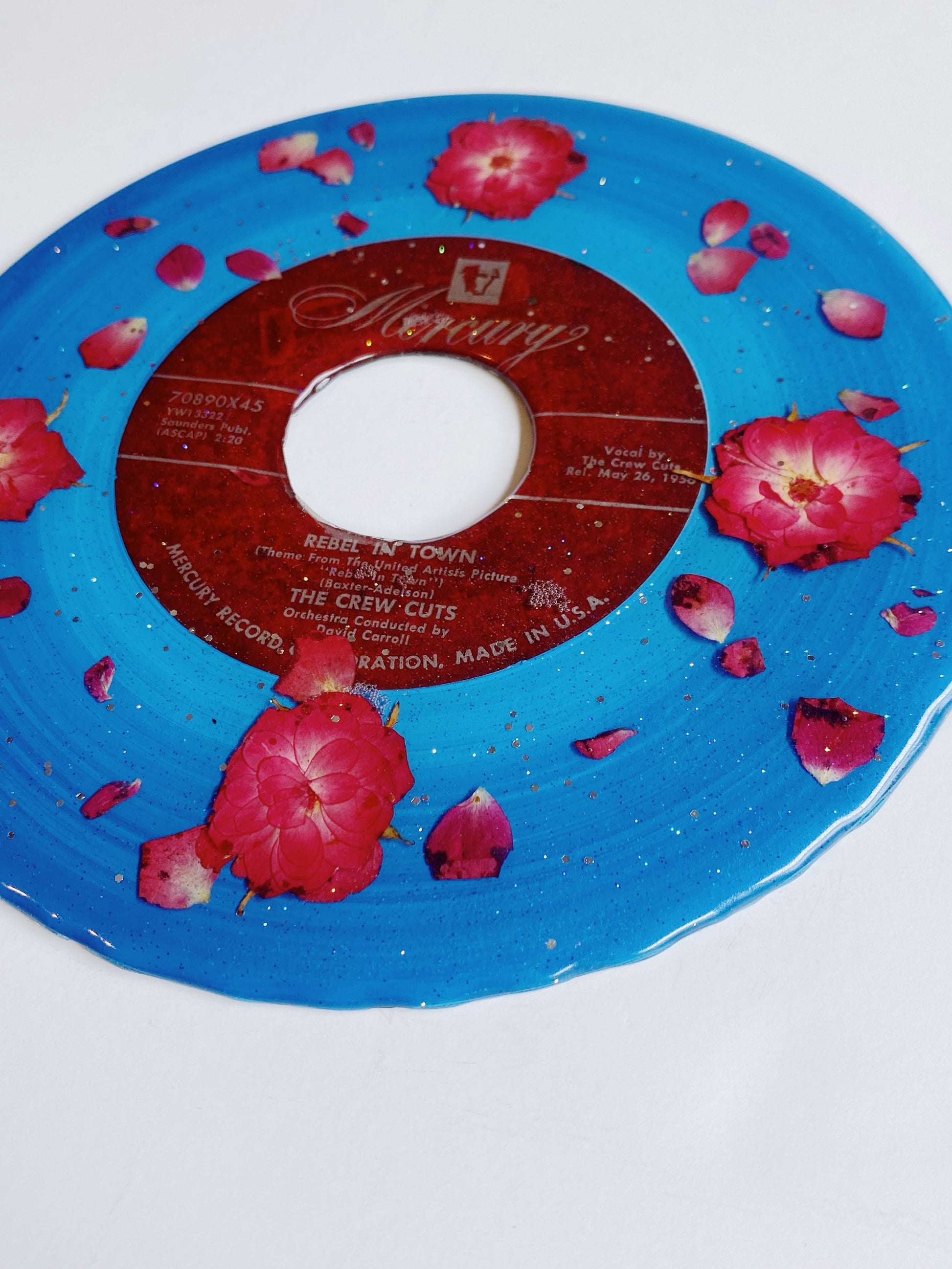 this unique piece is a painted upcycled vinyl record (a 45!) decorated with real pressed roses and sealed in a shimmery resin. the mirror-like shine of the resin surface will keep this piece protected while also giving it a brilliant, glossy finish!