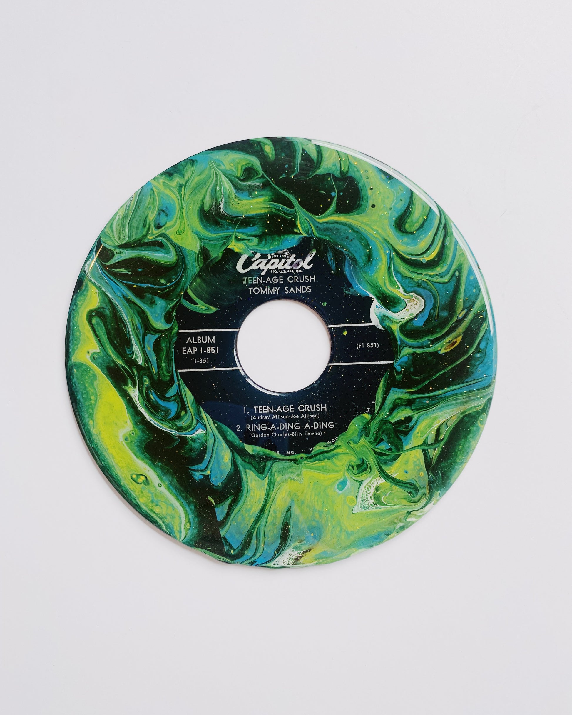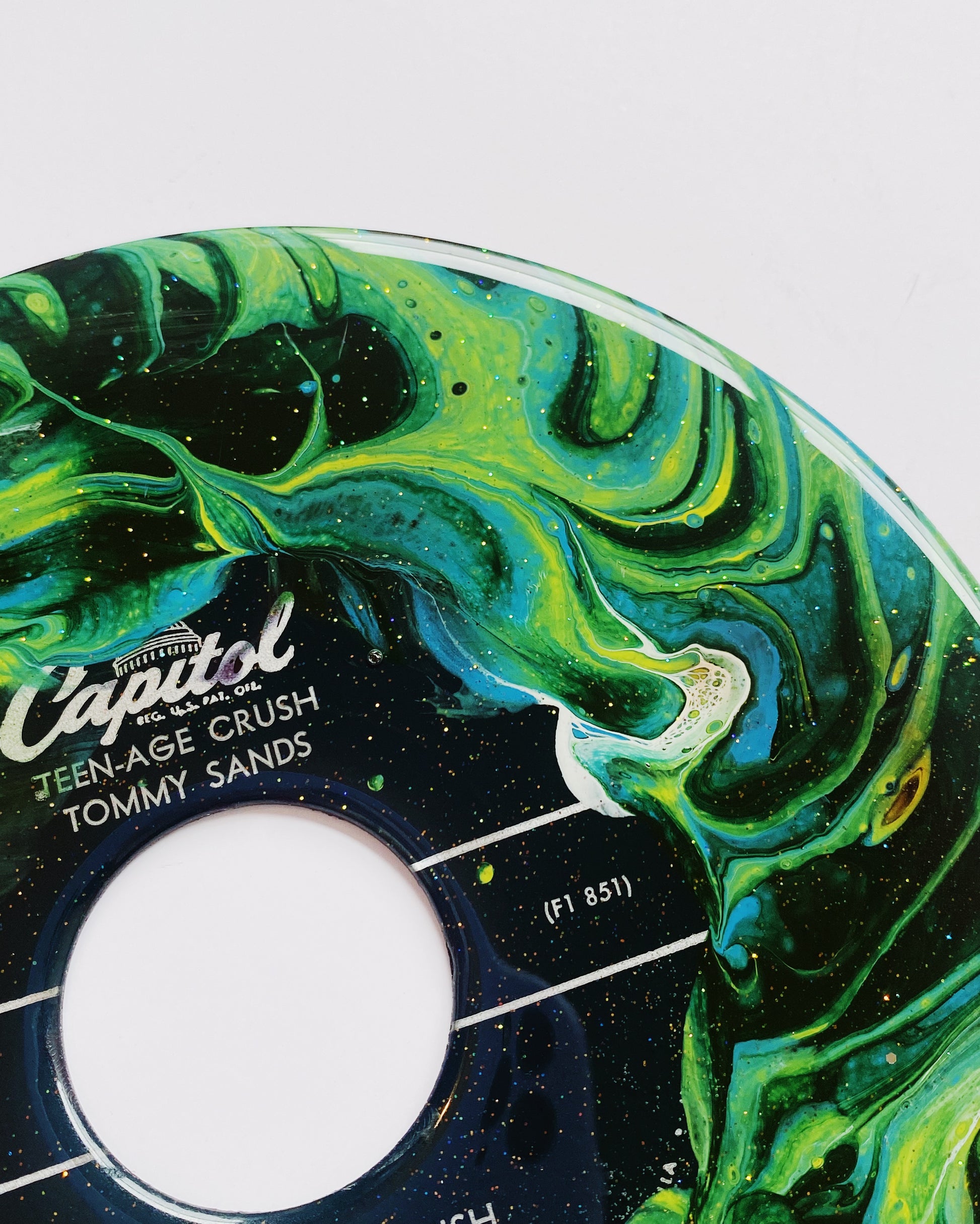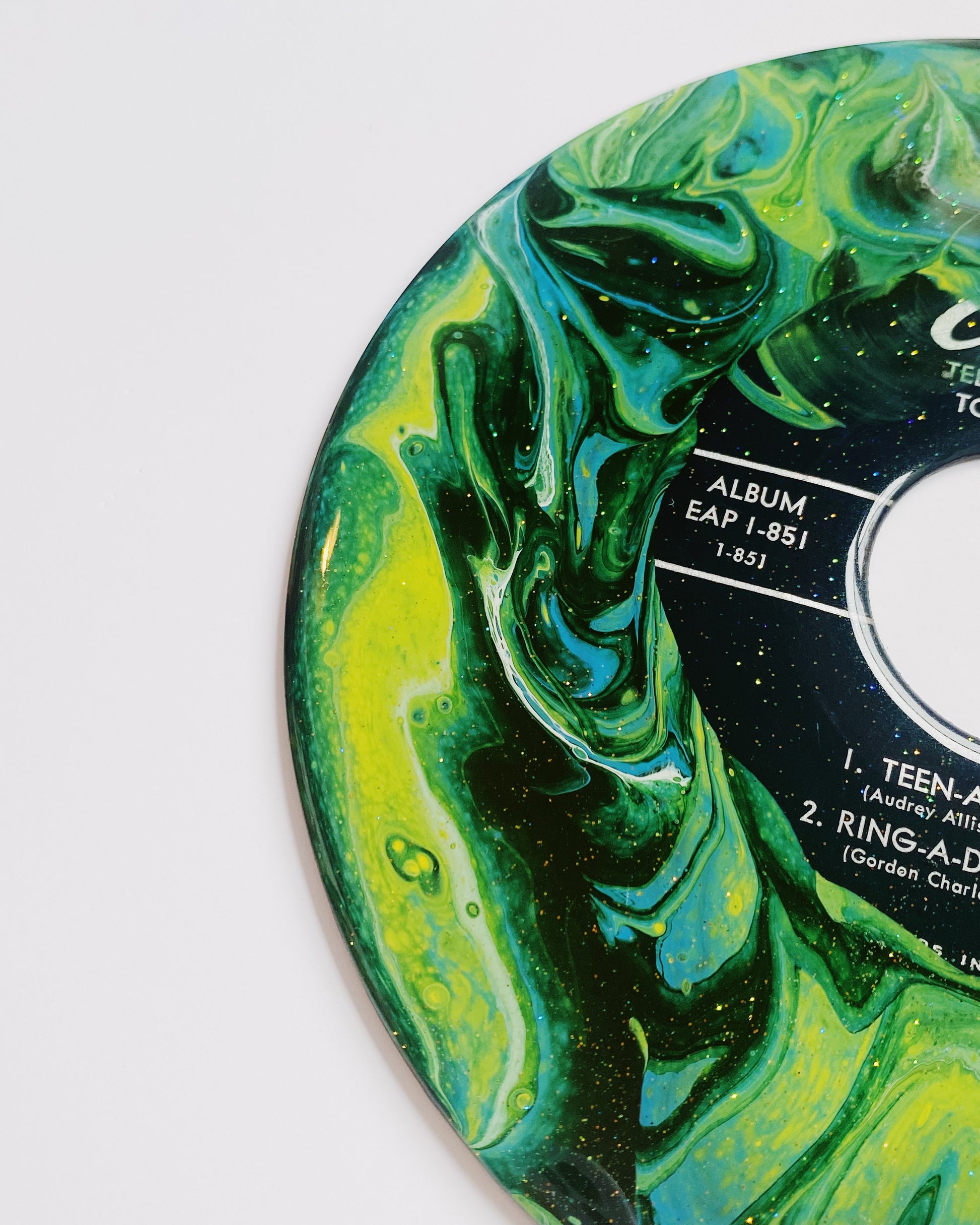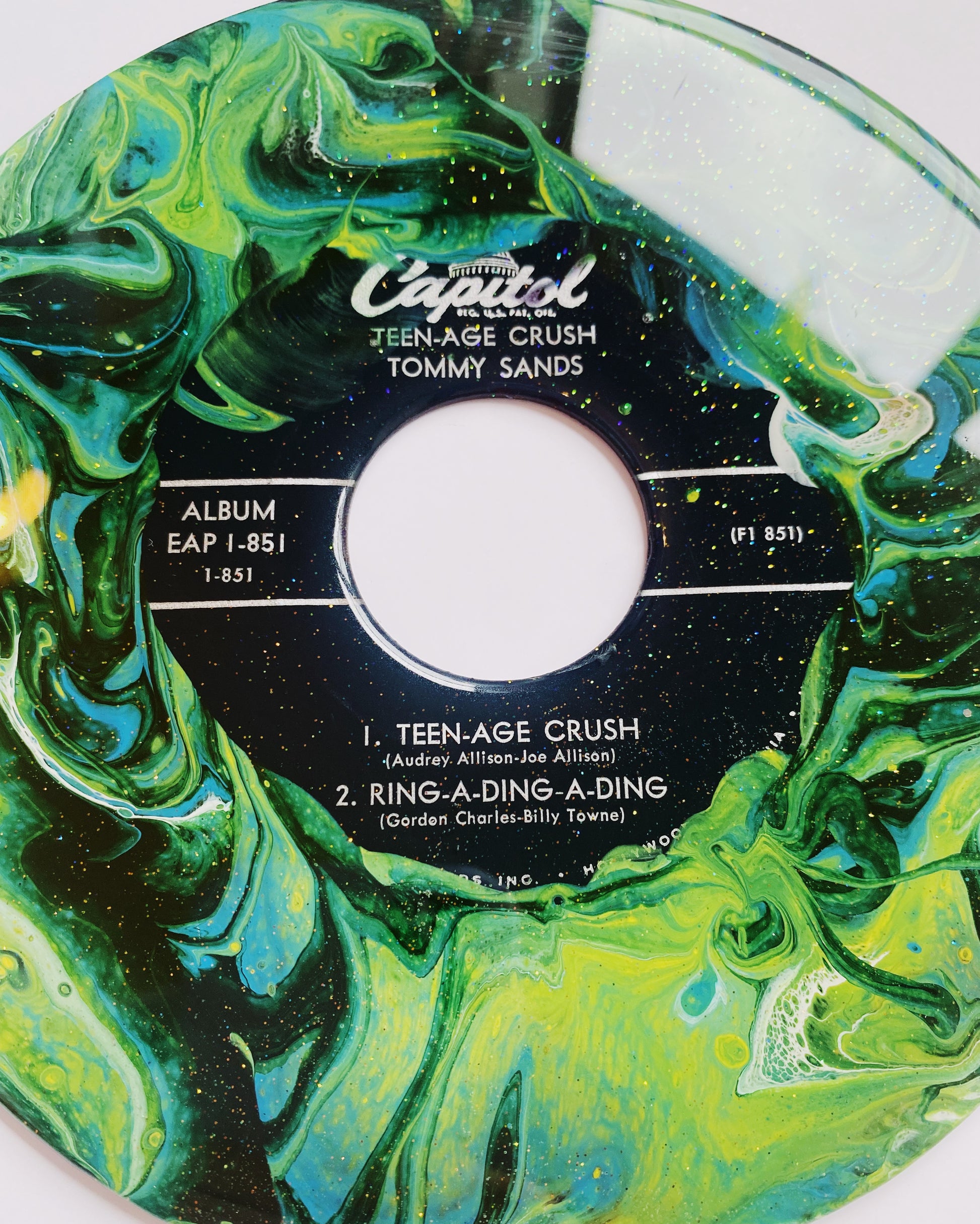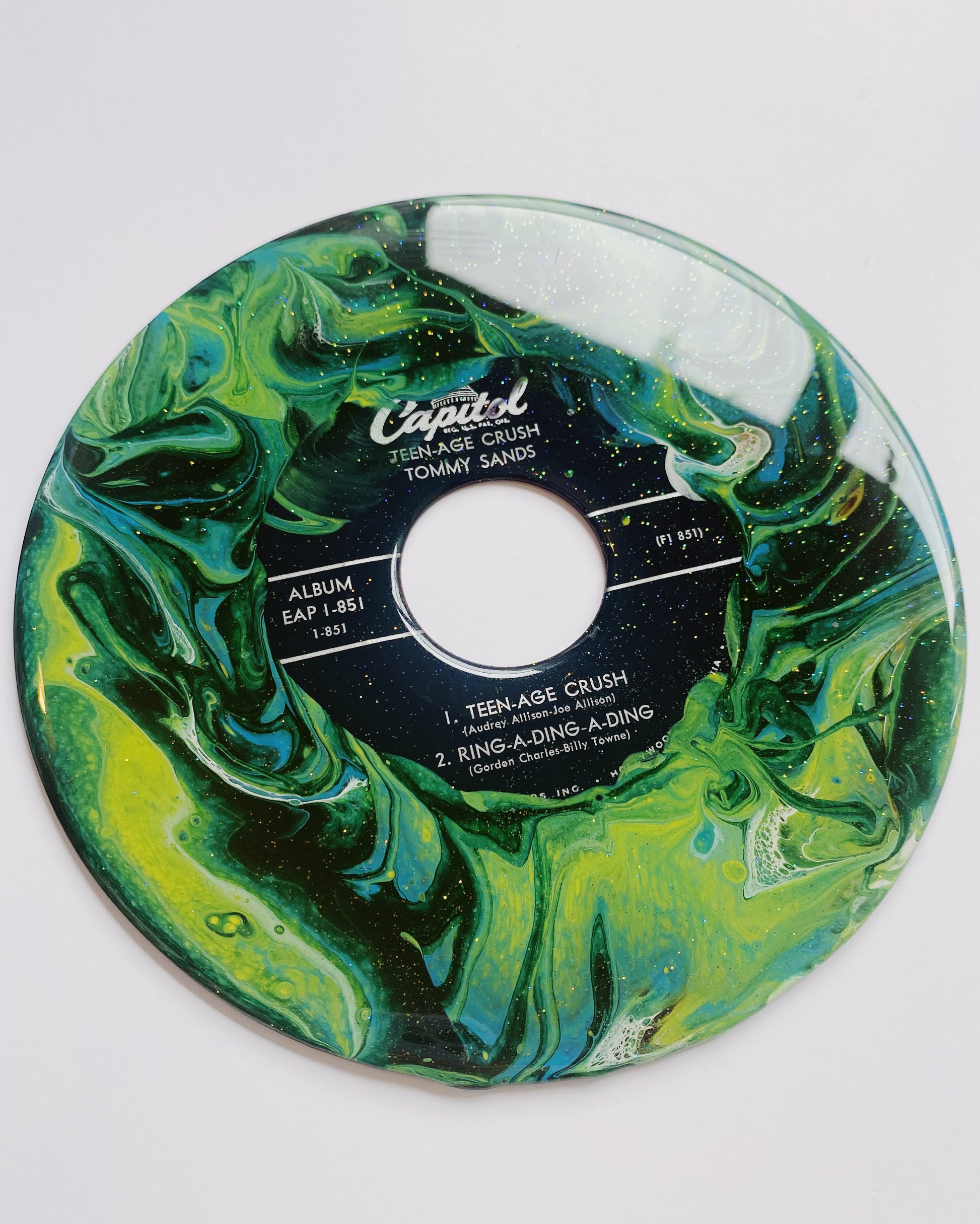 this unique piece is an acrylic pour painted upcycled vinyl record (a 45!) sealed in a shimmery resin. the mirror-like shine of the resin surface will keep this piece protected while also giving it a brilliant, glossy finish!