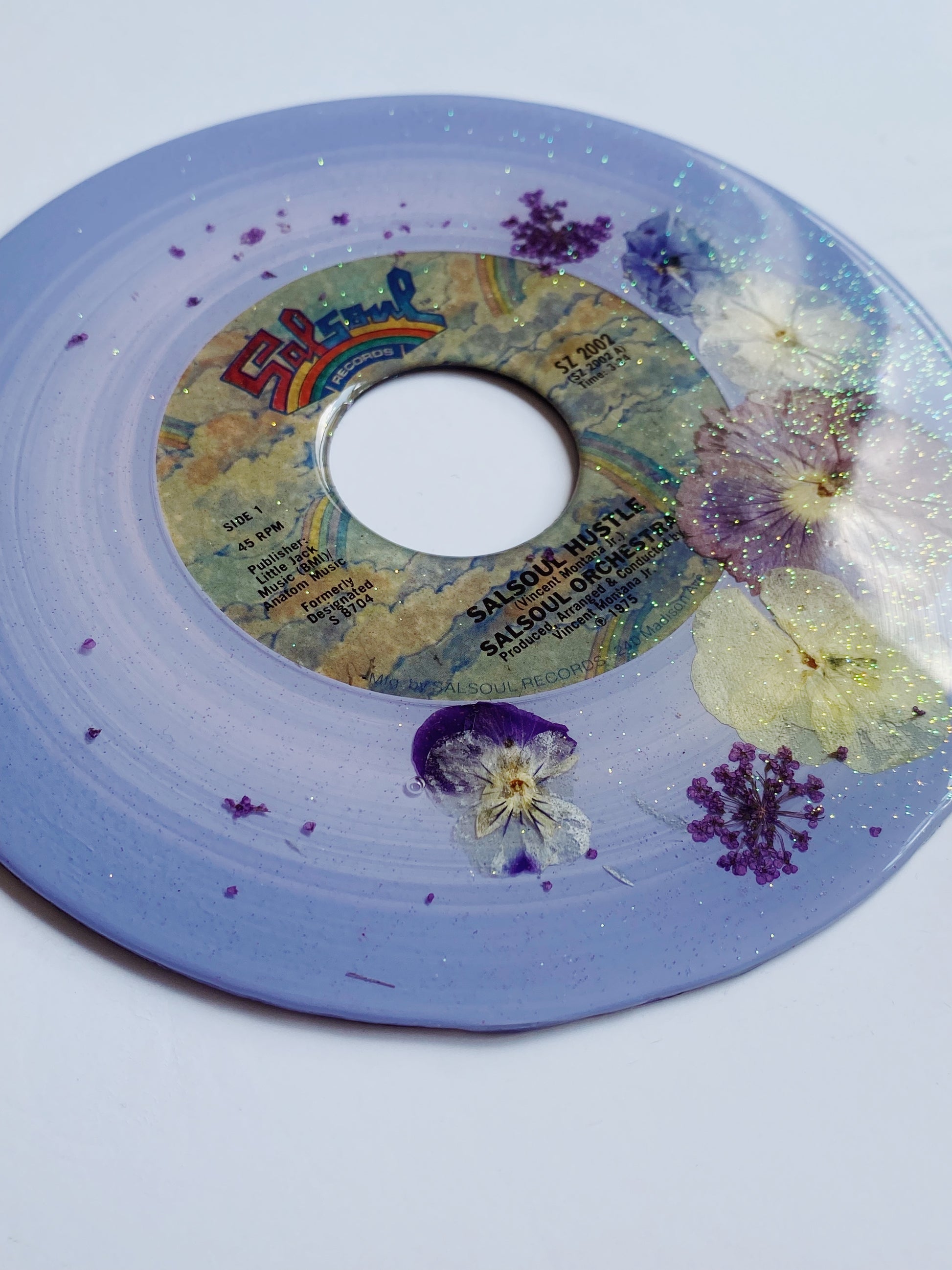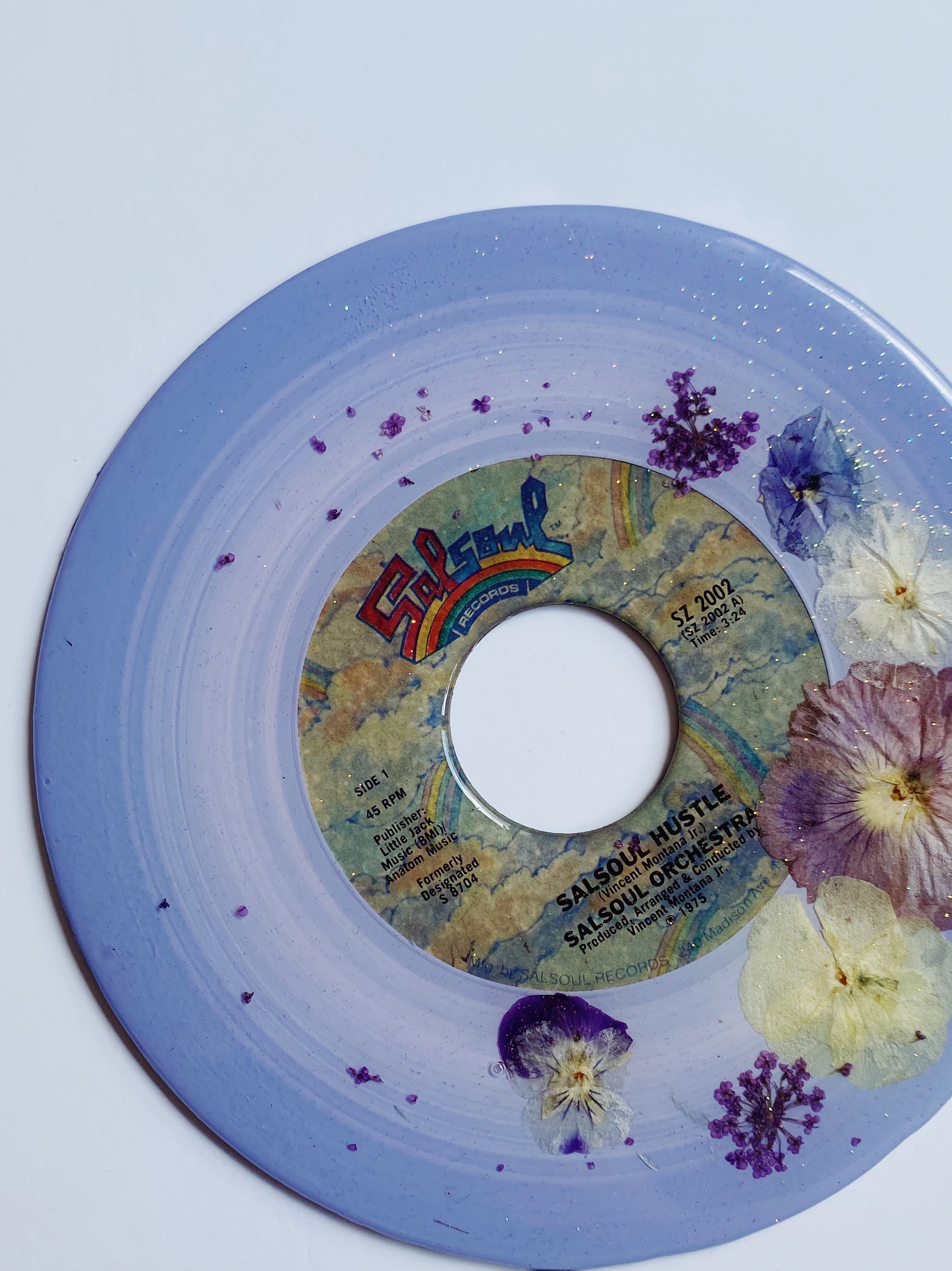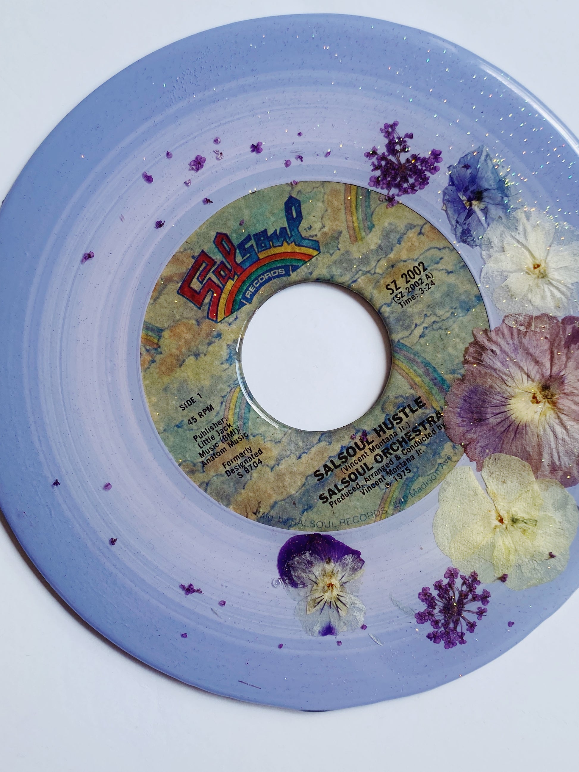 this unique piece is a painted upcycled vinyl record (a 45!) then decorated with real pressed flowers, and sealed in a shimmery resin. the mirror-like shine of the resin surface will keep this piece protected while also giving it a brilliant, glossy finish!
