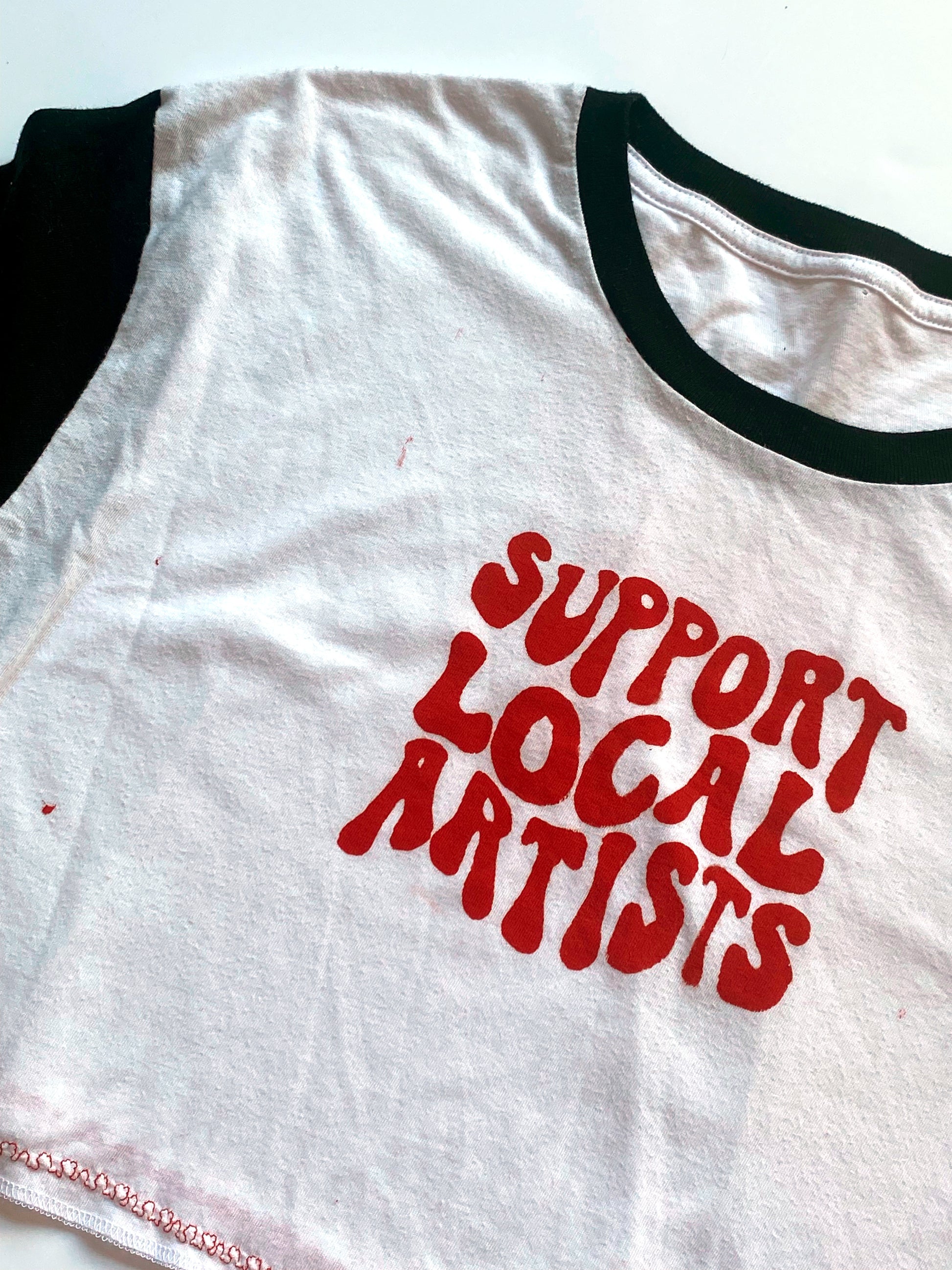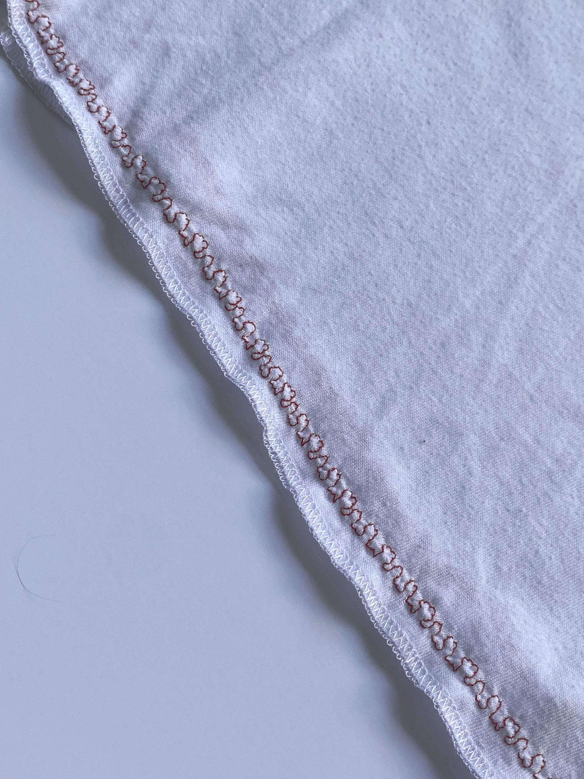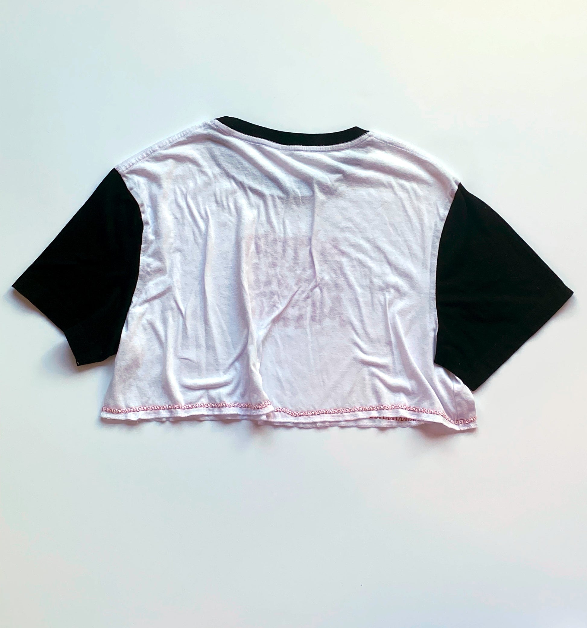 white ultra crop tee with black sleeves, size M. custom hem with an abstract zig zag stitch in red thread.
