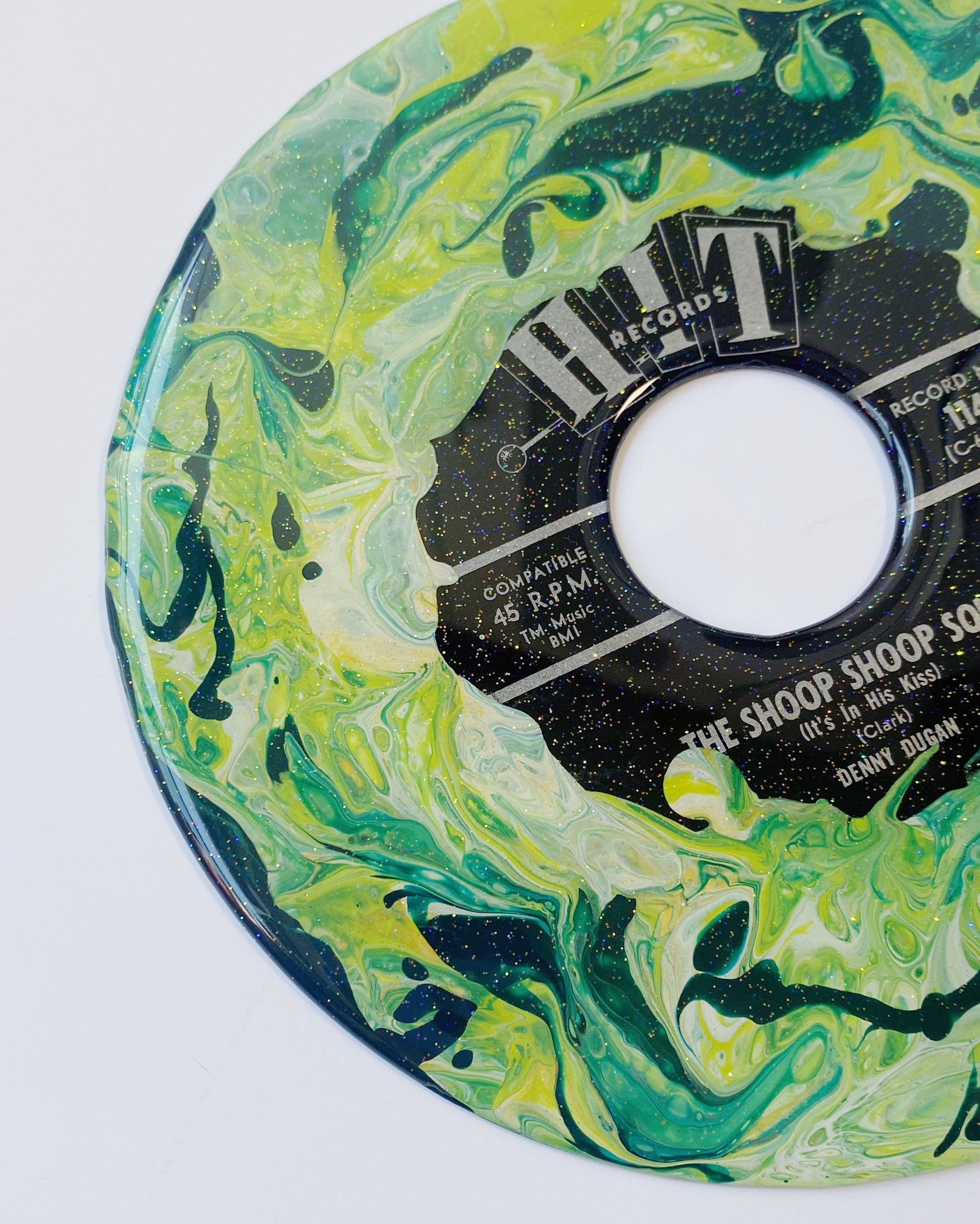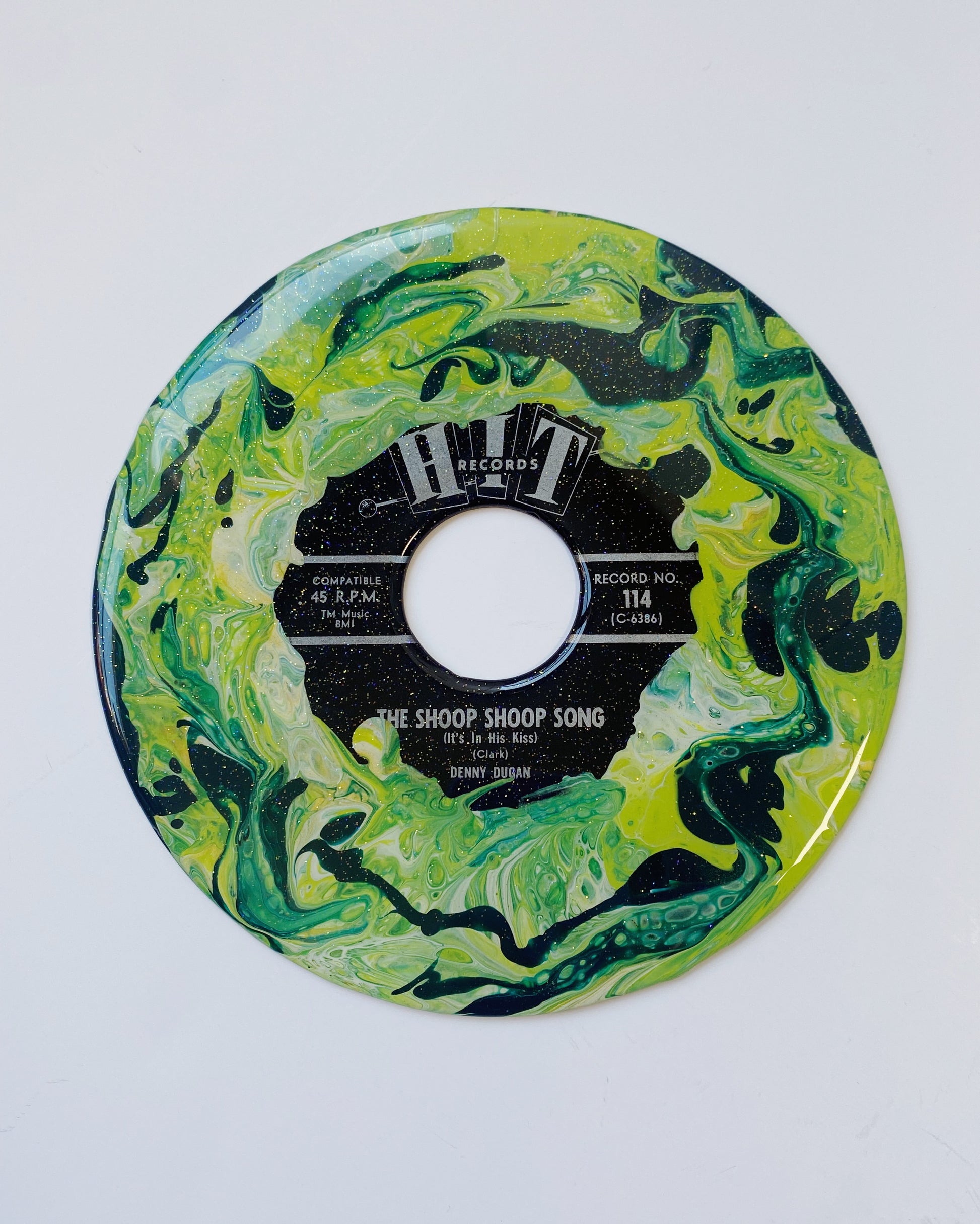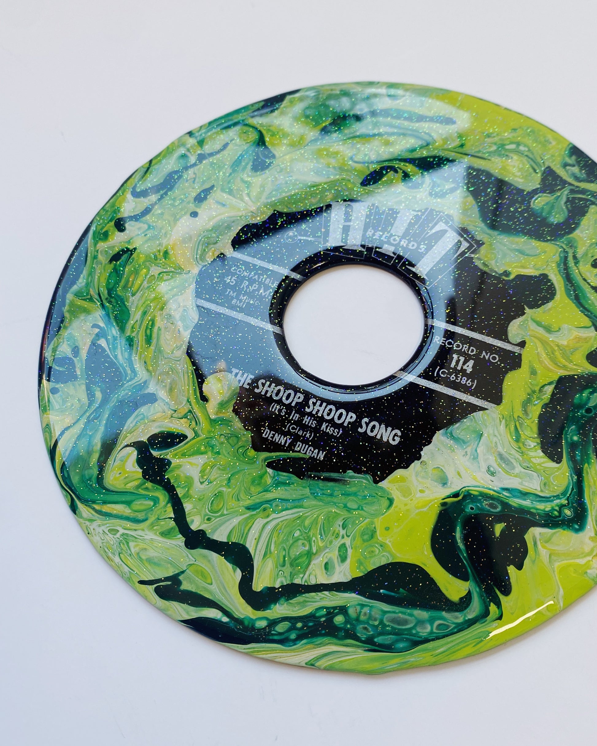 this unique piece is an acrylic pour painted upcycled vinyl record (a 45!) sealed in a shimmery resin. the mirror-like shine of the resin surface will keep this piece protected while also giving it a brilliant, glossy finish!