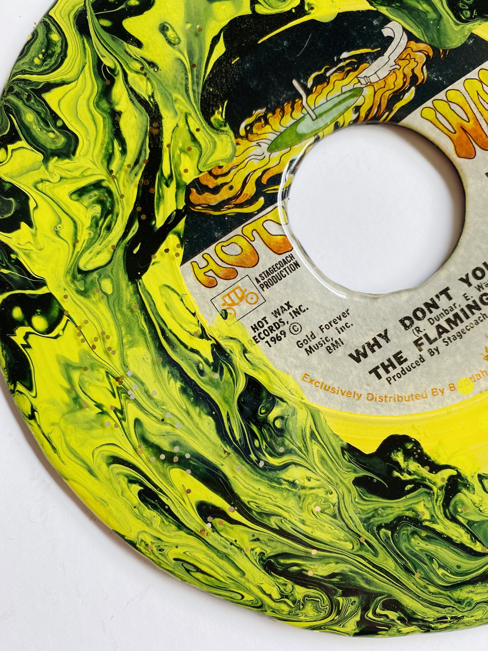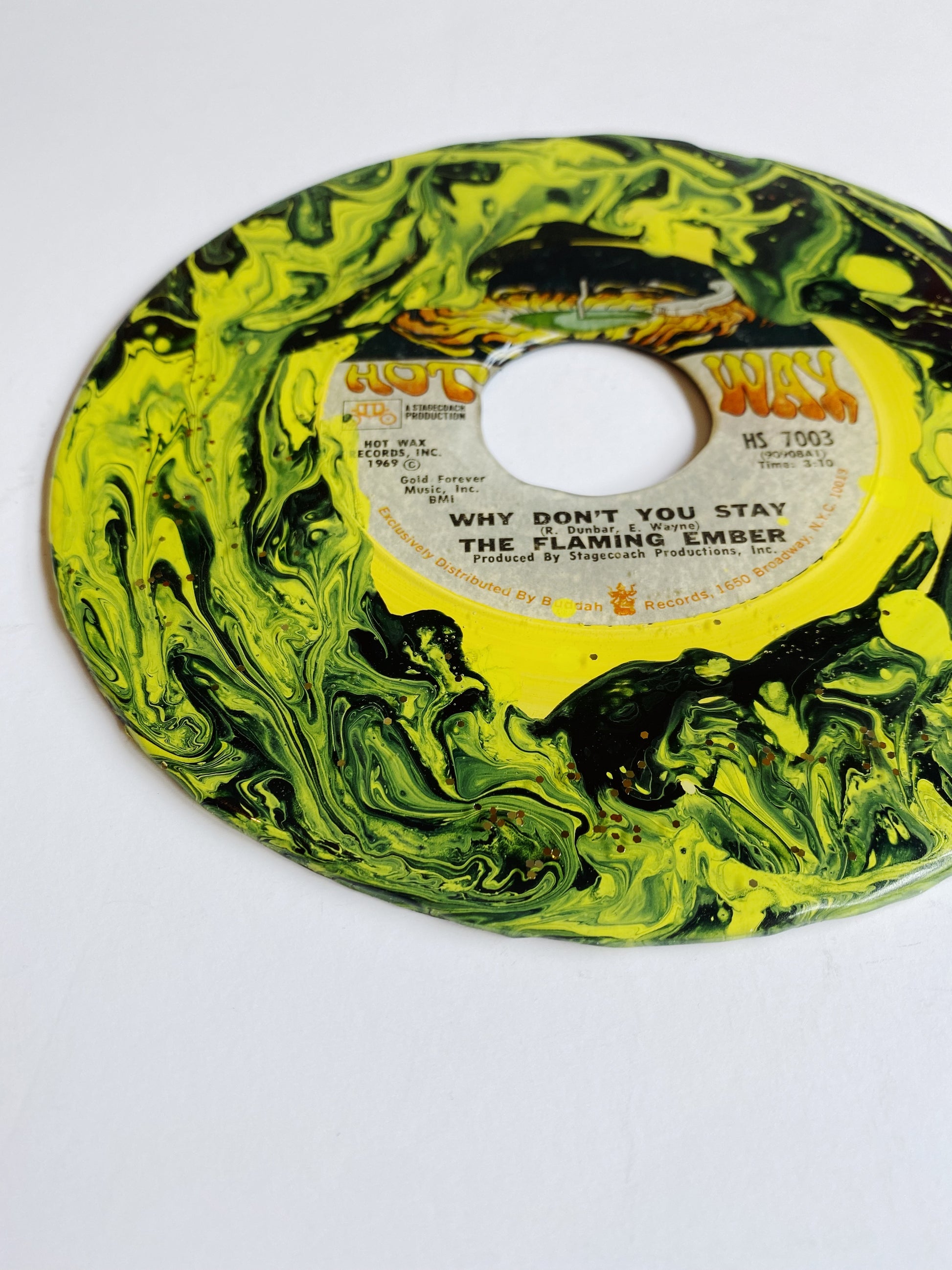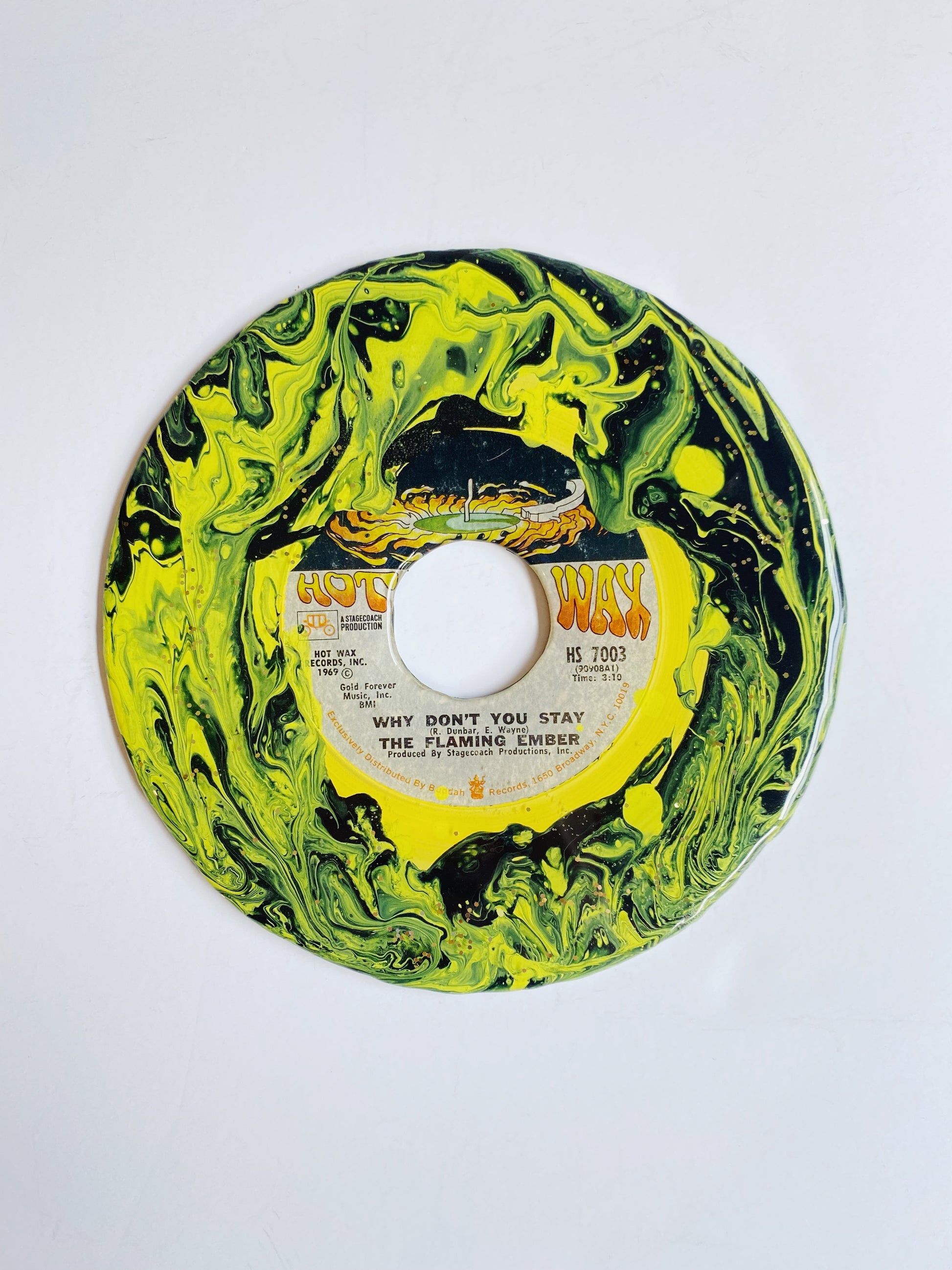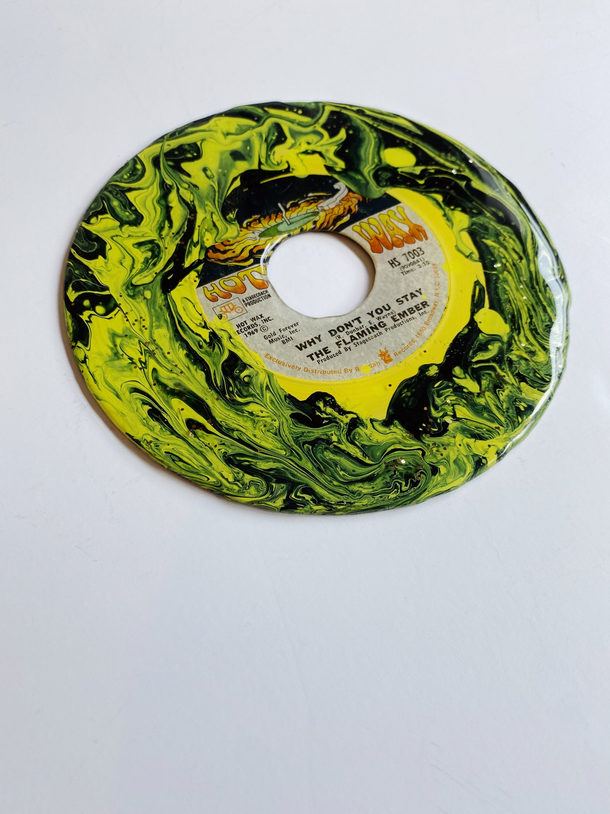 this unique piece is an upcycled vinyl record (a 45!) painted with an acrylic swirl design and sealed in a shimmery resin. the mirror-like shine of the resin surface will keep this piece protected while also giving it a brilliant, glossy finish!