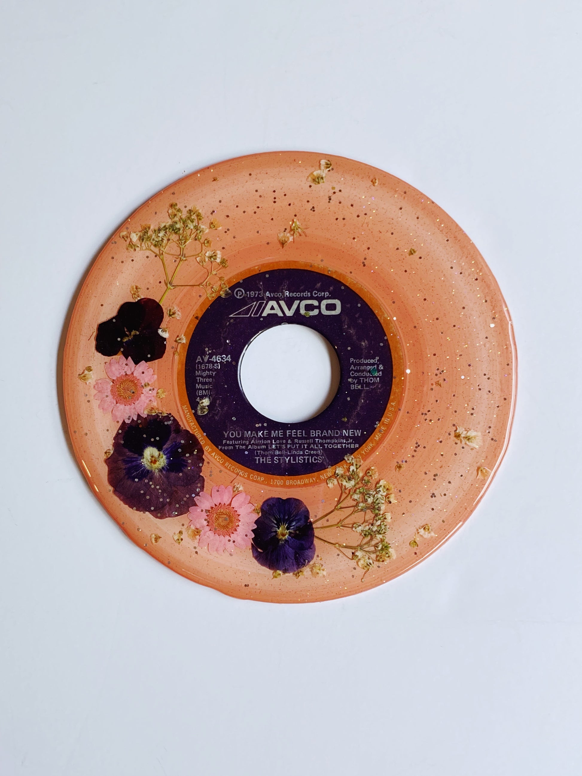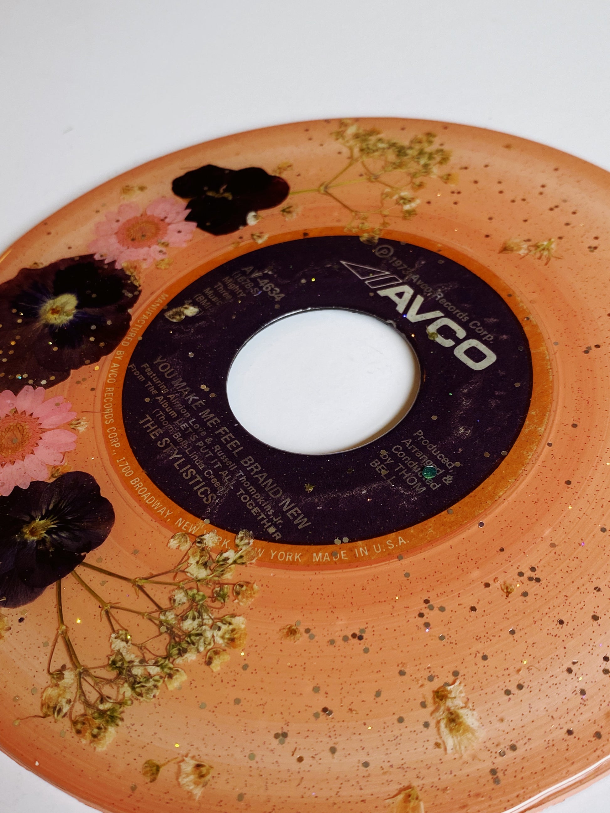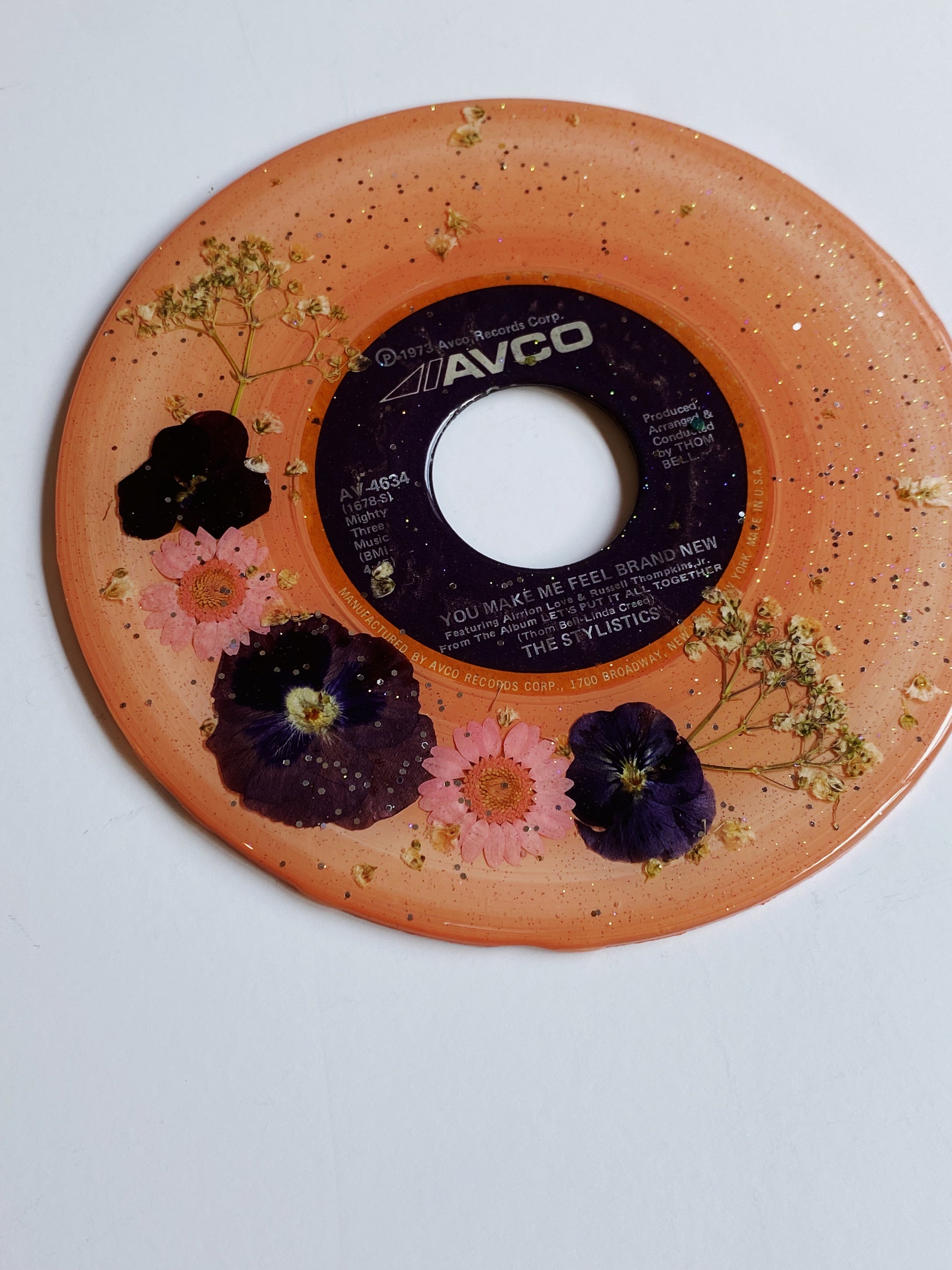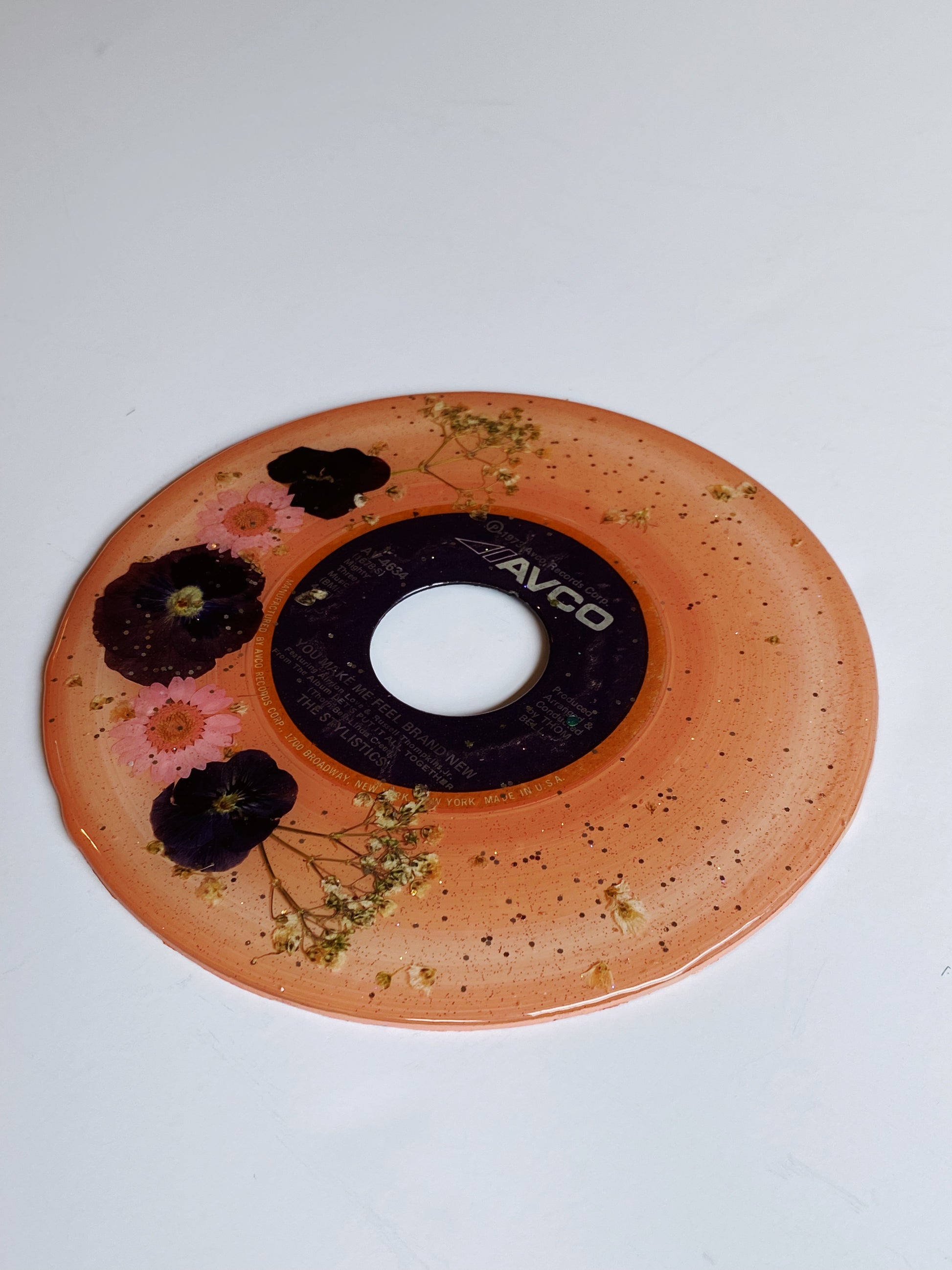 this unique piece is a painted upcycled vinyl record (a 45!) painted then decorated with real pressed flowers, and sealed in a shimmery resin. the mirror-like shine of the resin surface will keep this piece protected while also giving it a brilliant, glossy finish!