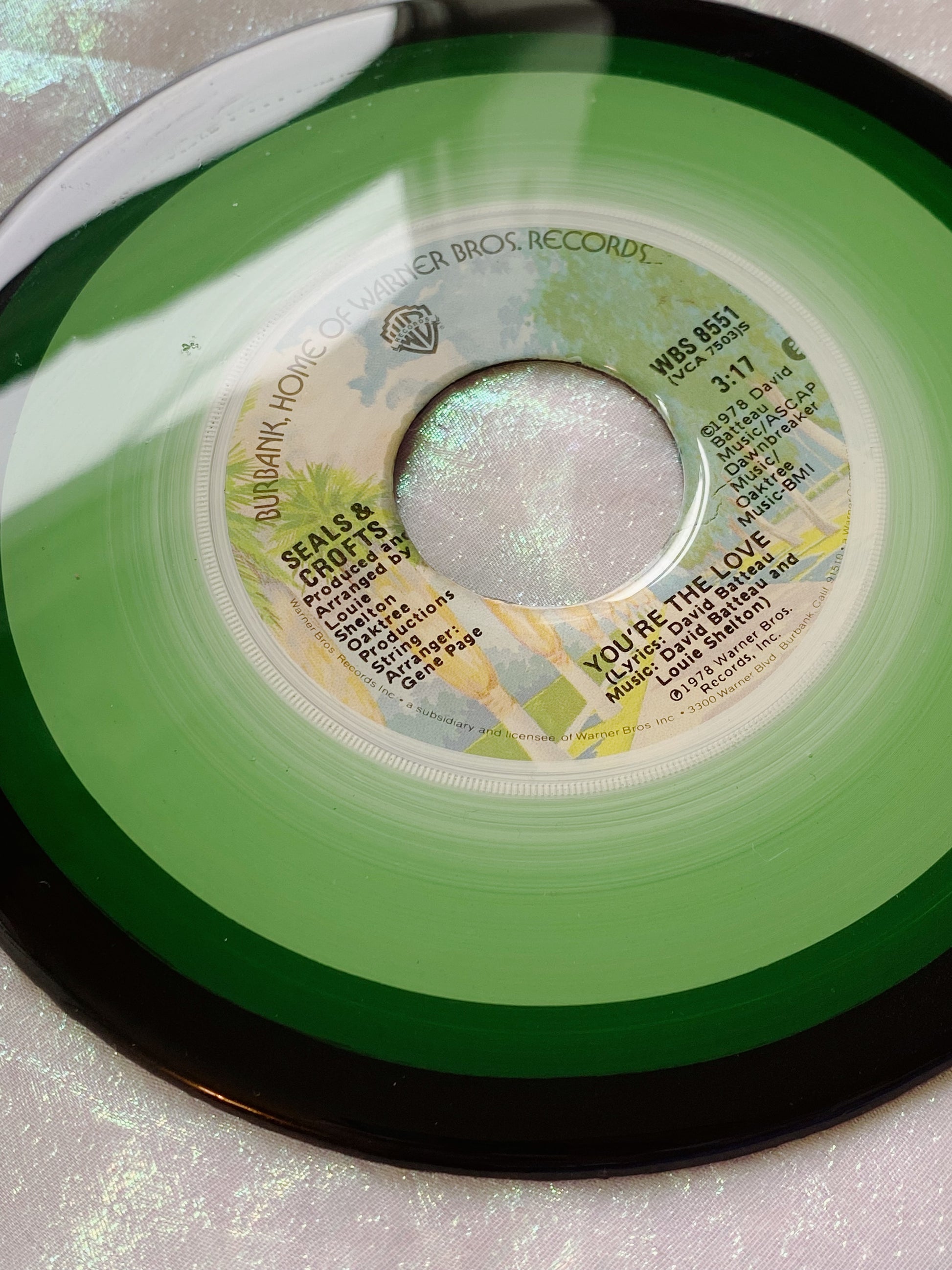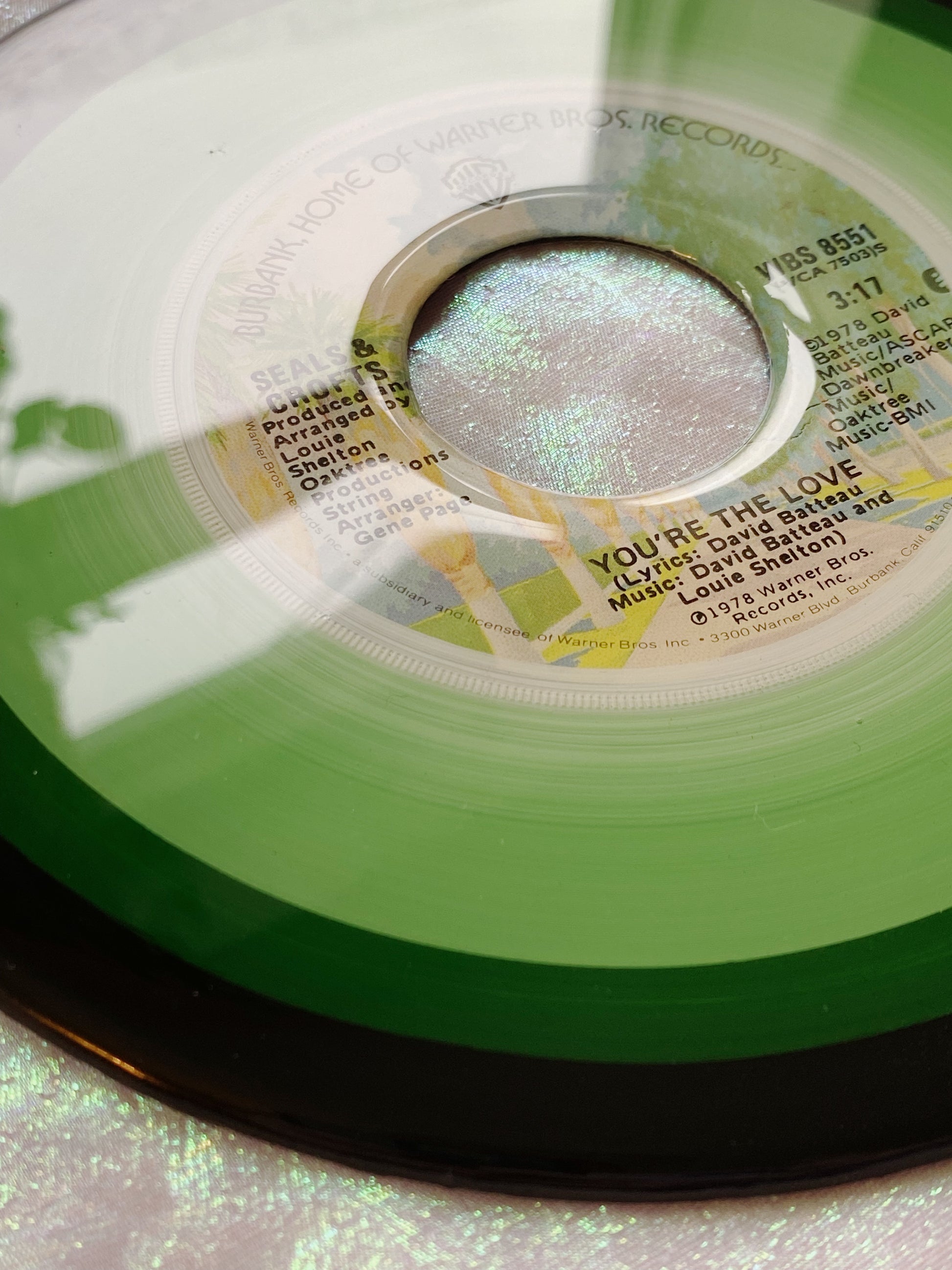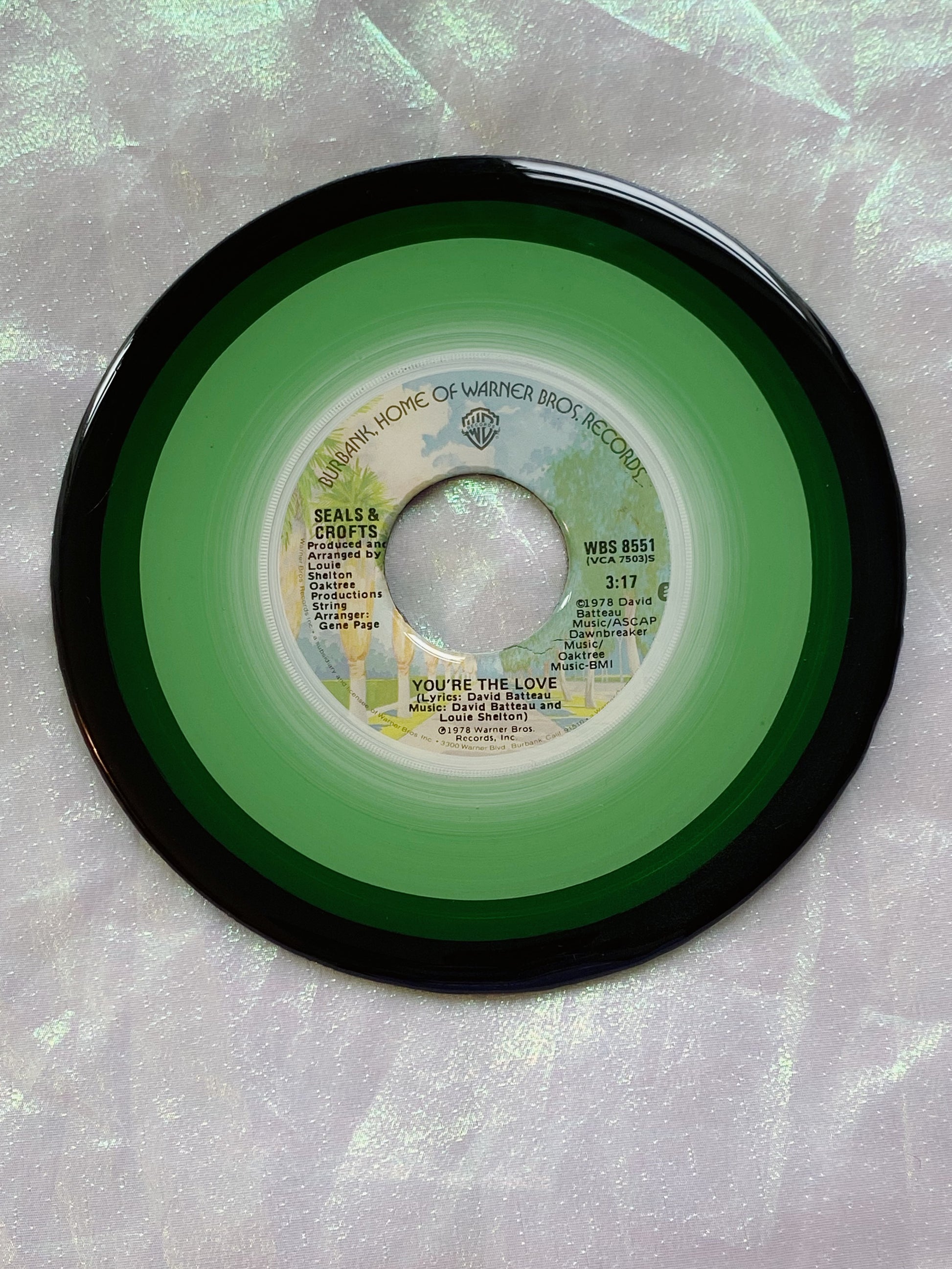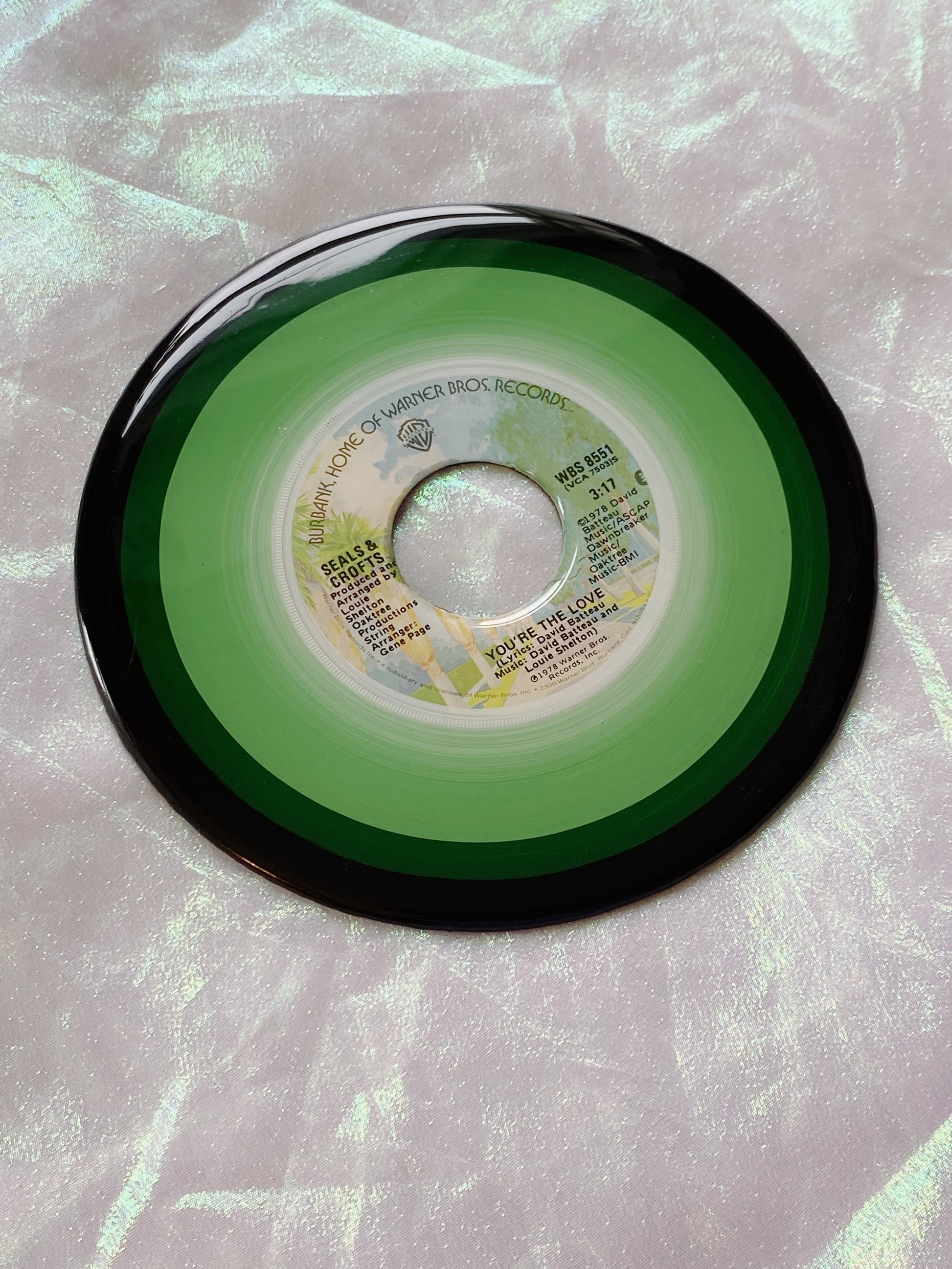 this unique piece is a painted upcycled vinyl record (a 45!). the shine of the resin surface will keep this piece protected while also giving it a brilliant, glossy finish!